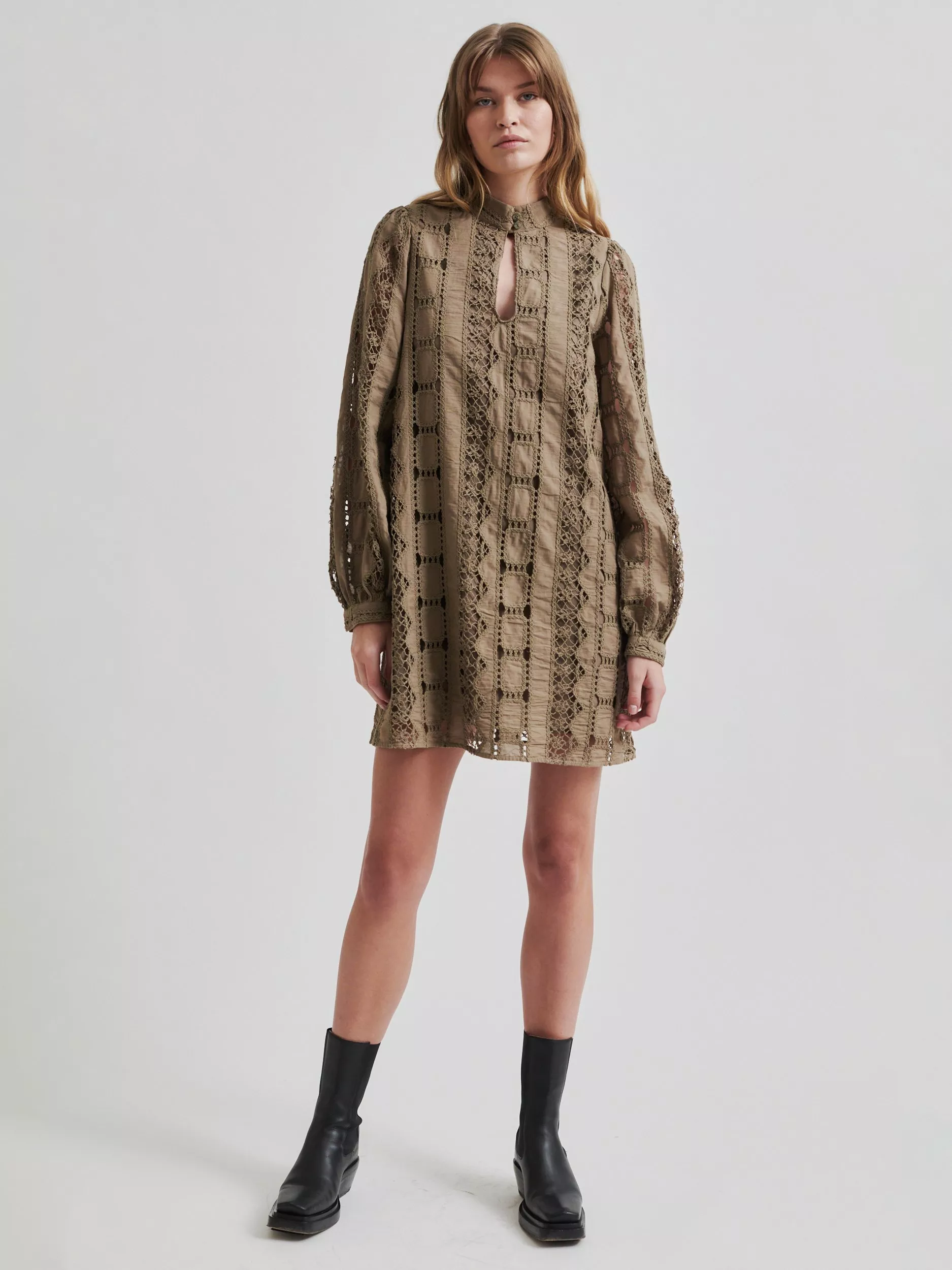 The dress is made in light and smooth cotton with crochet appearance. Featuring a keyhole opening at the front with a button and loop fastening at the top of the neck. Puffed shoulders with long sleeves and cuffs with button fastening. Loose, straight fit.