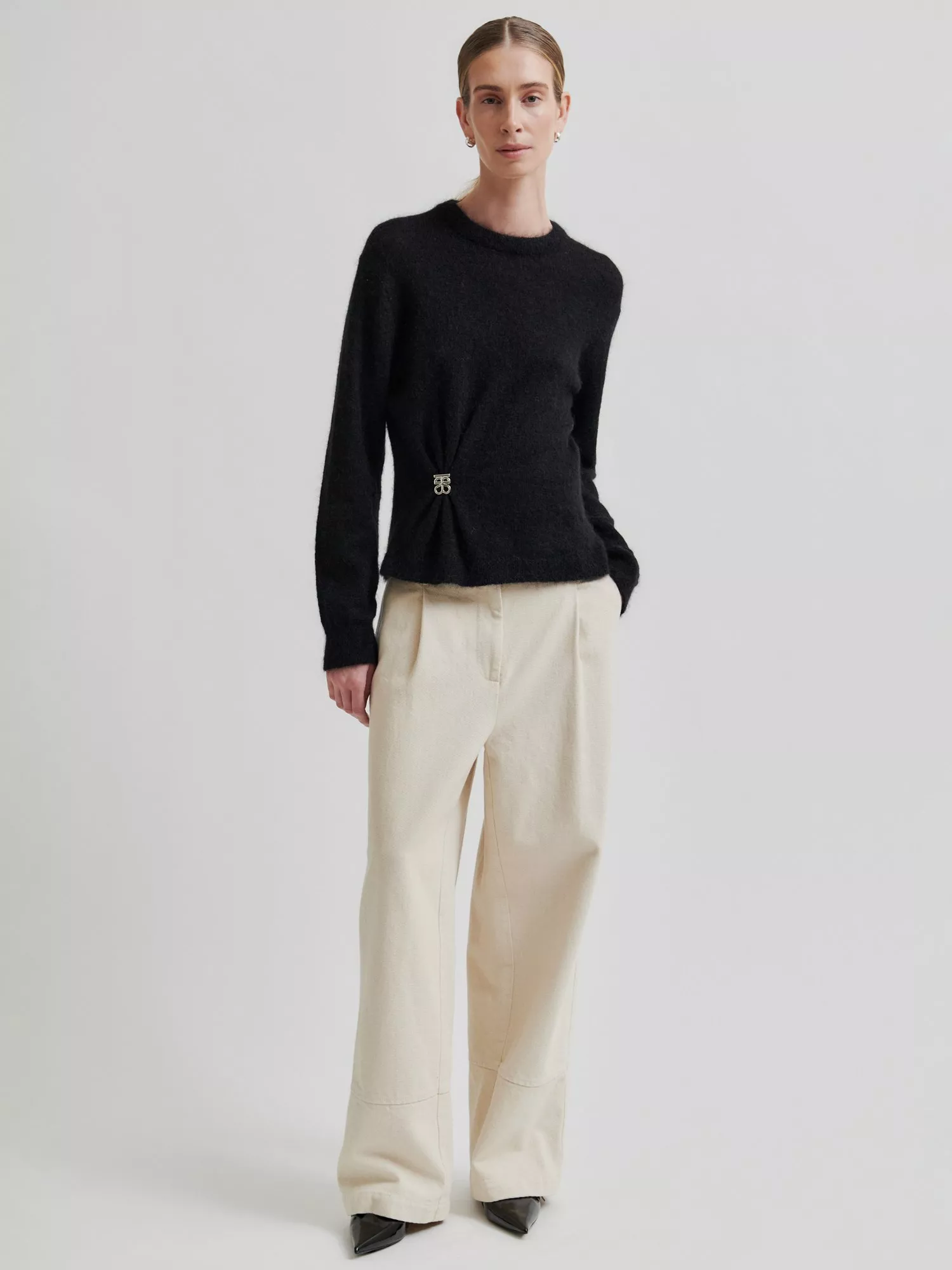 Second Female baggy trousers. The trousers are made in thick cotton with slight texture. Featuring a concealed button, hook and zip fastening. Belt loops and pleats at waist. Two concealed pockets in side seams and single patch pocket at the back. Wide bottom hem with deep slits. Mid waist with baggy leg.