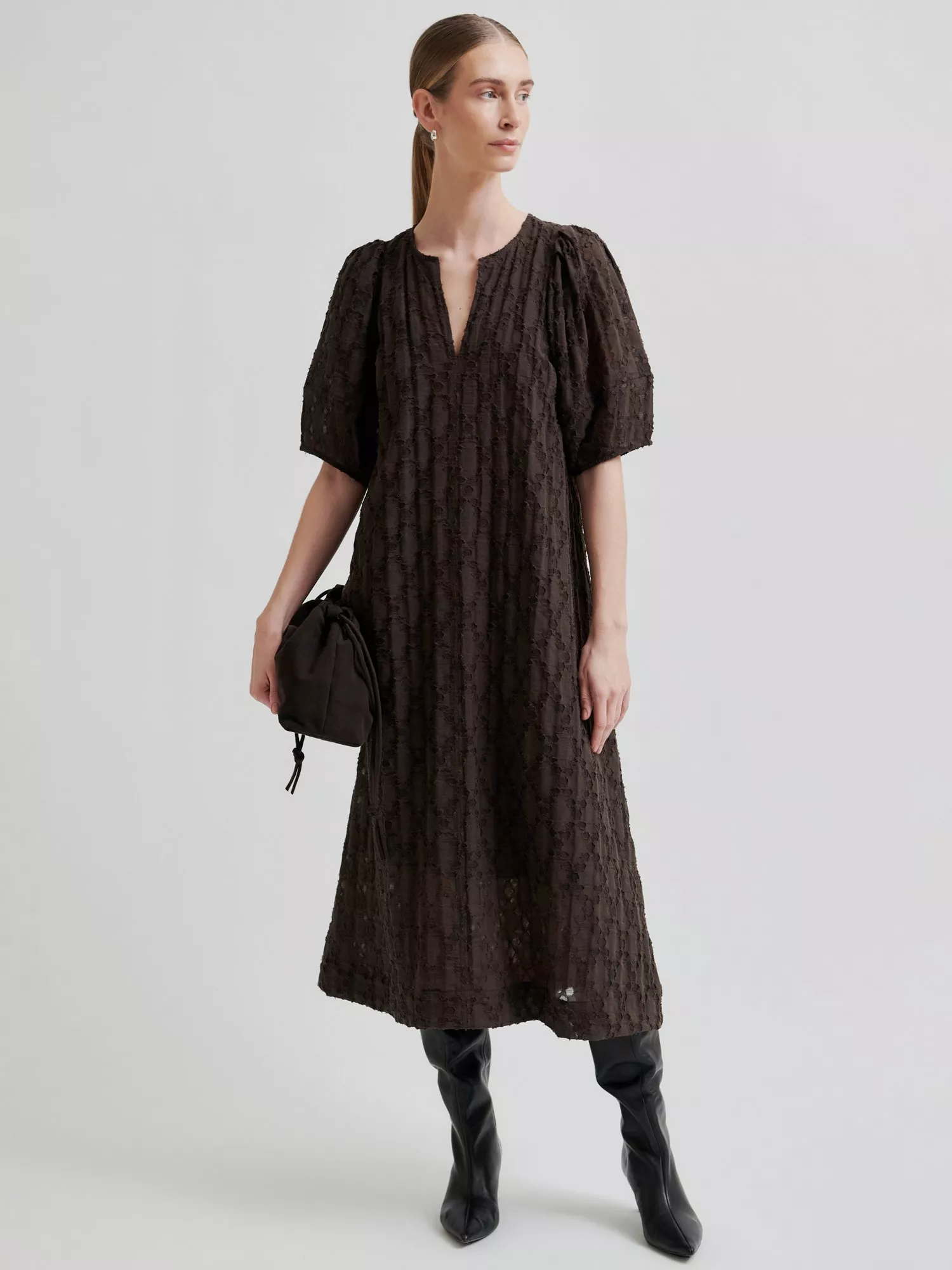 Second Female short-sleeved burnout dress. The dress is made in a viscose blend with structured pattern with semi-sheer burnout effect. Featuring a V-neckline and square shoulder seams with short puffed sleeves. Detachable slip with adjustable straps. Slim fit at the top with A-line silhouette.