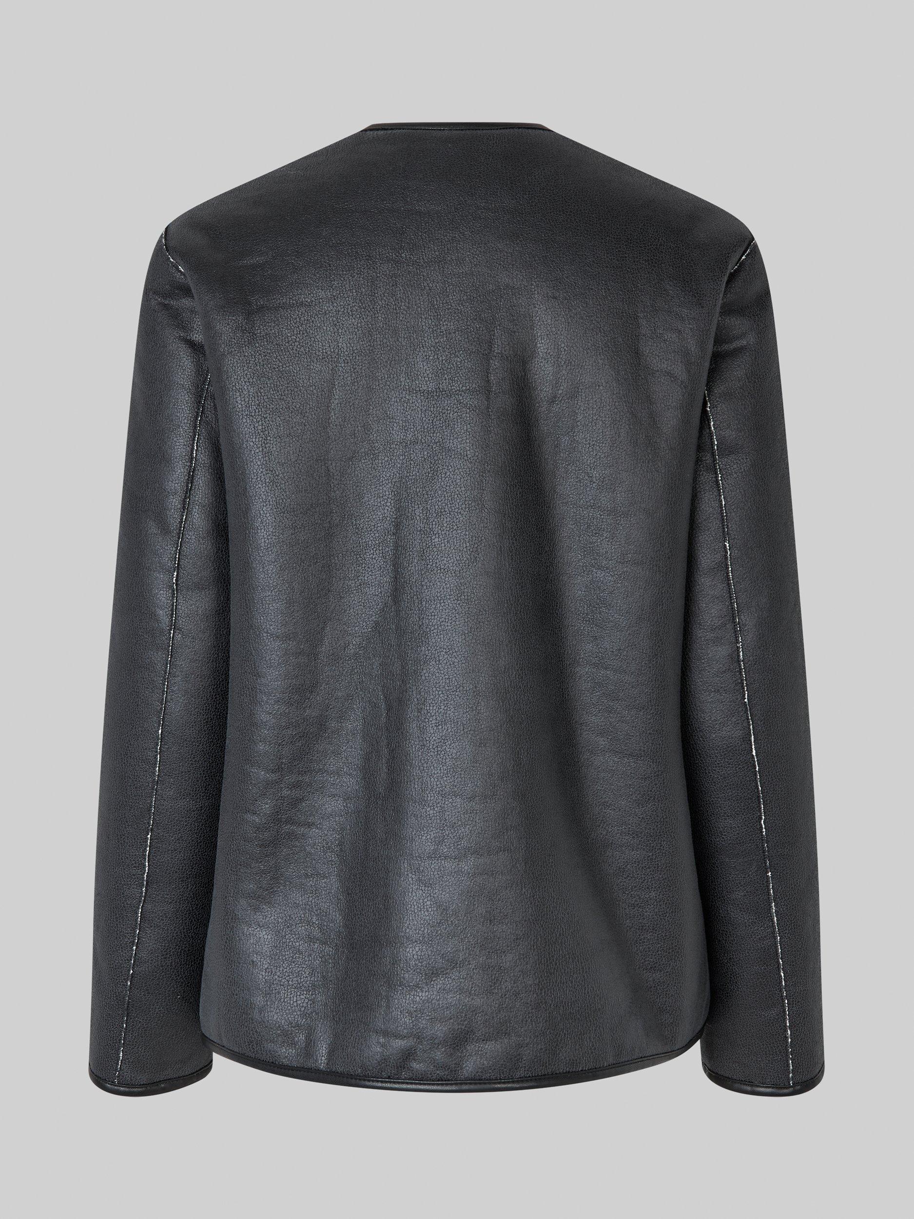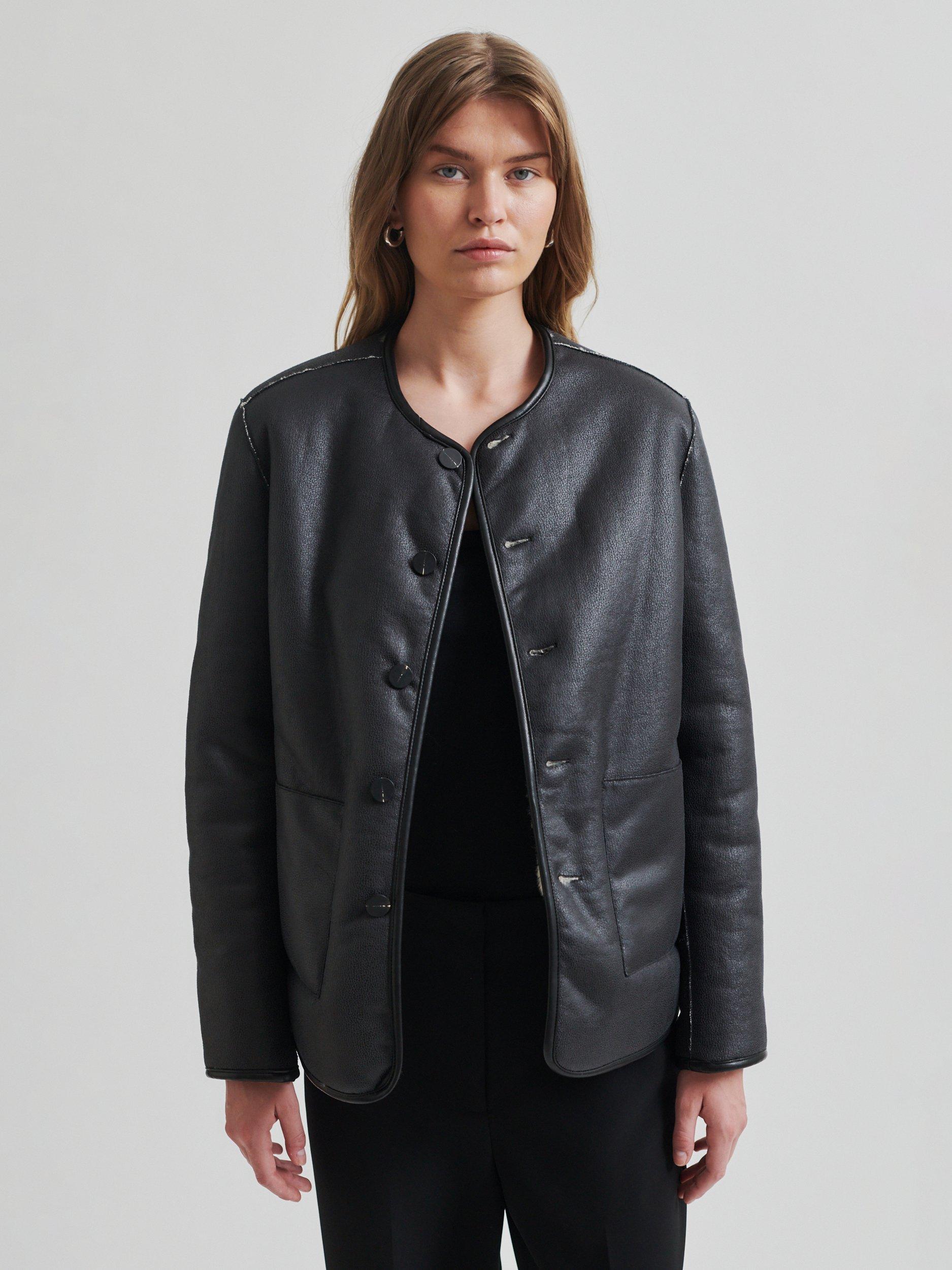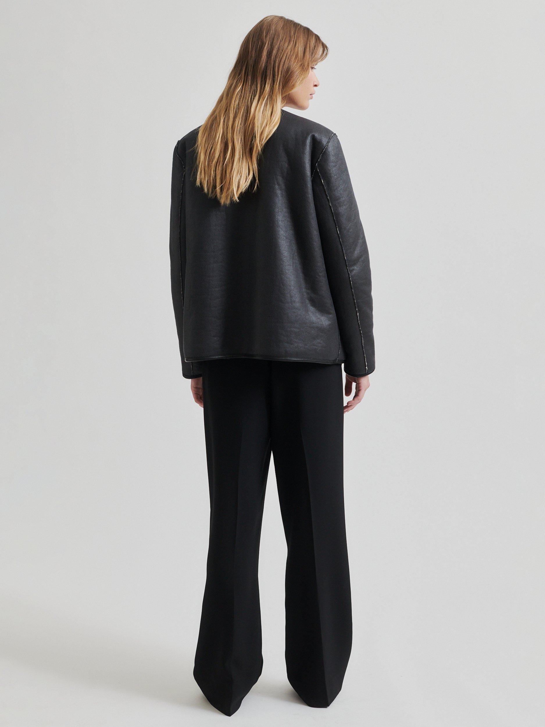 The jacket is made in faux leather with soft, shearling texture on the other side. Featuring a three-button fastening and two patch pockets. No shoulder seam and long sleeves. Straight, regular fit.