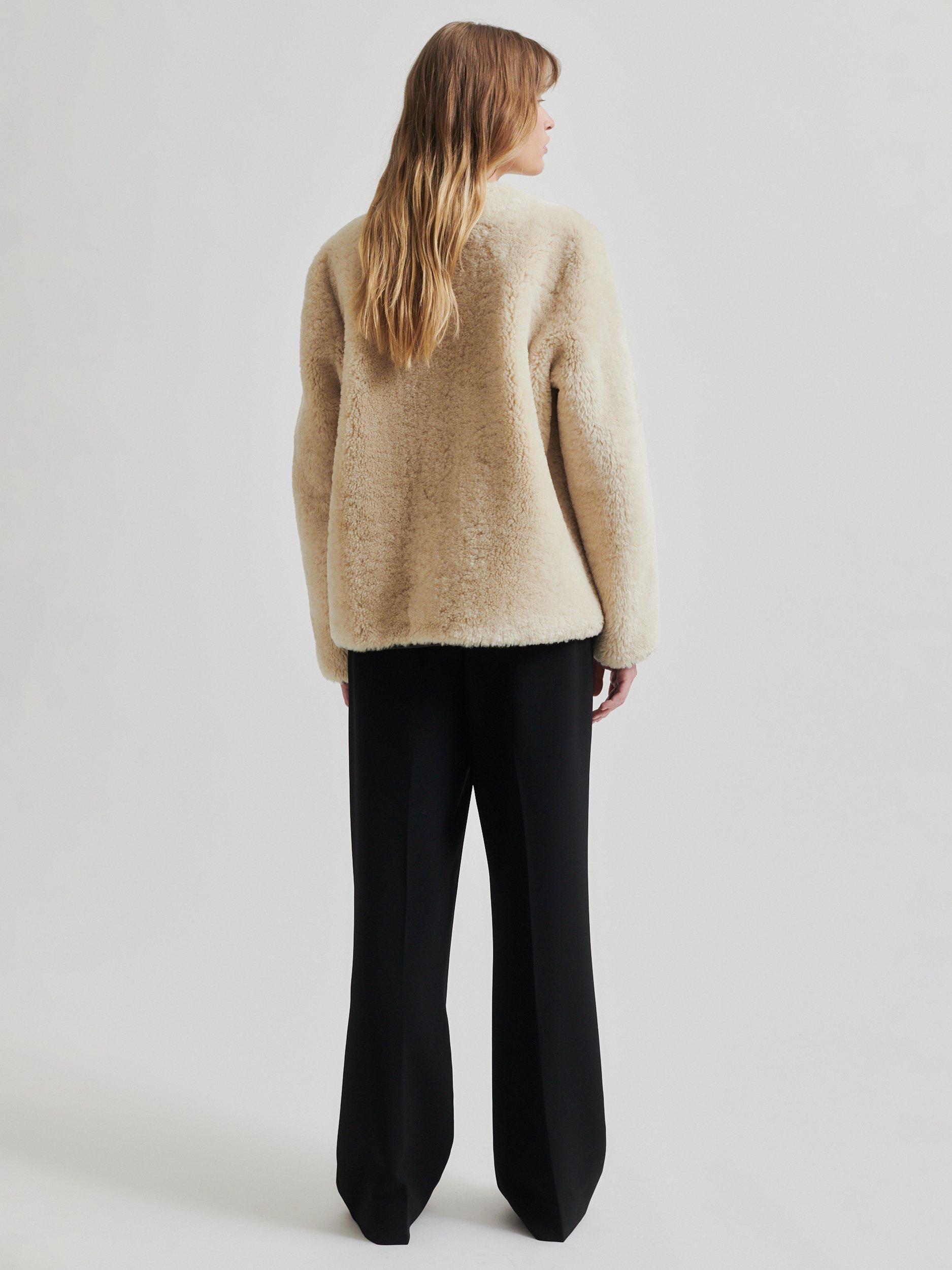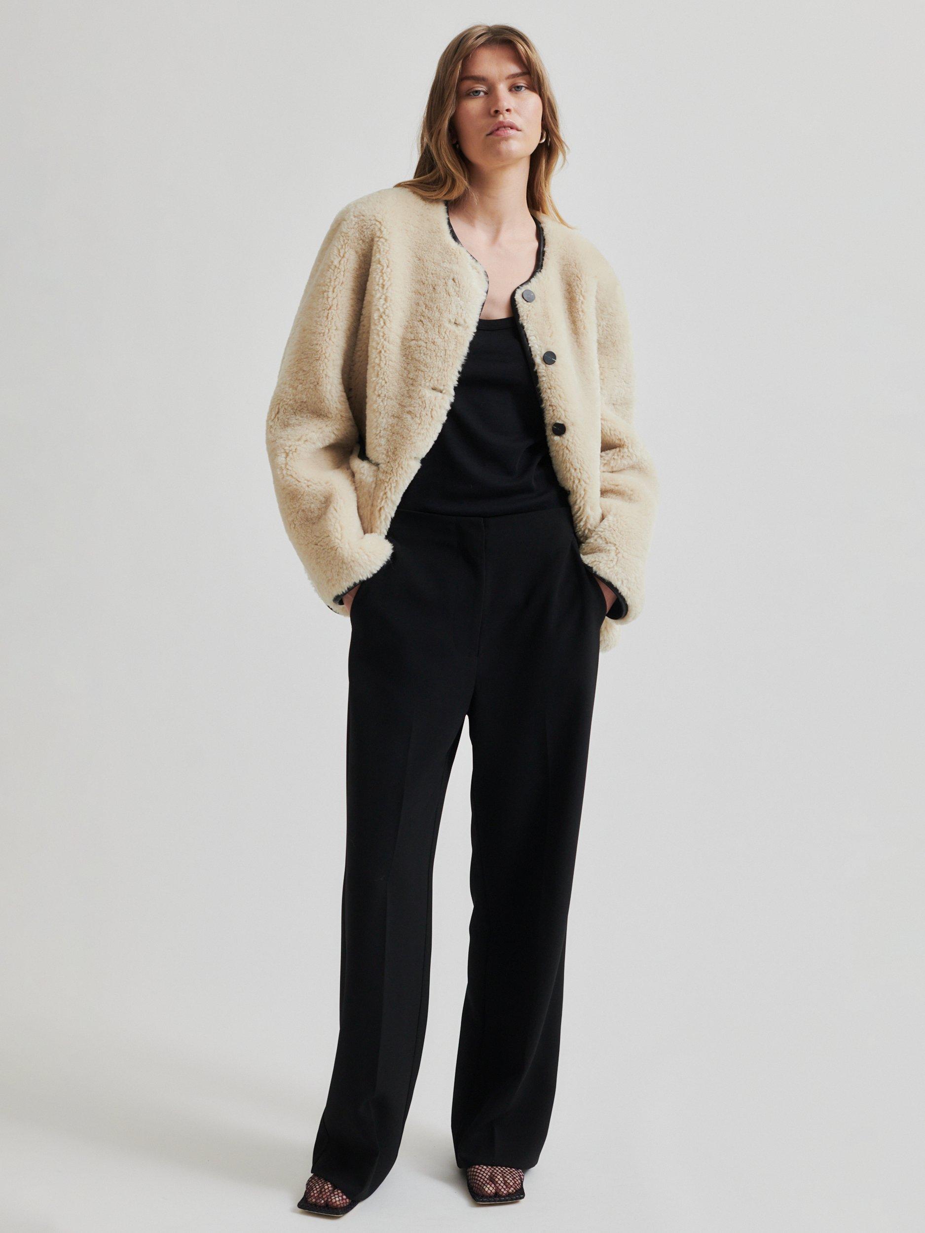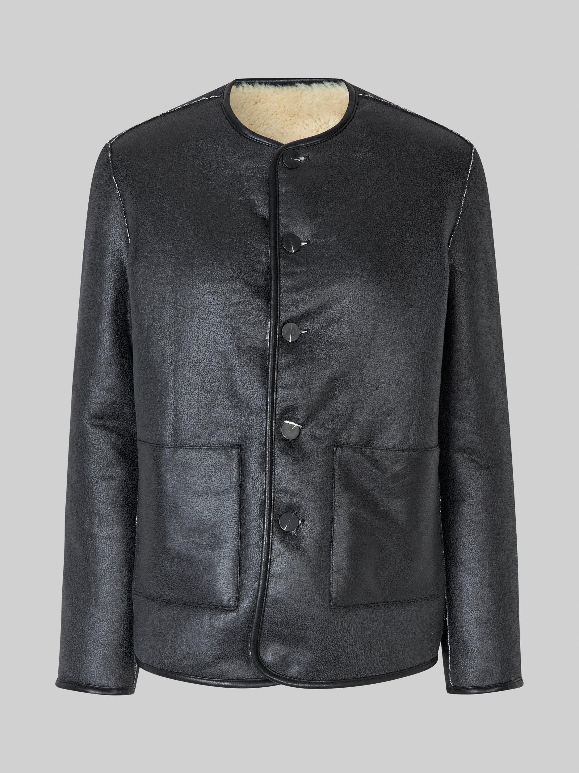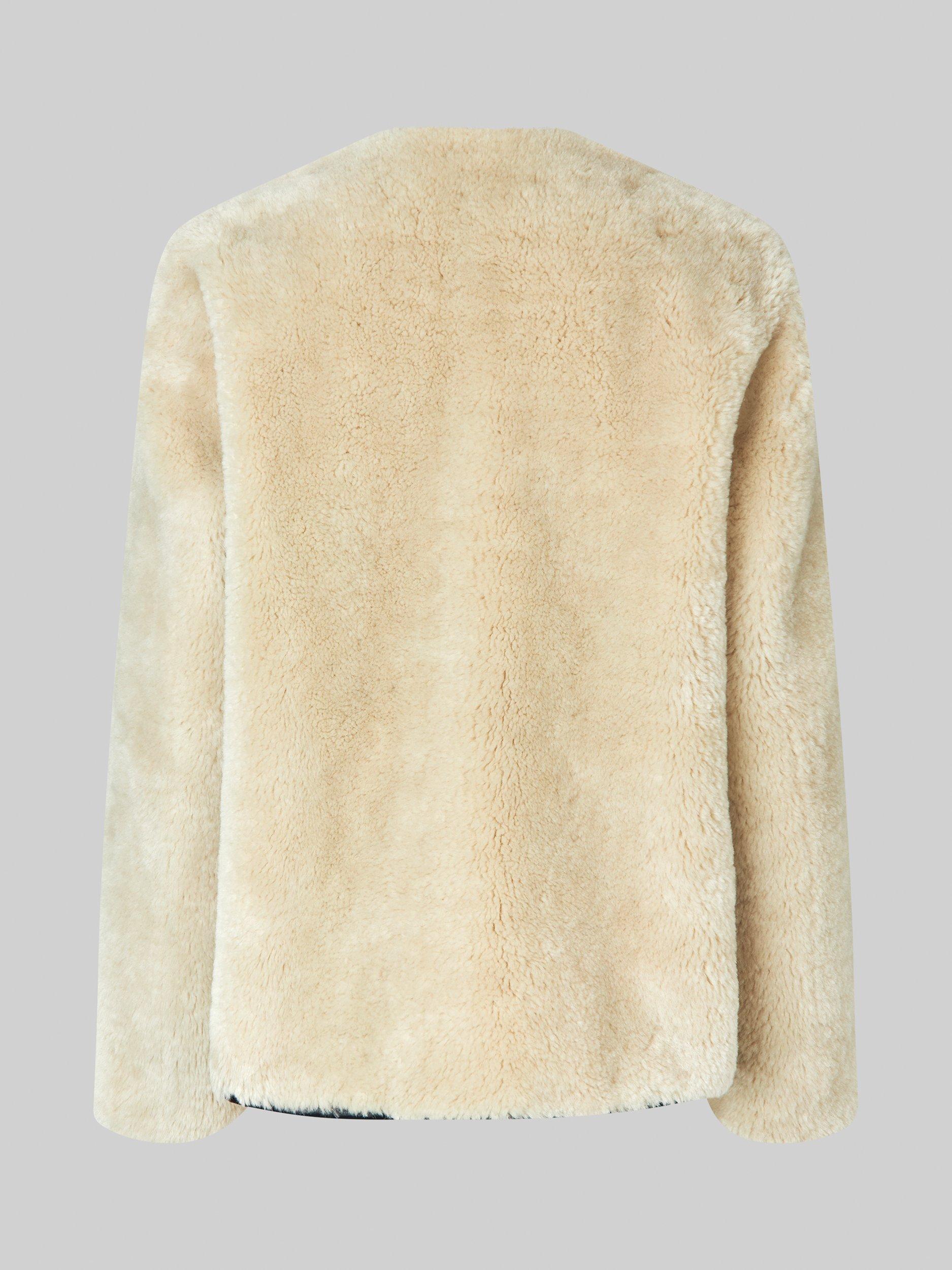 The jacket is made in faux leather with soft, shearling texture on the other side. Featuring a three-button fastening and two patch pockets. No shoulder seam and long sleeves. Straight, regular fit.