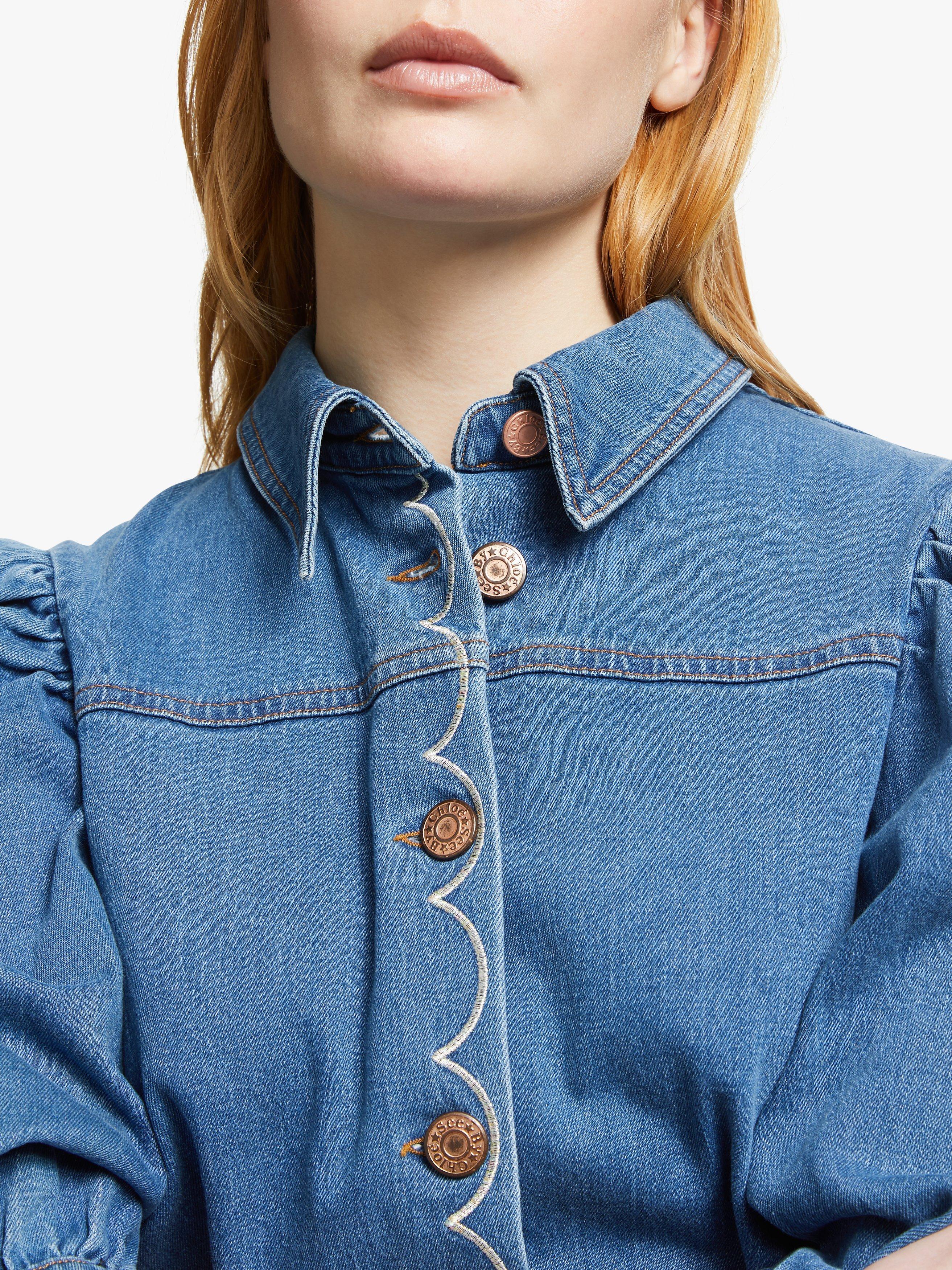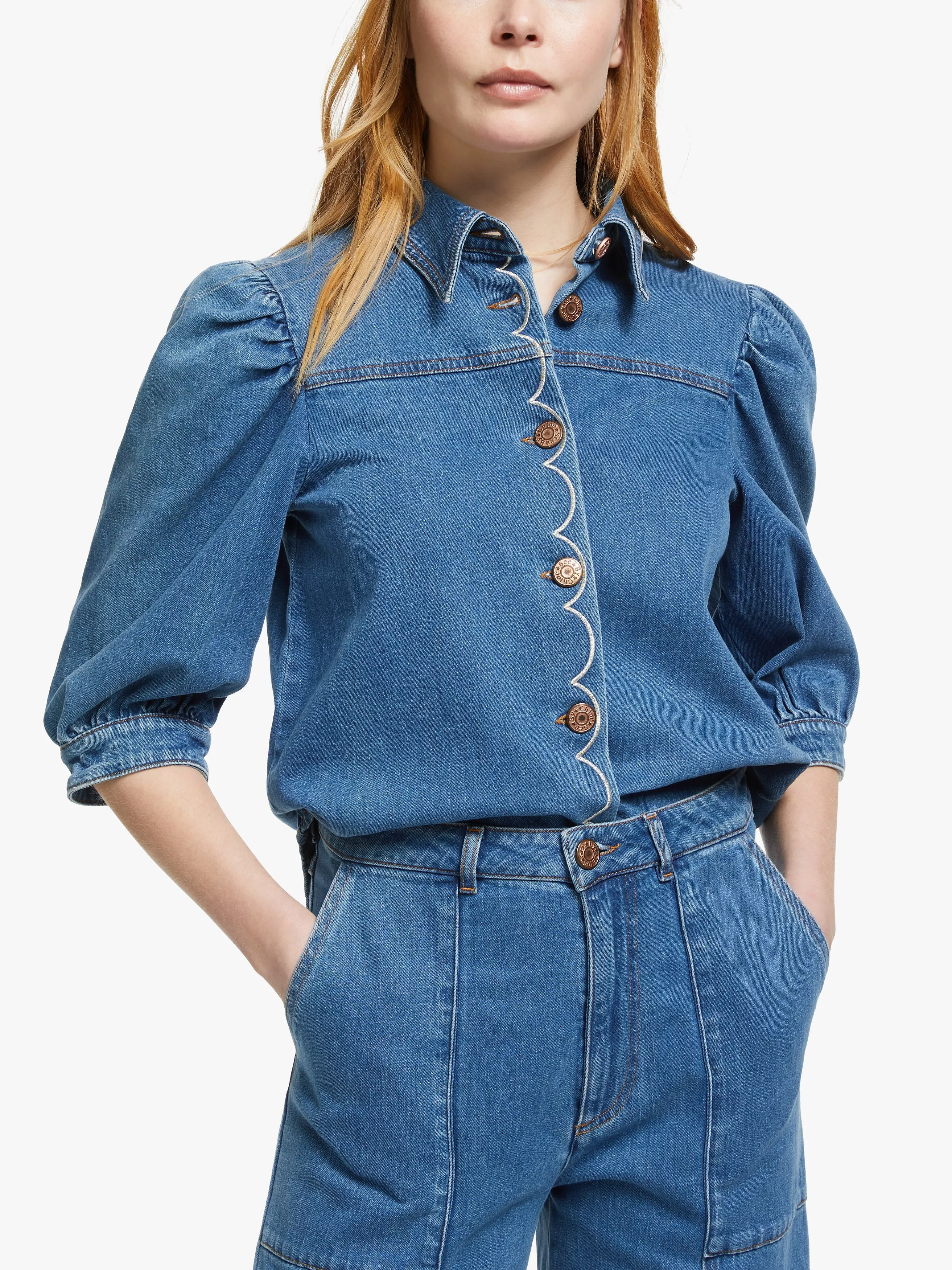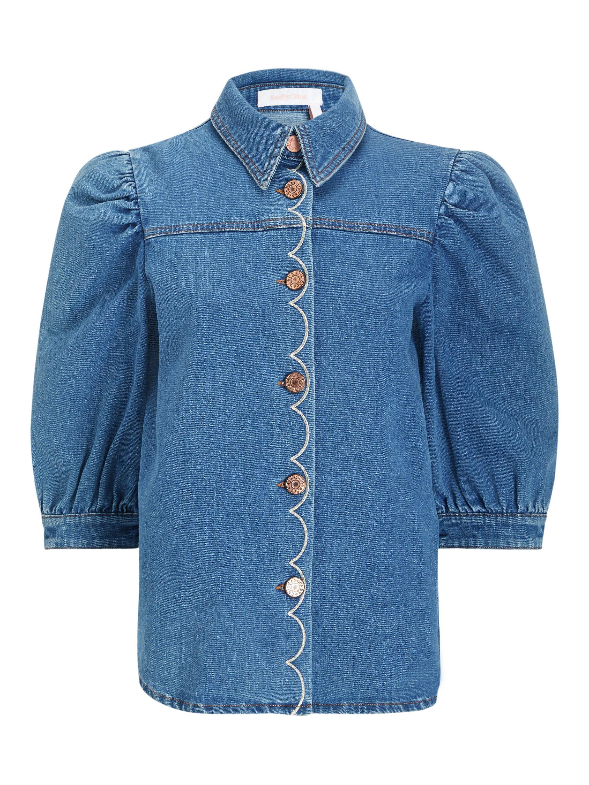 A reworking of the denim shirt, See By Chloé lends their playful and feminine touches to this effortless piece. It's gently fitted with puff sleeves that gather into cuffs for a pretty blouson shape and has a button through front, topped with contrast scalloped embroidery. Go for double denim and tuck into a high-waisted cropped pair of jeans.