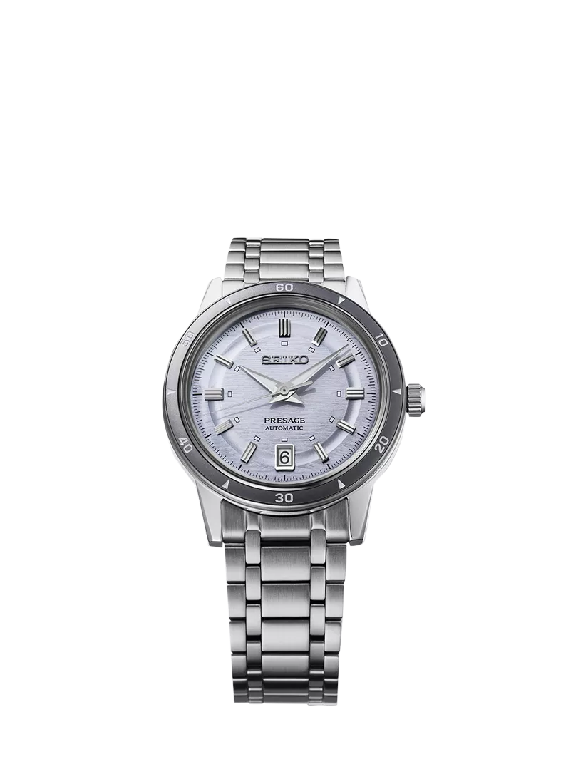 The classic Style 60s case design is inspired by the Seiko Crown Chronograph from 1964, the first chronograph made in Japan, crafted especially for the Tokyo Olympics when Seiko first became official timekeepers. Accompanying the aluminium bezel is an silvery violet dial that features a raised circle effect for a futuristic style loved in the 1960s. It is paired with a bracelet strap, with a rich texture which enhances the vintage appeal. It is powered by an in-house built 4R35 automatic calibre, accurate to +45 / -35 seconds per day with a 40-hour power reserve.