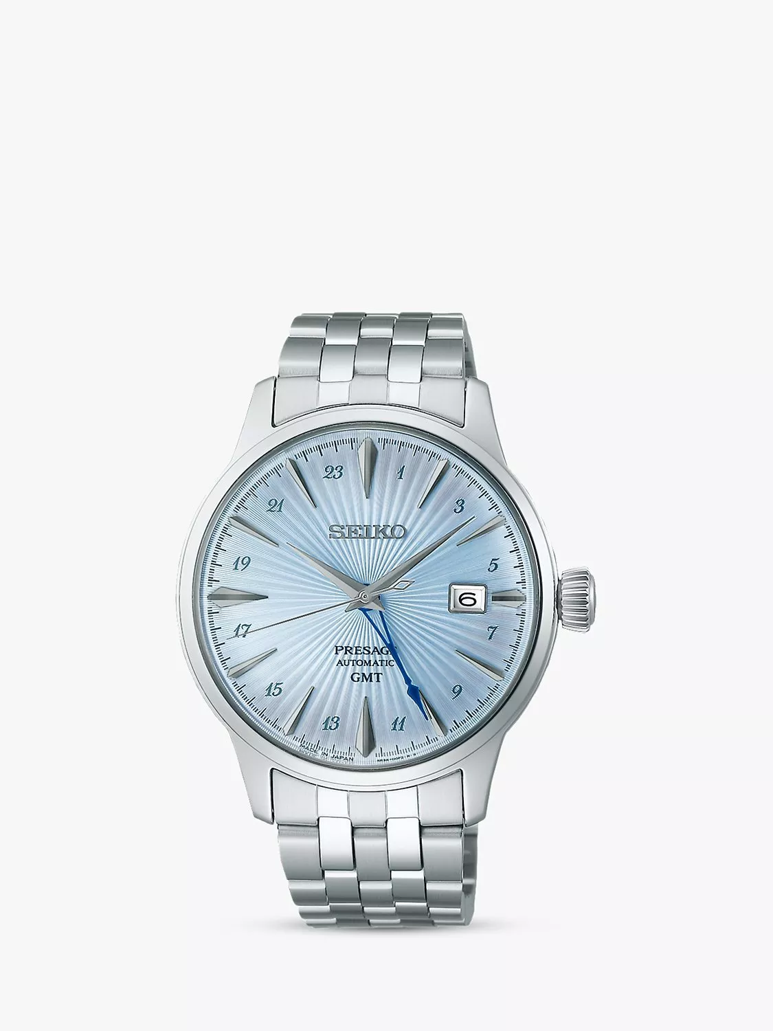 The dial of the light blue 'Skydiving' dress watch with its sunray reflections is designed to resemble the view through a cocktail glass. The GMT hand is inspired by the stem of a cocktail glass, whilst the second hand signifies a cocktail stirrer with its elegant handle. In tandem with the Arabic numerals at each index, this timepiece tracks two timezones simultaneously. With razor-sharp markers and Dauphine-style hands, this piece has a date feature at 3 o'clock, for added practicality. It is accompanied by a five-link bracelet, for added light refraction and comfort. It is powered by an in-house 4R34 GMT calibre, with a 41 hour power reserve.Seiko Presage: Timeless looks, precise mechanical timekeeping. Minimalistic watch designs with a distinctly Japanese aesthetic.