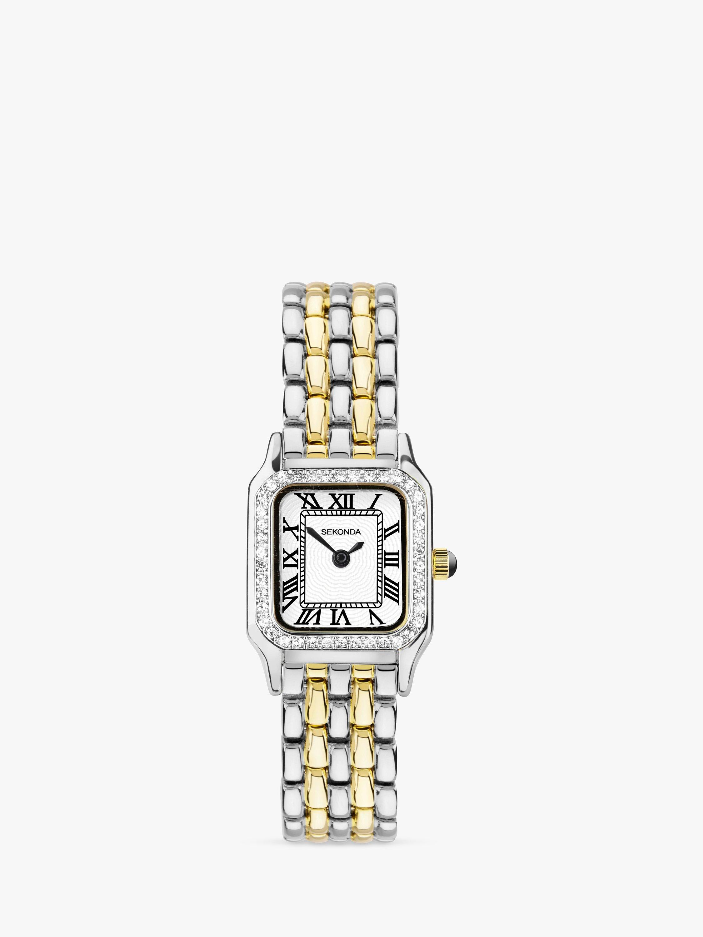 This watch features a rectangular ion-plated alloy case, with a stone set bezel set with 48 stones and a white dial.