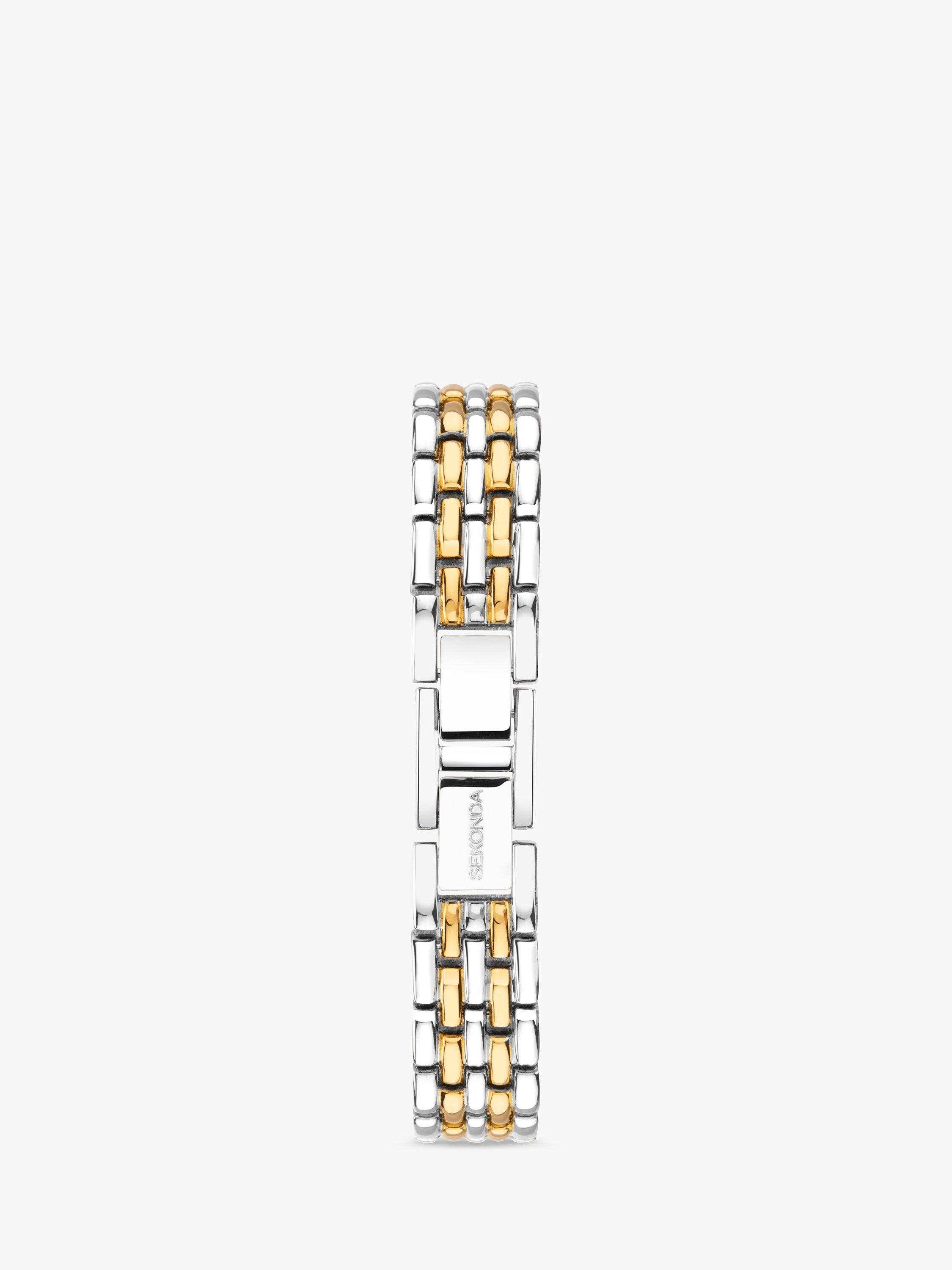 Secured by a supportive metal bracelet strap, it is polished for a sophisticated finish.