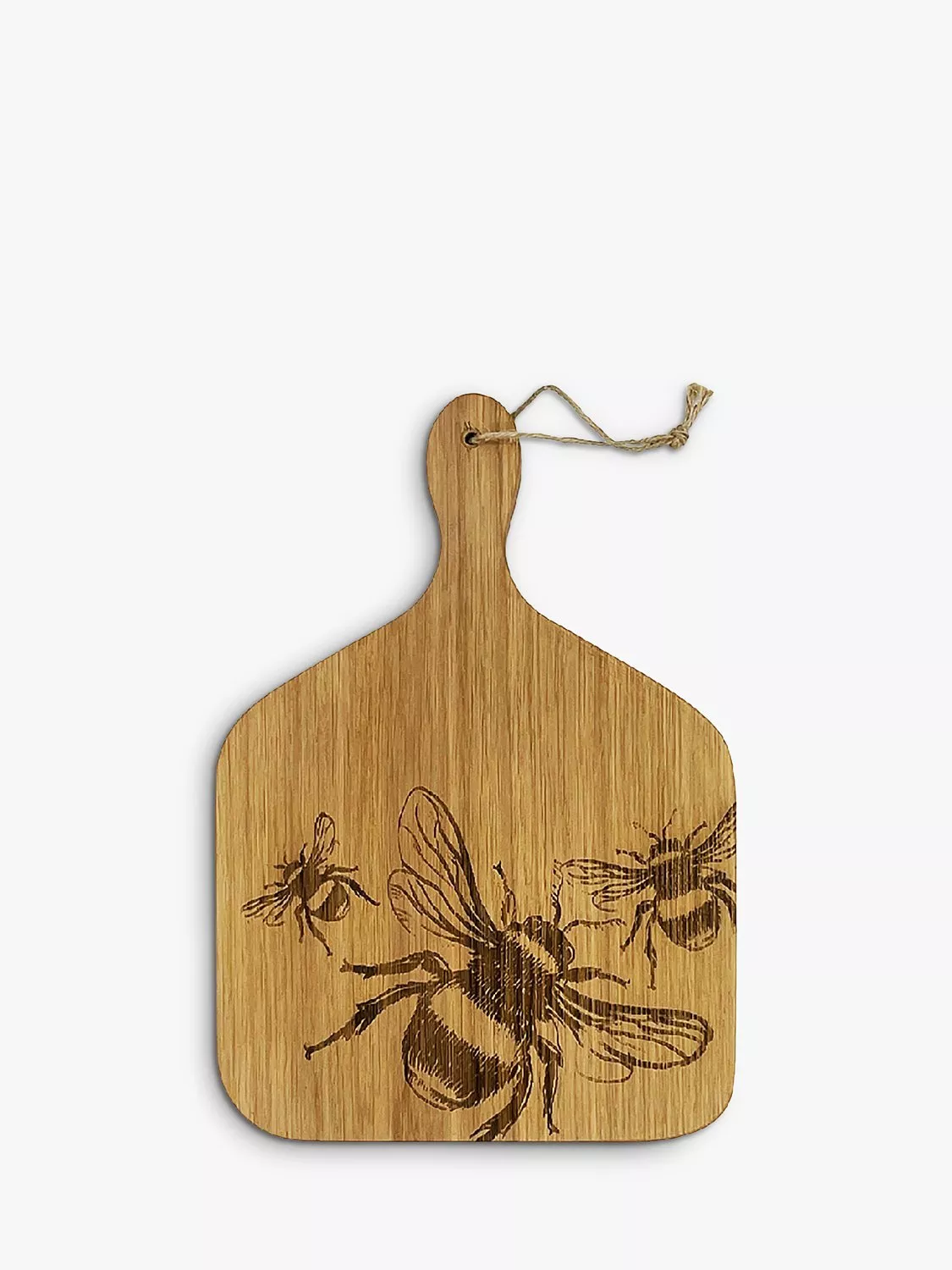 Add some country charm to your kitchen with this paddle board made of Scottish oak wood and engraved with a trio of bees. A handy piece that allows you to chop and serve in style, and when you're finished, hang it up on display with the jute string loop.