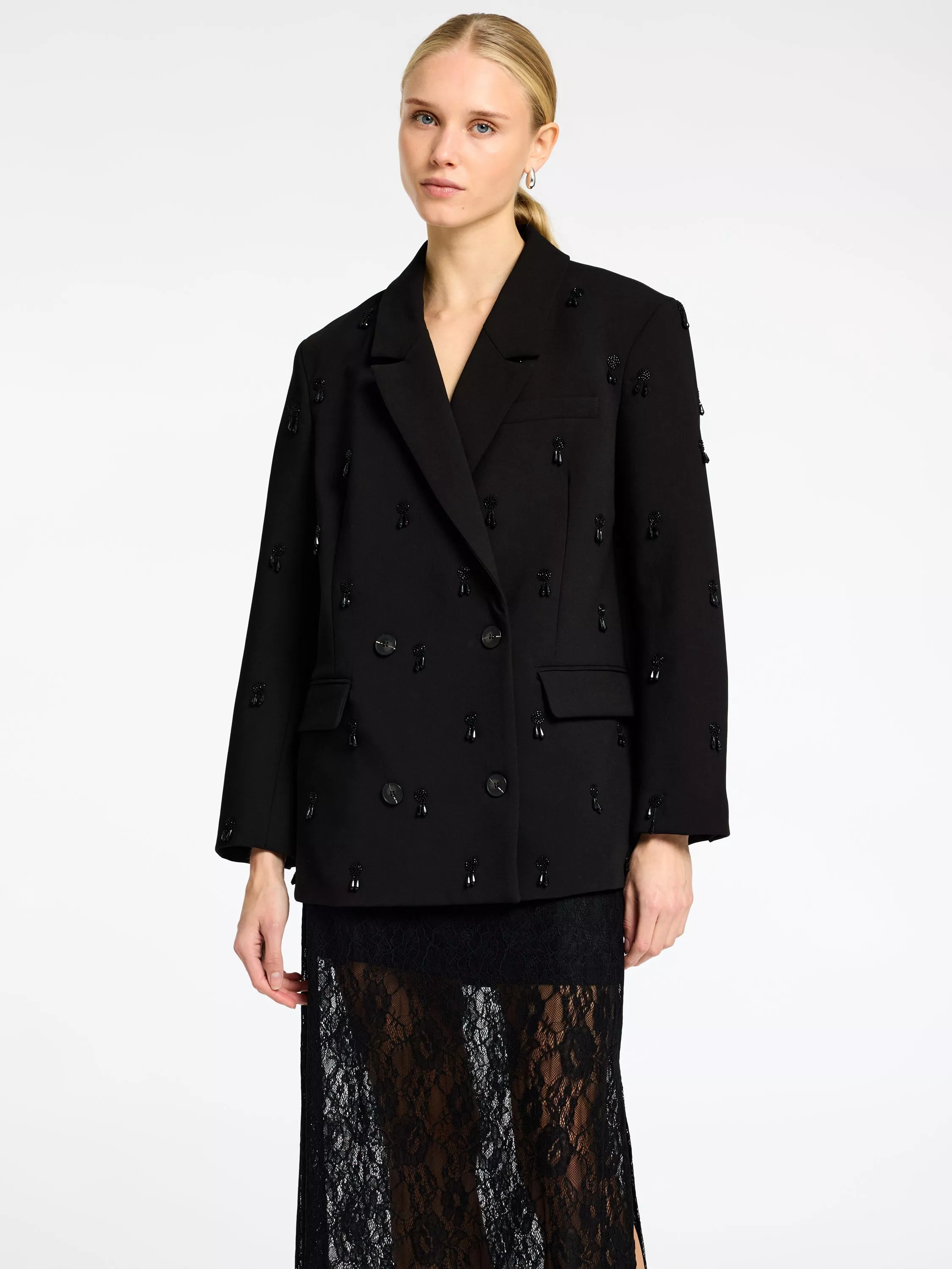 Elevating your look with ease, this boxy fit tweed jacket from Selected features a round neck and metallic detailing.