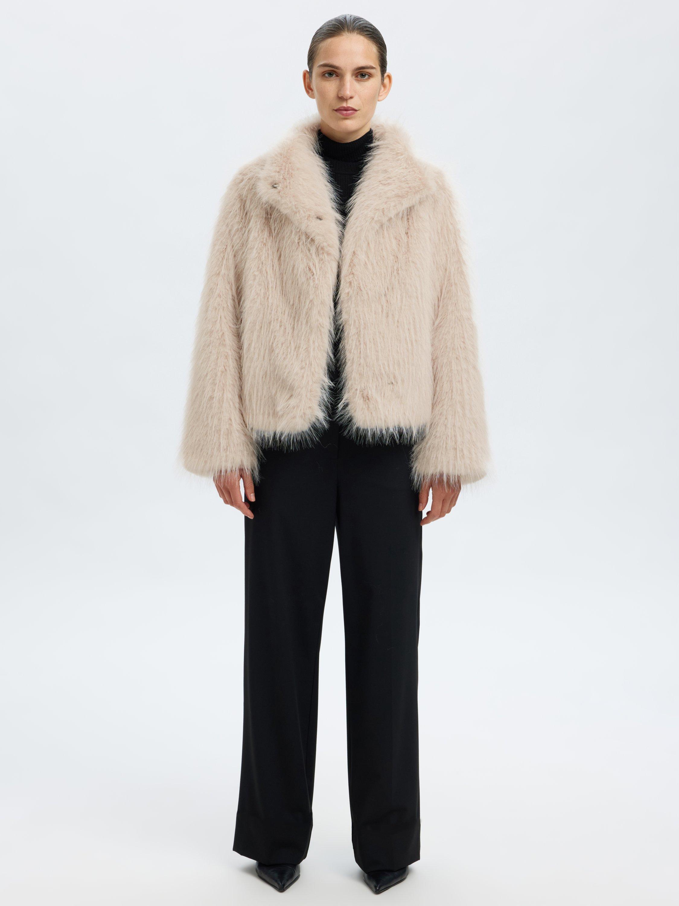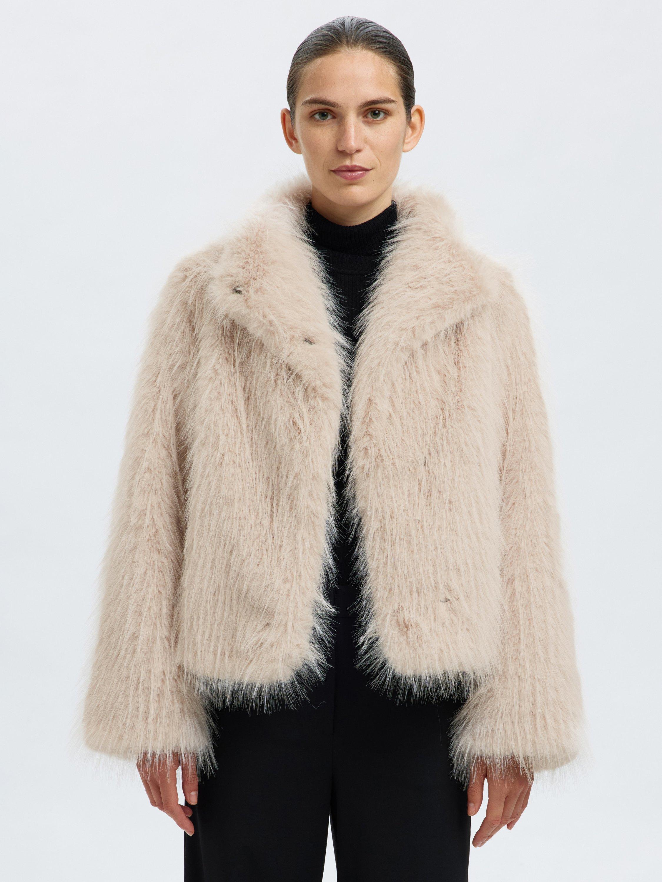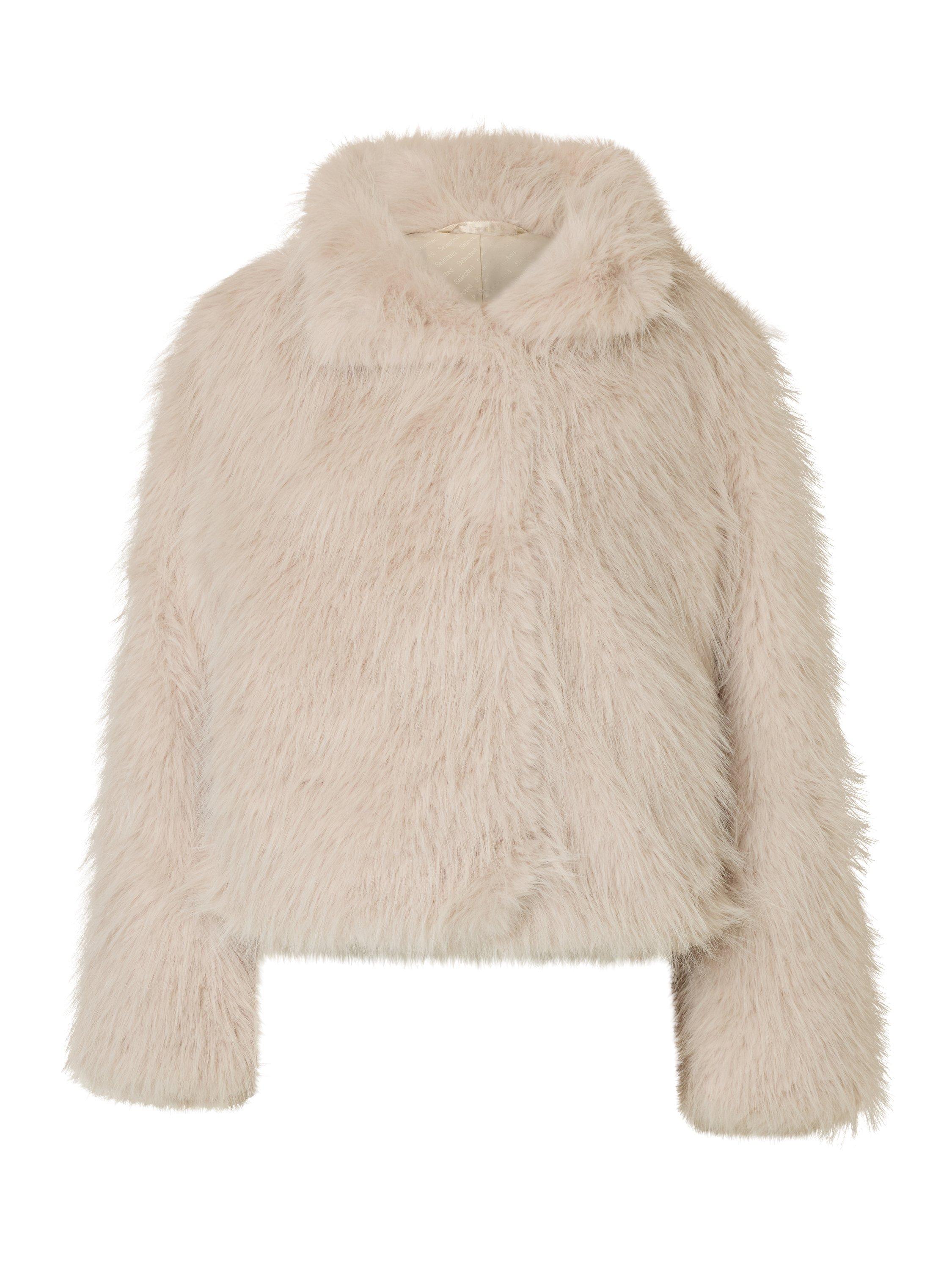 Elevate your evening with this textured faux fur jacket. Thoughtful details, a soft feel, and a classic collar make it a practical but fun choice. Complete with hidden side pockets.