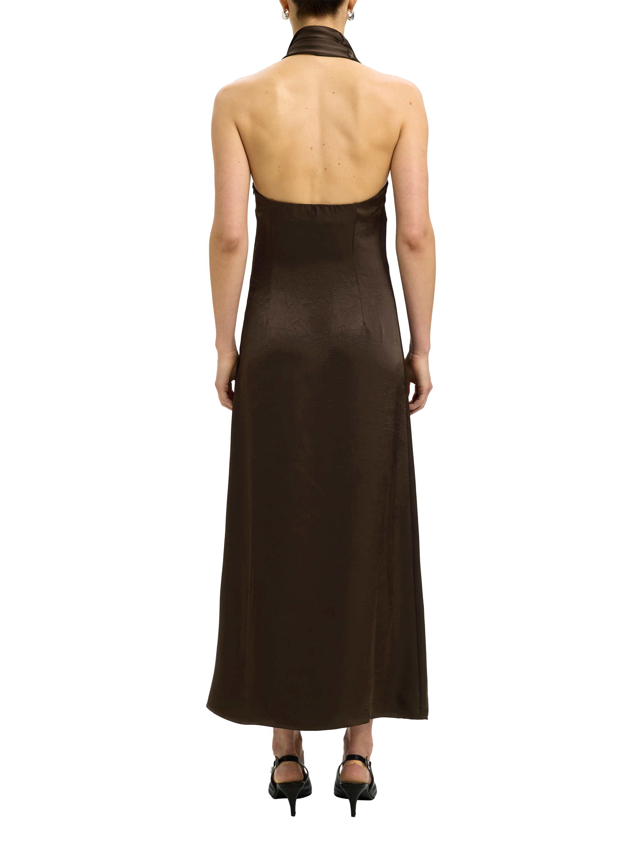 This sleek maxi features a draped halterneck and open back, perfect for any occasion. Cleverly cut in a sheath shape, it drapes beautifully and lets you move freely from day to evening events.
