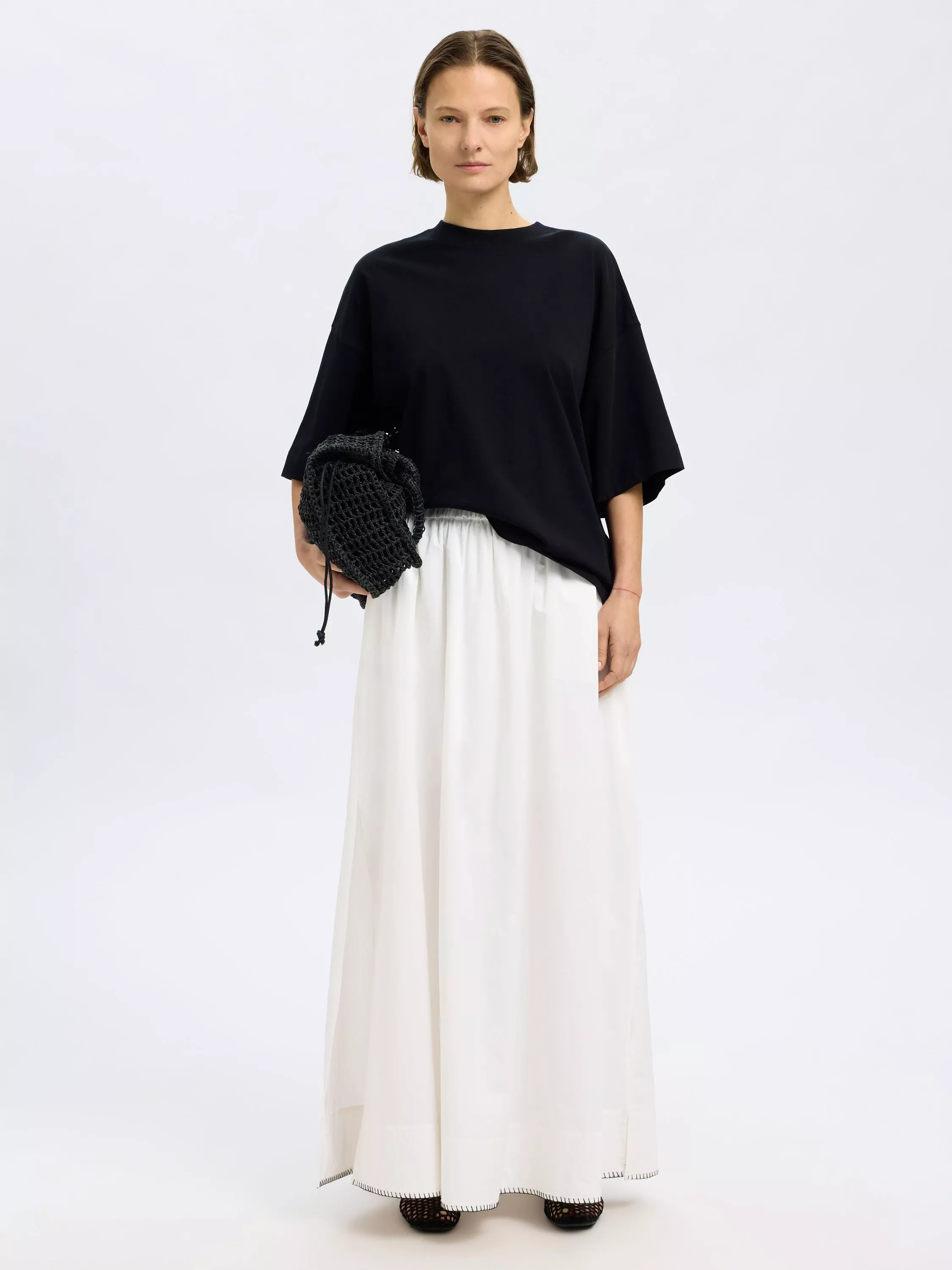 Woven cotton skirt falling to ankle length with a side slit and stitched hem detailing. Comfortable to wear thanks to the elasticated waistband.