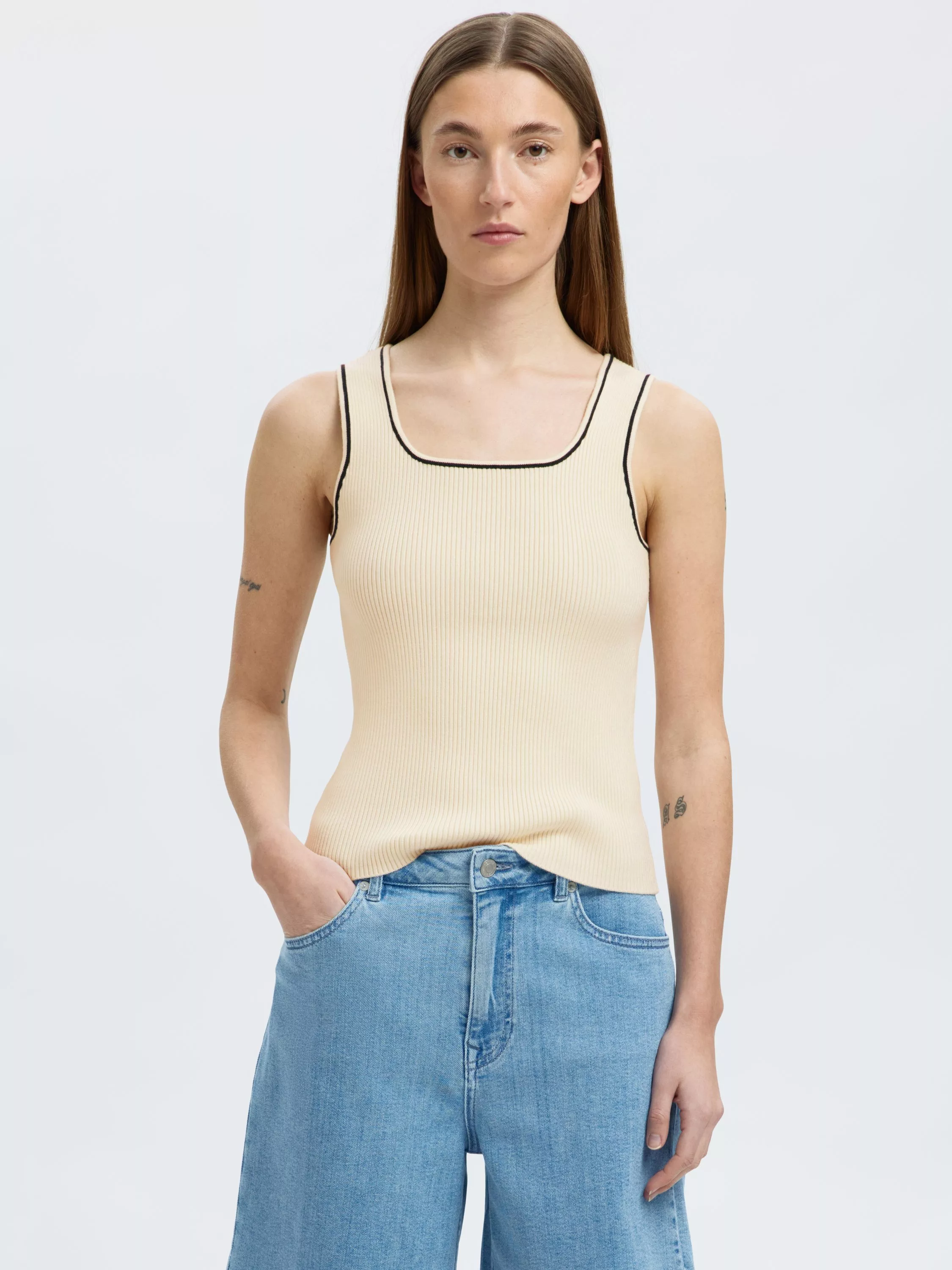 A finely knitted, ribbed tank top from Selected, cut to a sleeveless style with a flattering square neck. Finished with contrast trims.