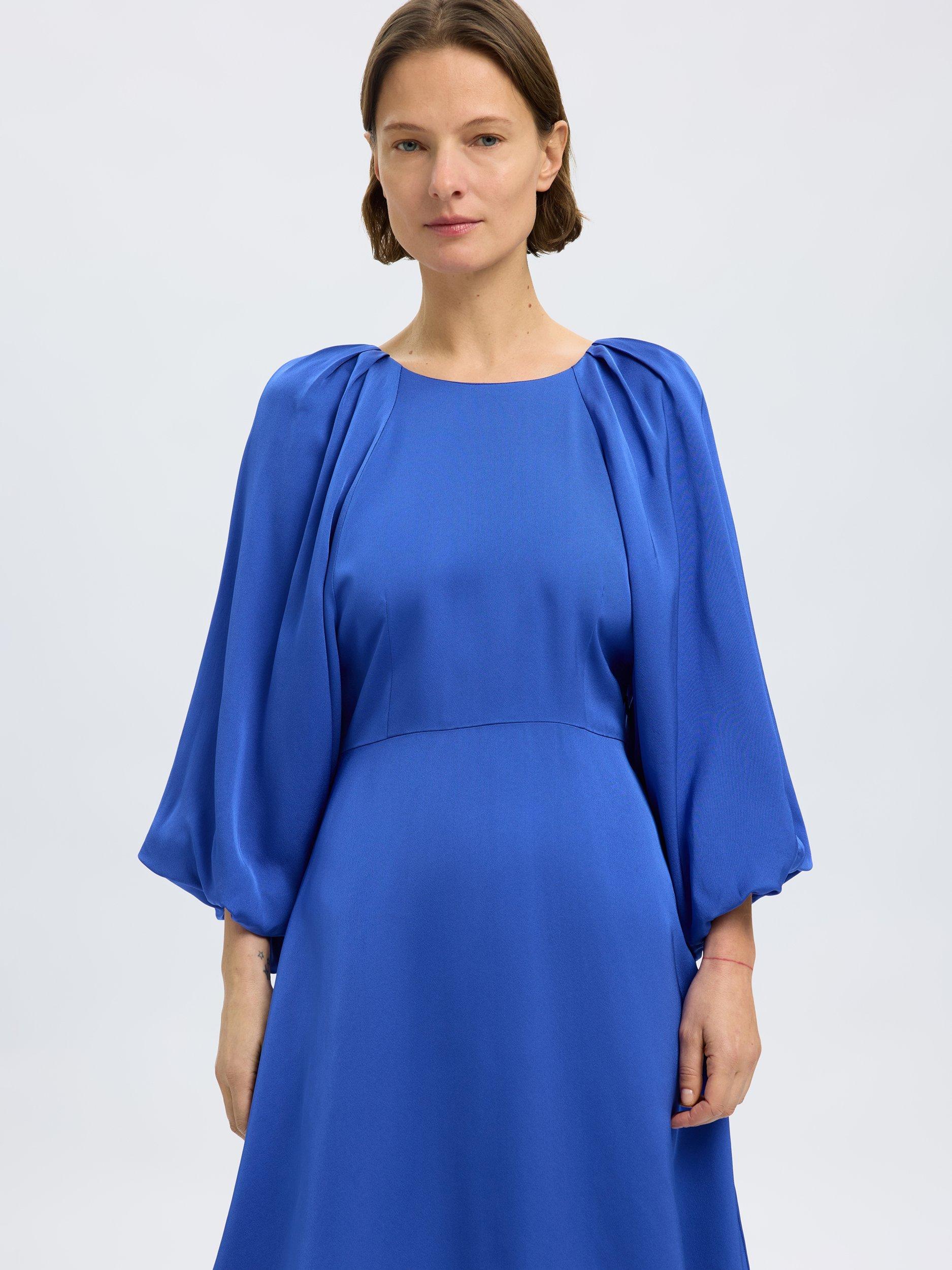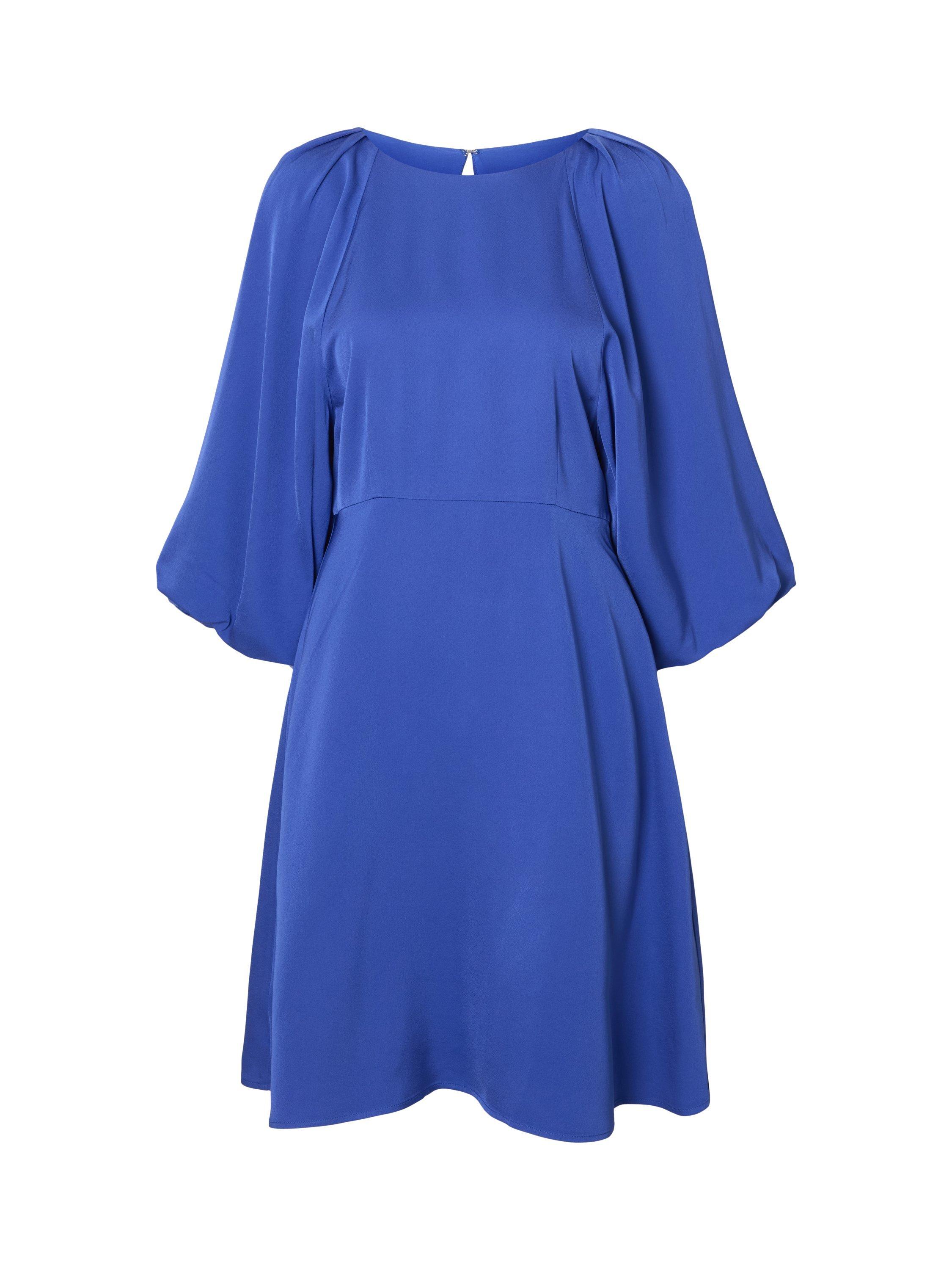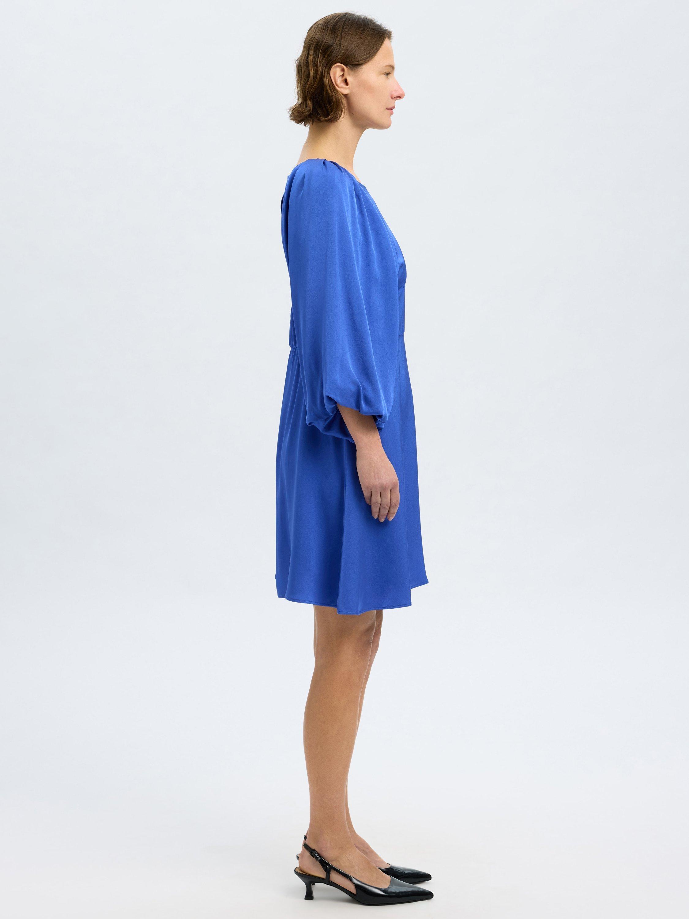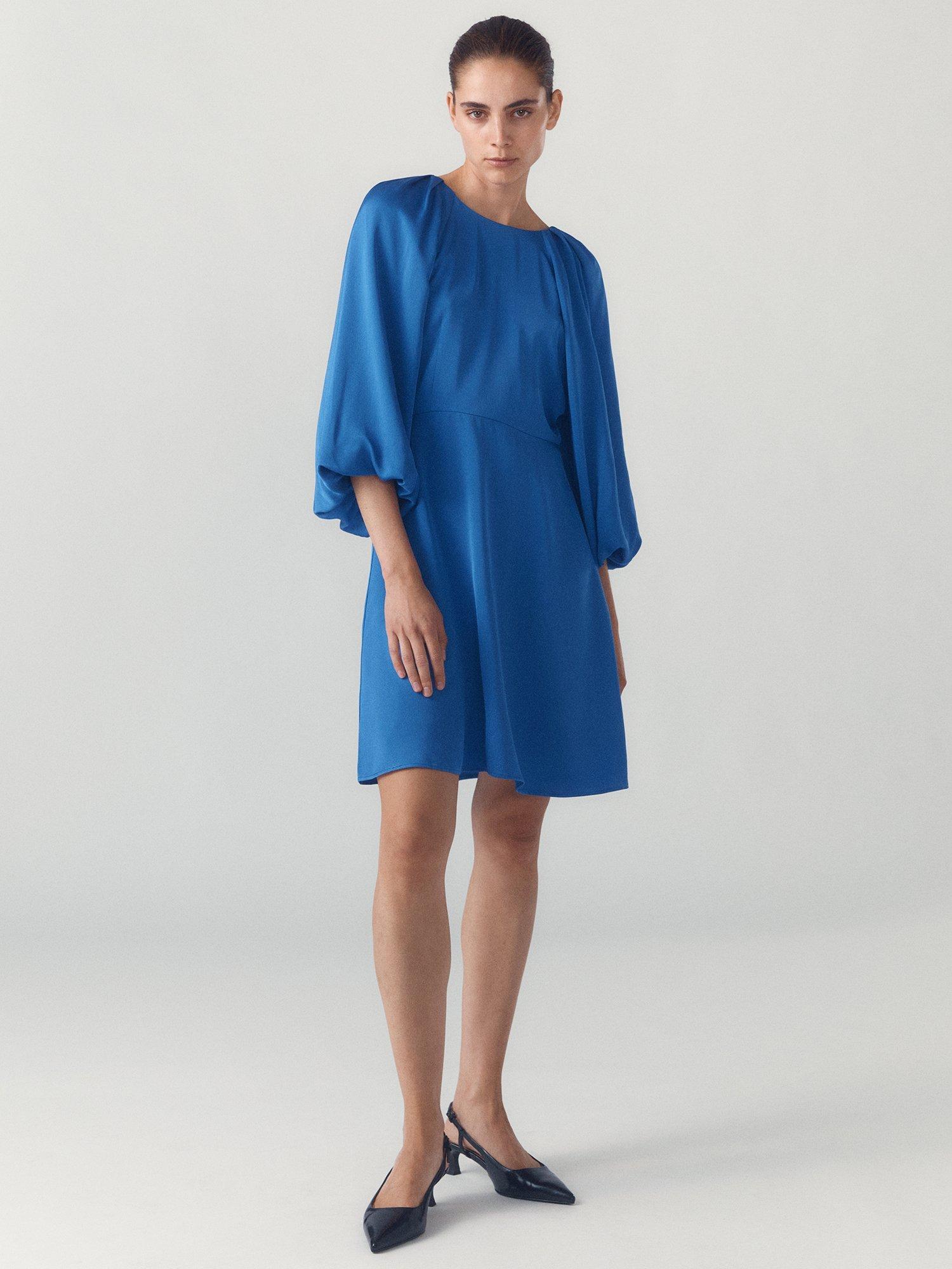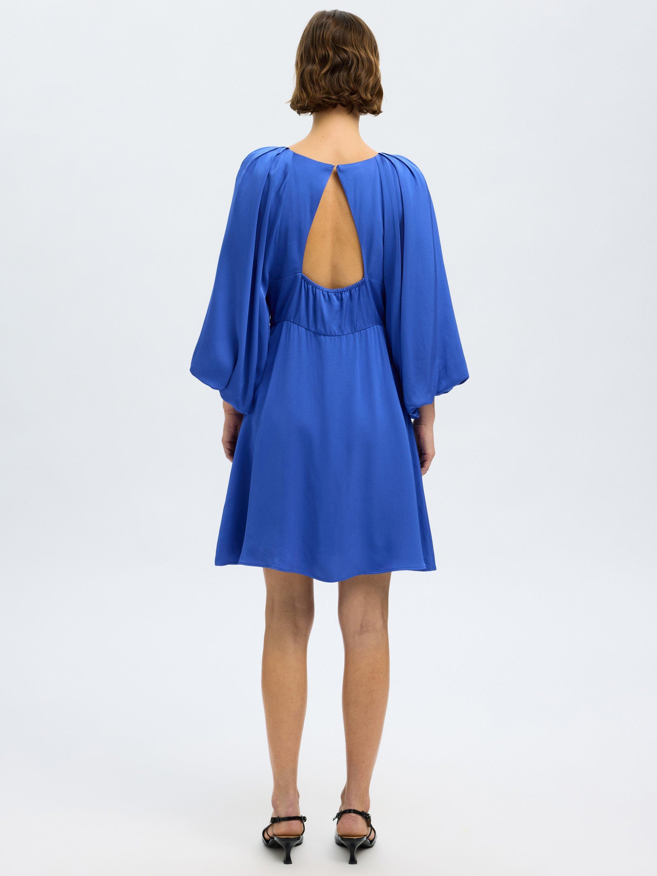 Three-quarter-length puff sleeves add shape to this open-back dress, falling above the knee. Made in a fluid fabric with a round neckline and fitted waist.