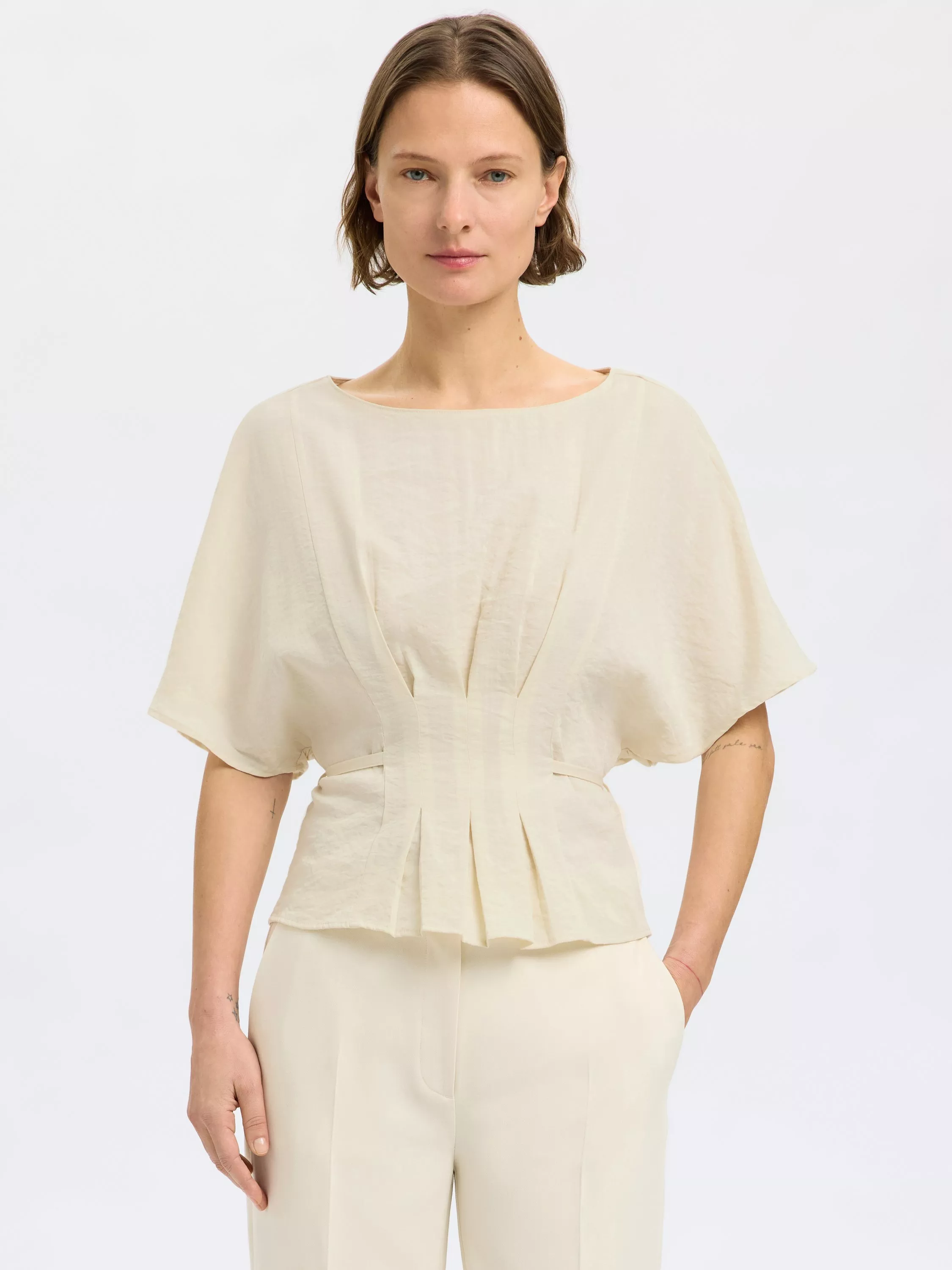 Pleat front top with elbow-length sleeves, flattering waist and a boat neckline.