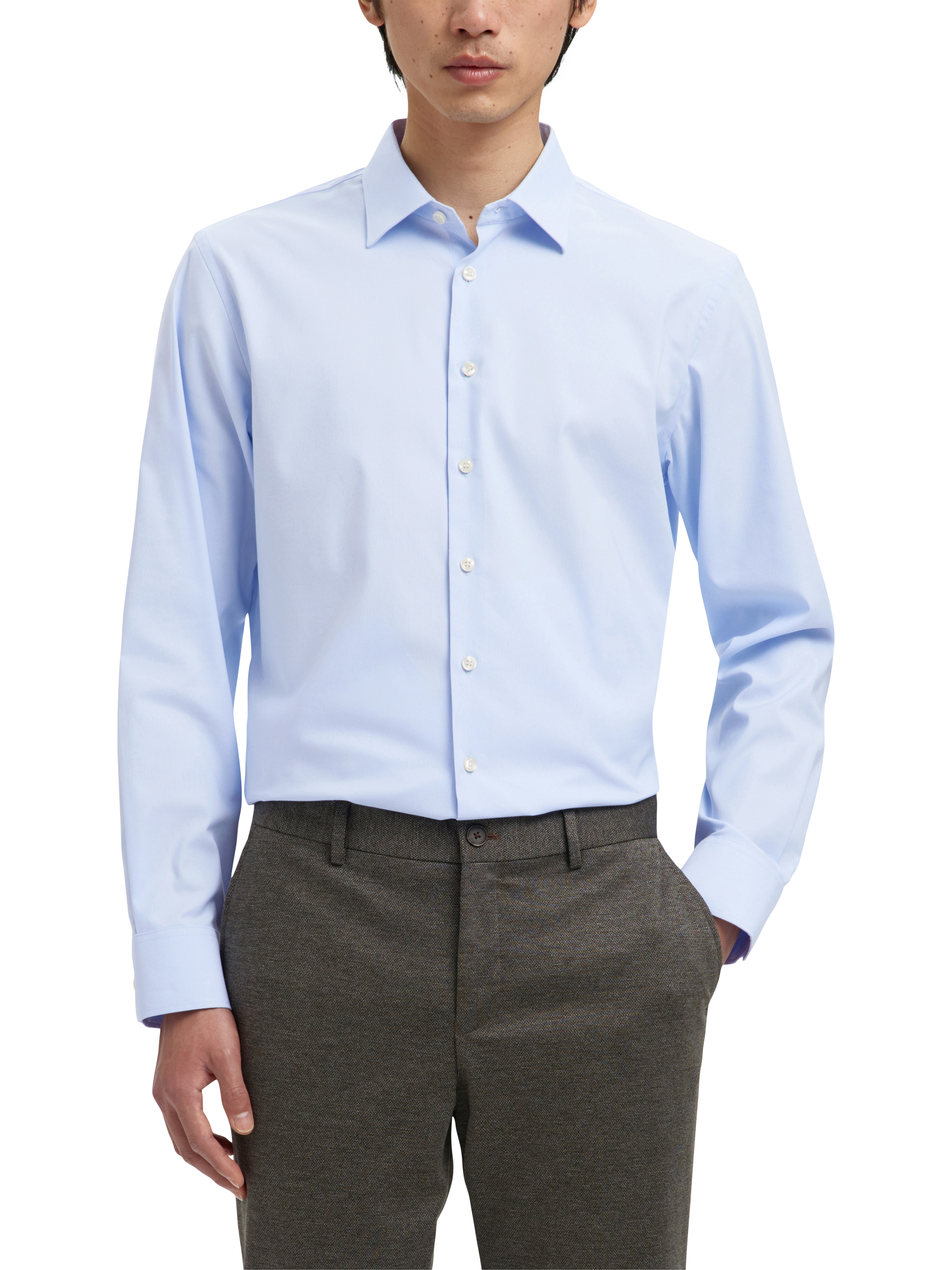 This versatile shirt is cut to a slim fit from a stretch-friendly, cotton-blend fabric for maximum comfort and styling versatility.