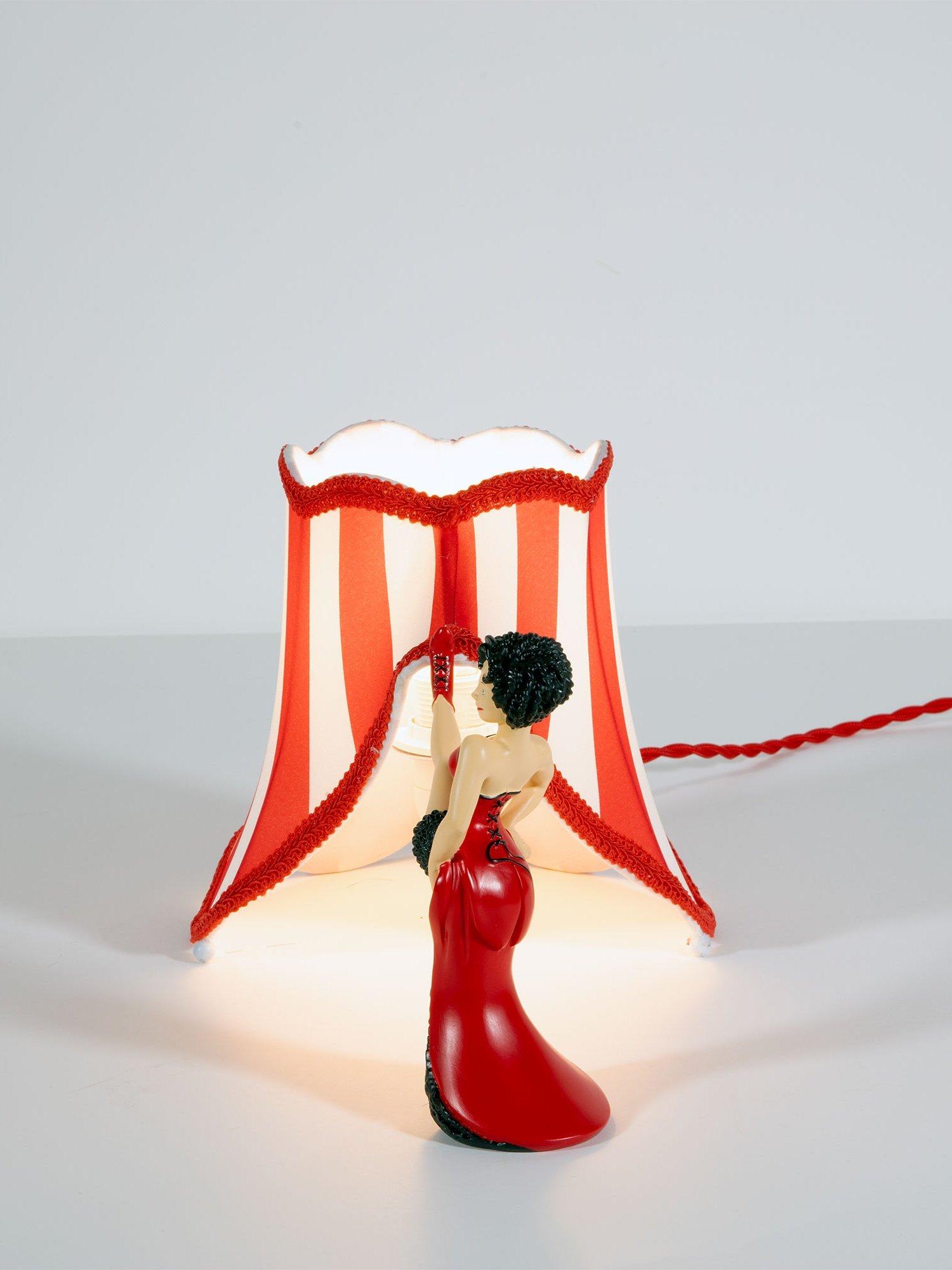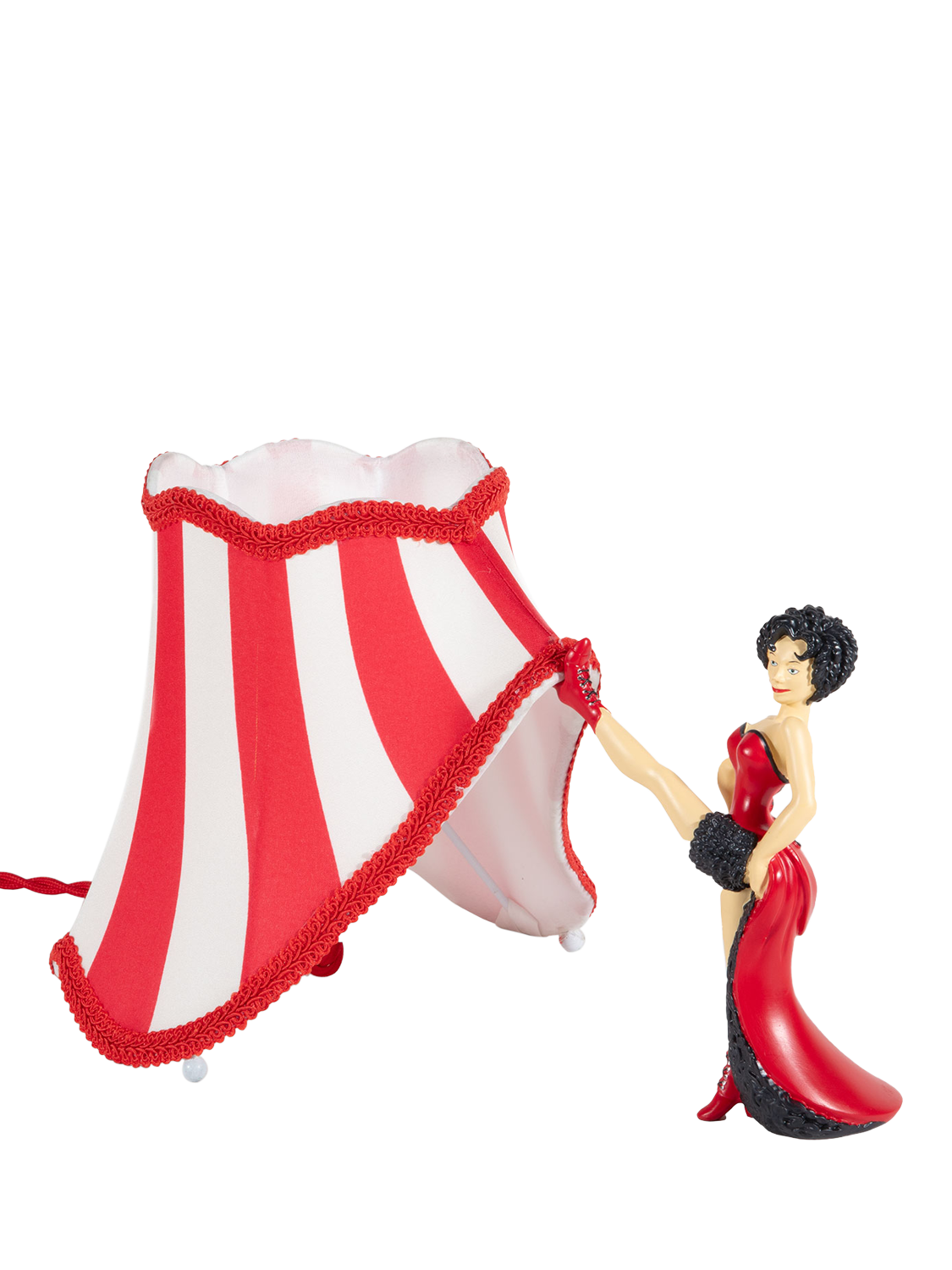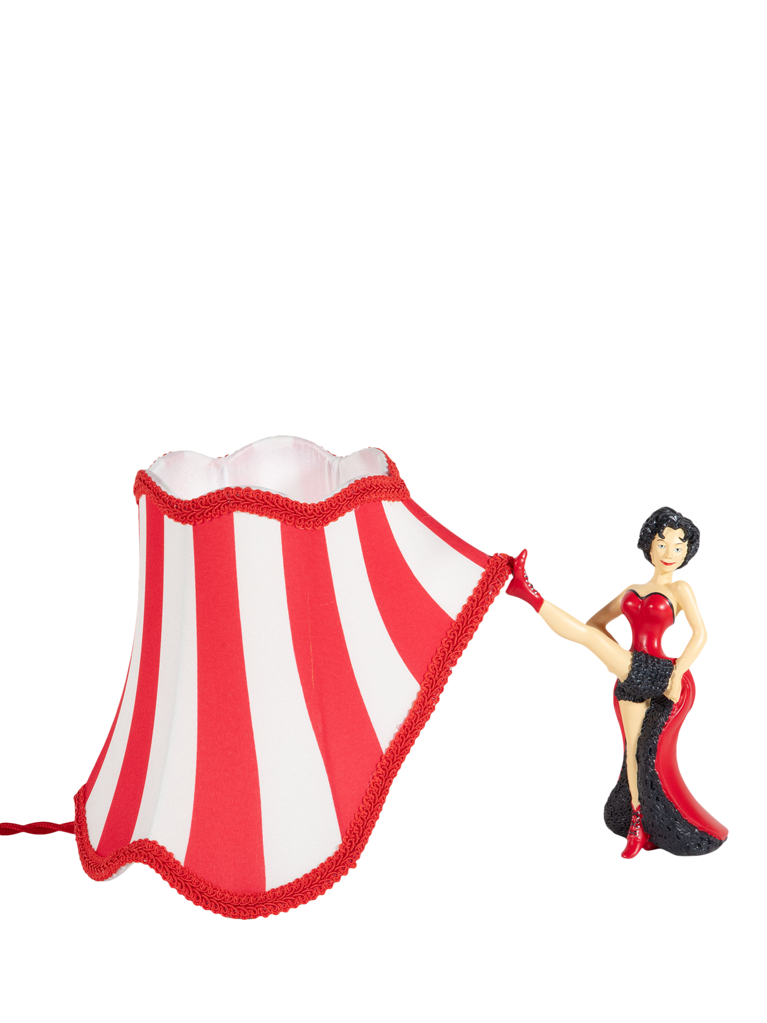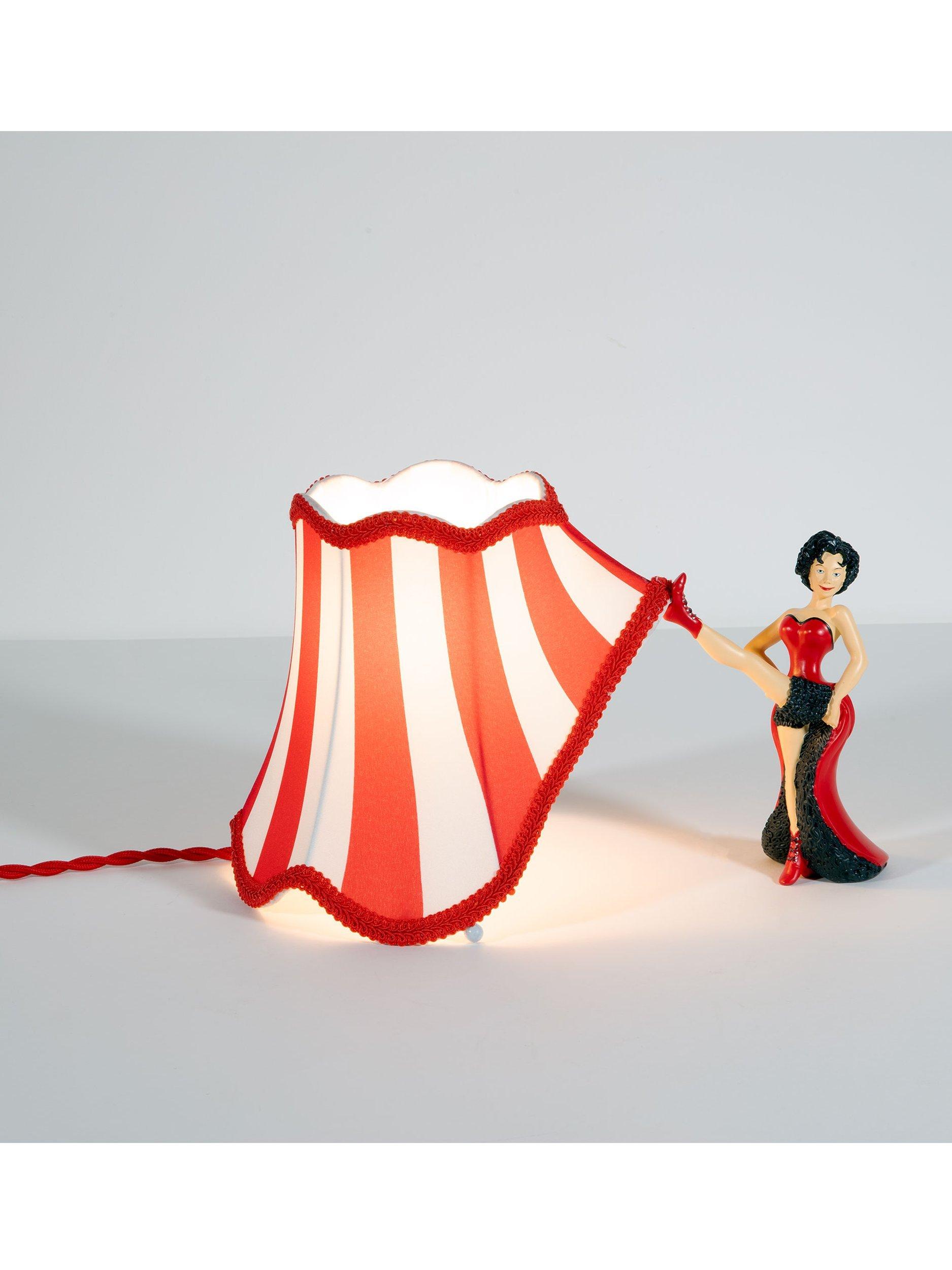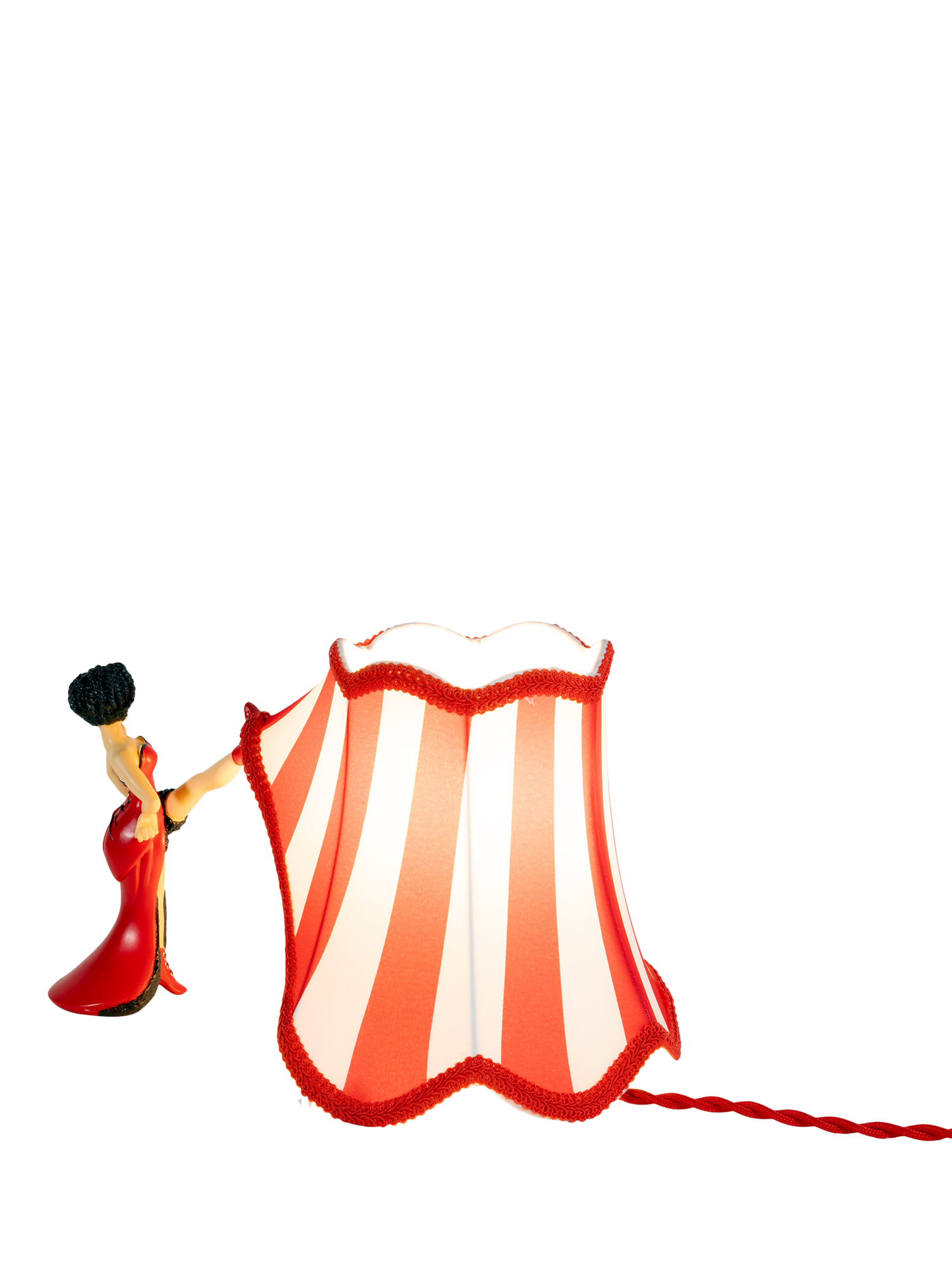 Step right up and bring the enchanting world of the circus into your space with Seletti's AbatJour Lucy Table Lamp. Featuring characterful Lucy from the circus realm, guiding the way into a striped circus marquee, the red and white lampshade. Includes a braided red cable.