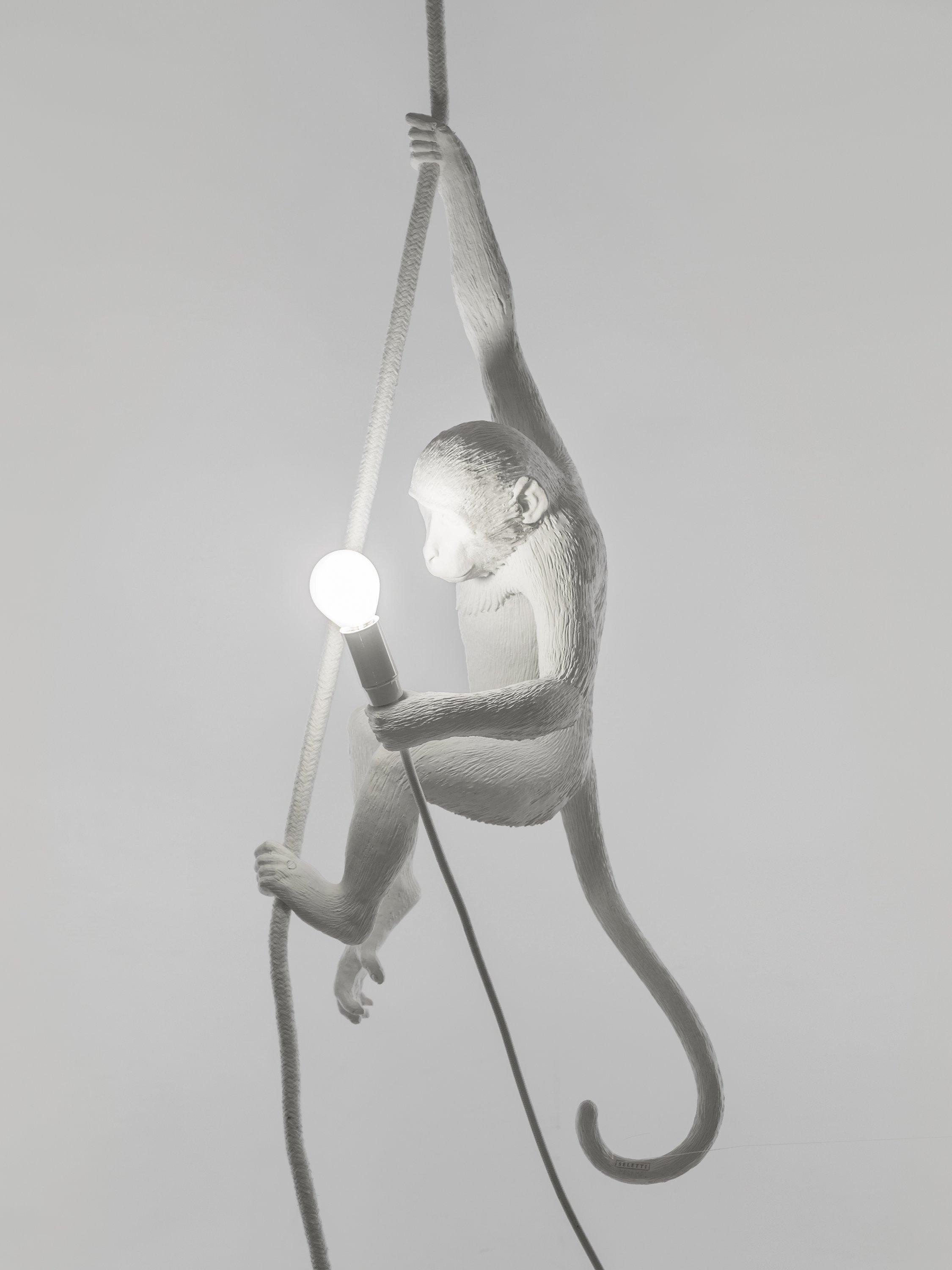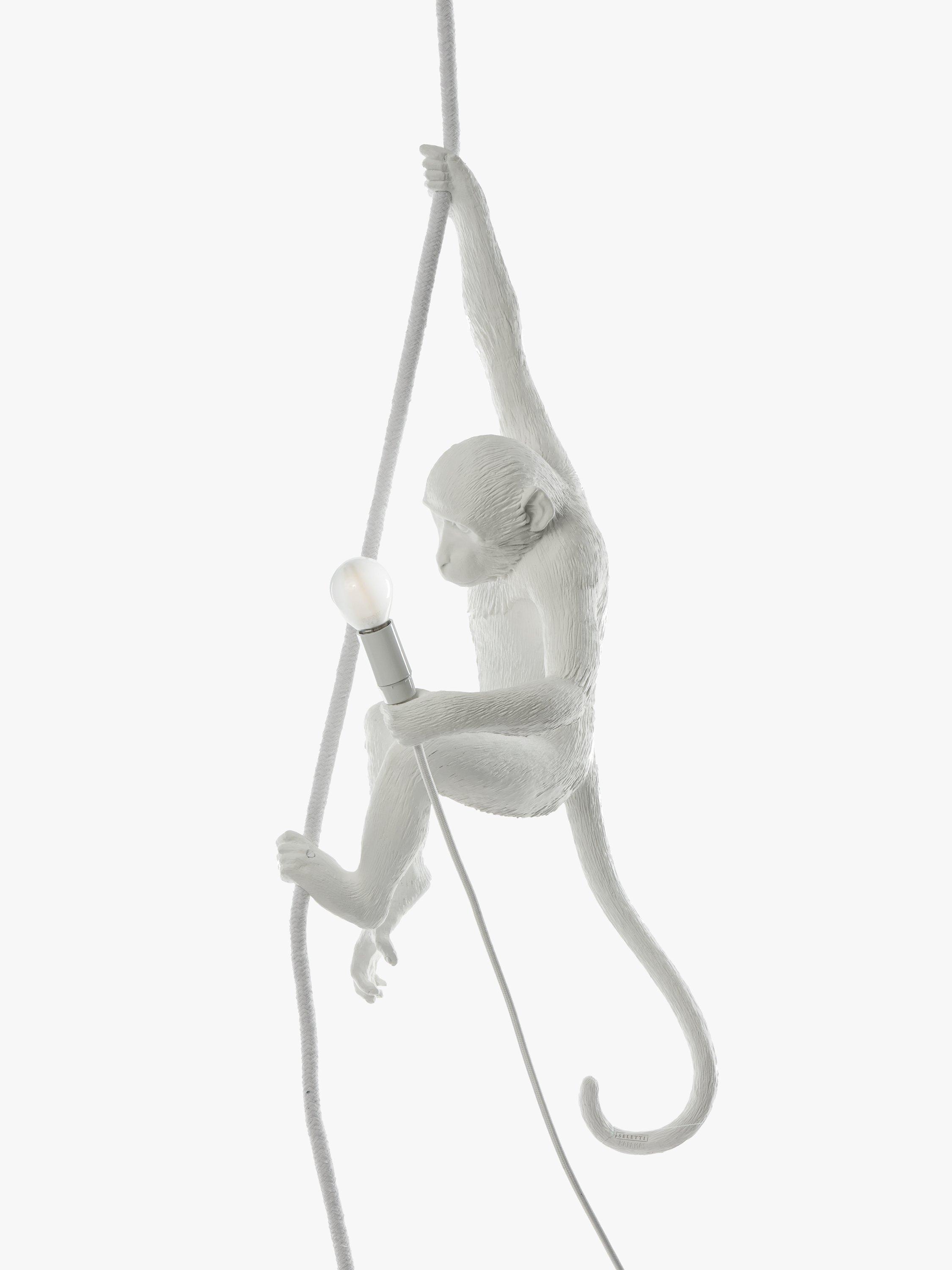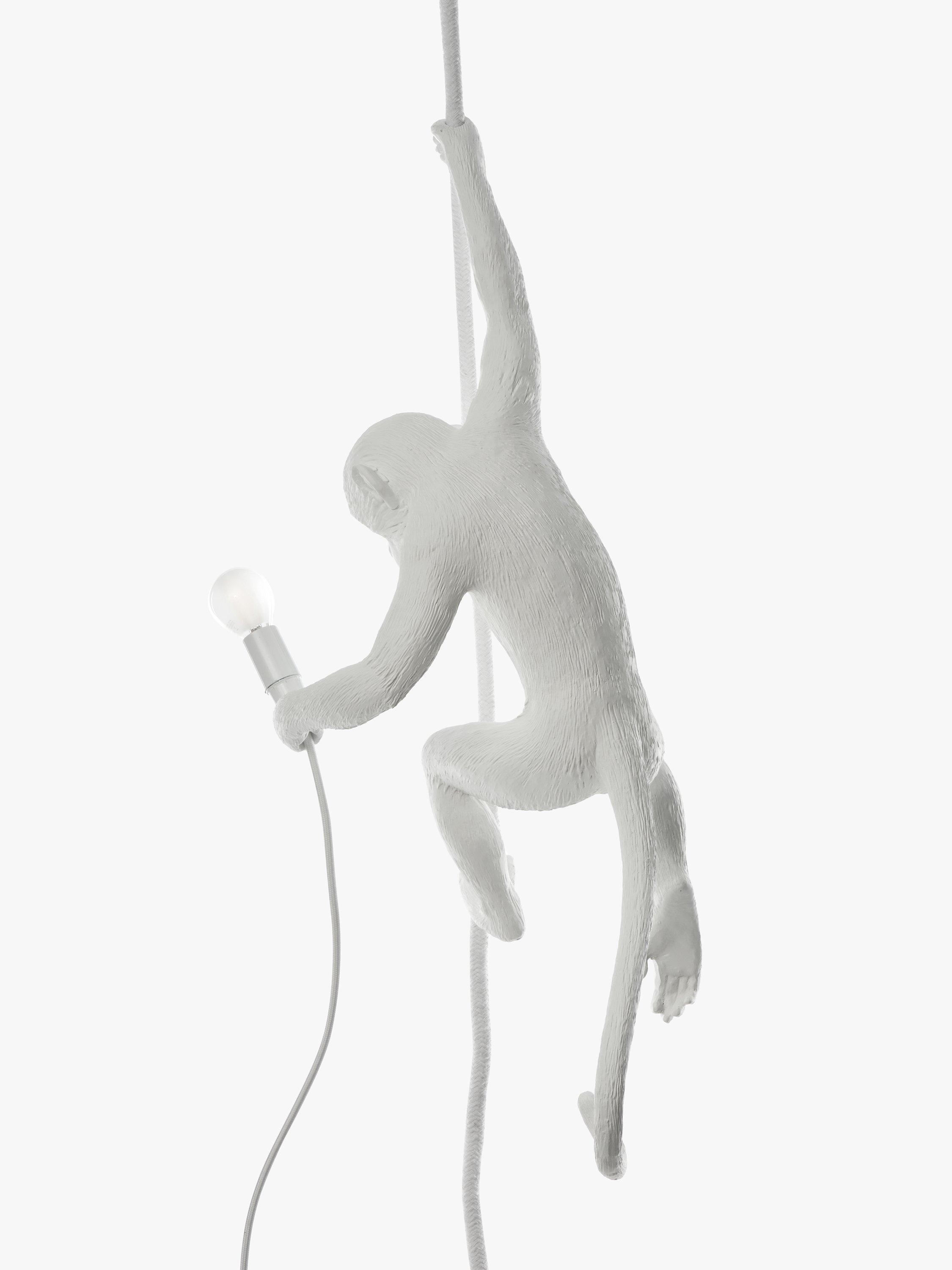 Designed by Marcantonio for Seletti, this cheeky hanging monkey is ideal for adding a quirky accent to your home style. Suitable for indoor use only. This monkey is attached via a rope - adjustable, maximum six meters in length - through the supplied ceiling rose. The cable is four and a half meters long with a rocker switch and a three pin plug. This light can be hard wired through the ceiling rose, installation instructions are provided.