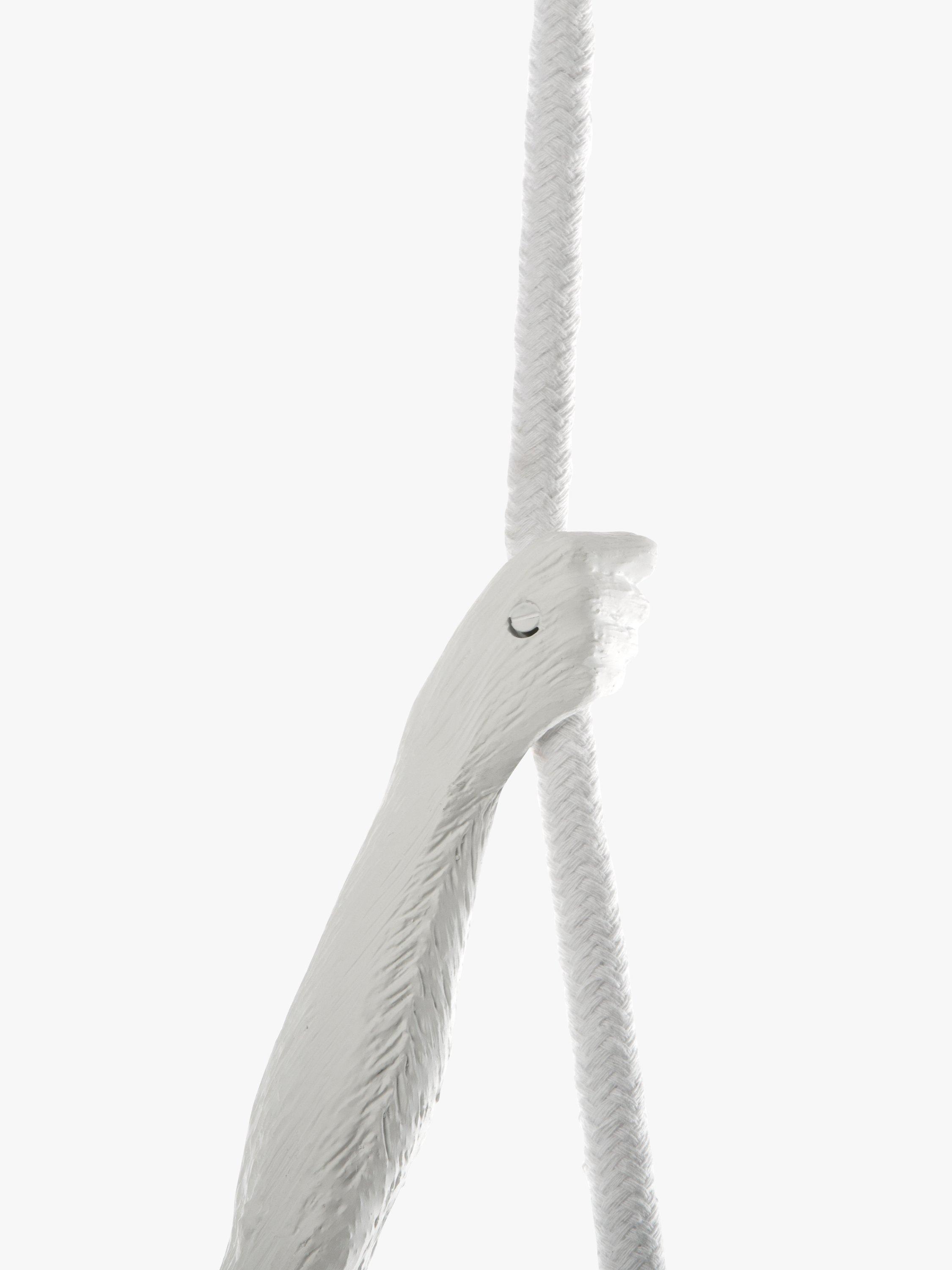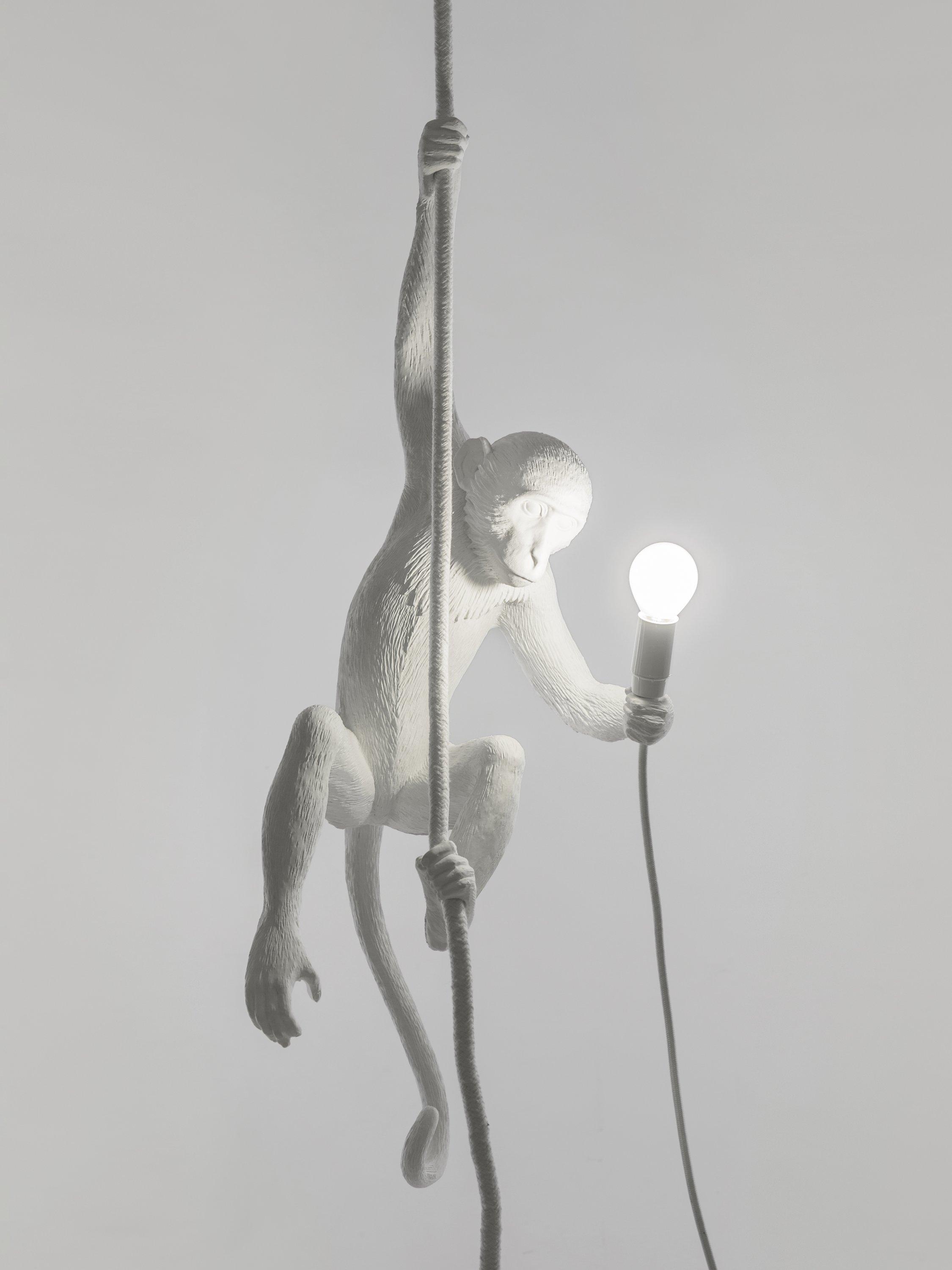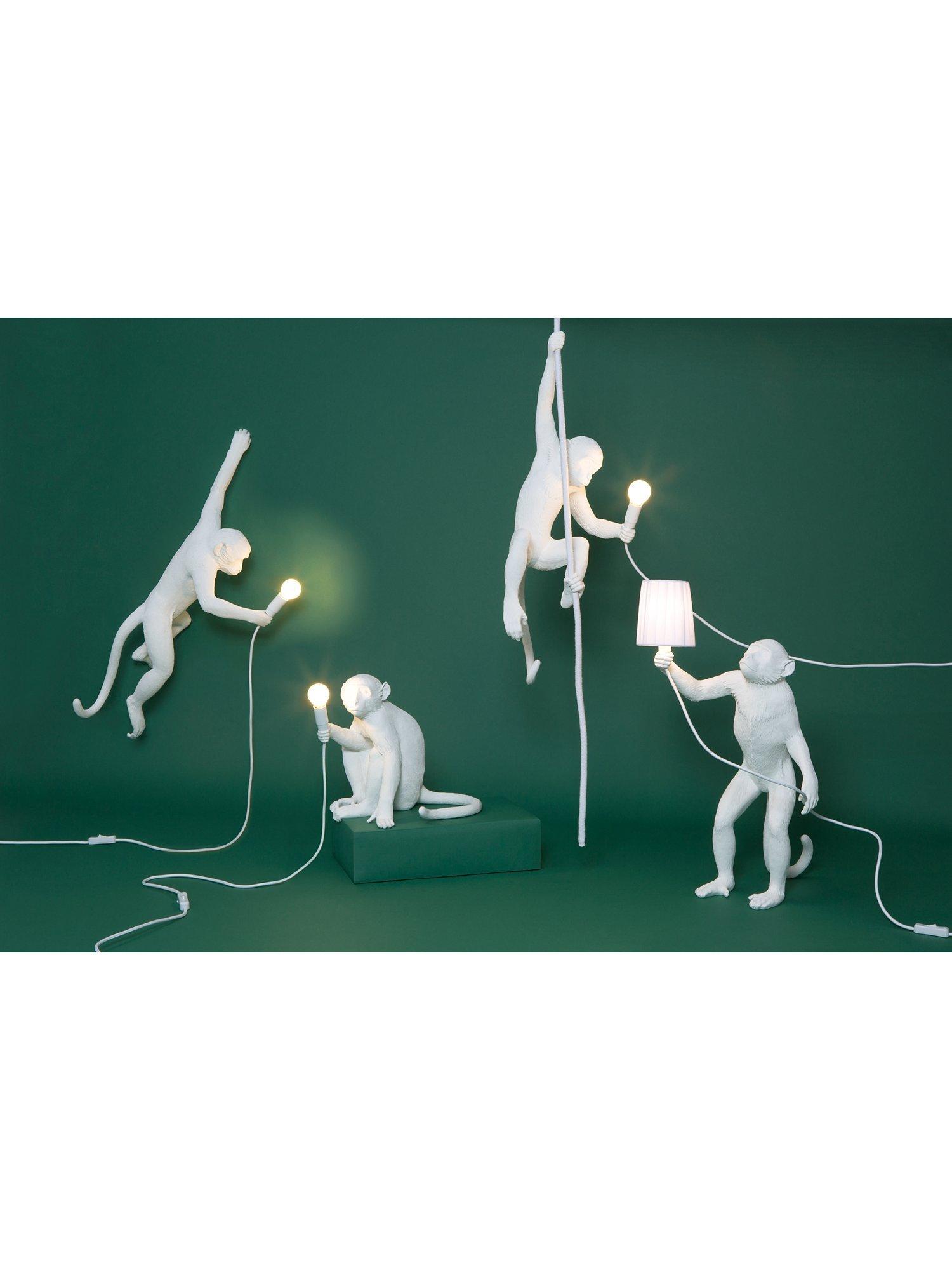 Designed by Marcantonio for Seletti, this cheeky hanging monkey is ideal for adding a quirky accent to your home style. Suitable for indoor use only. This monkey is attached via a rope - adjustable, maximum six meters in length - through the supplied ceiling rose. The cable is four and a half meters long with a rocker switch and a three pin plug. This light can be hard wired through the ceiling rose, installation instructions are provided.