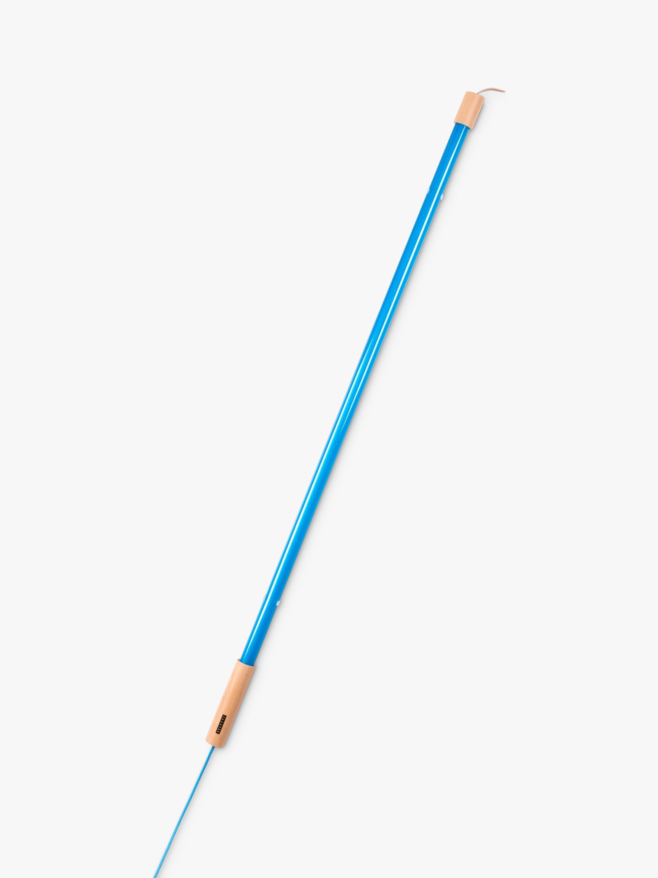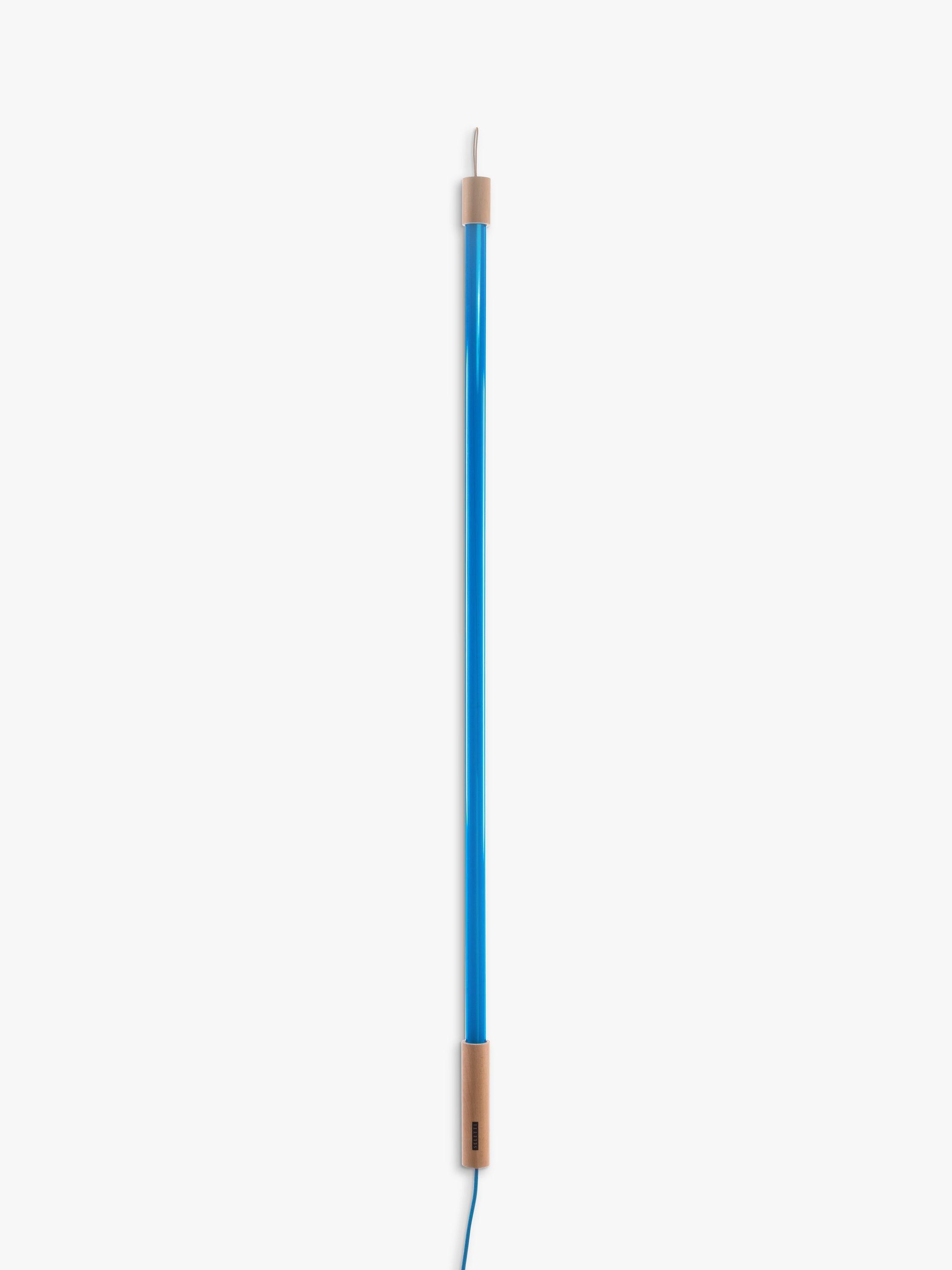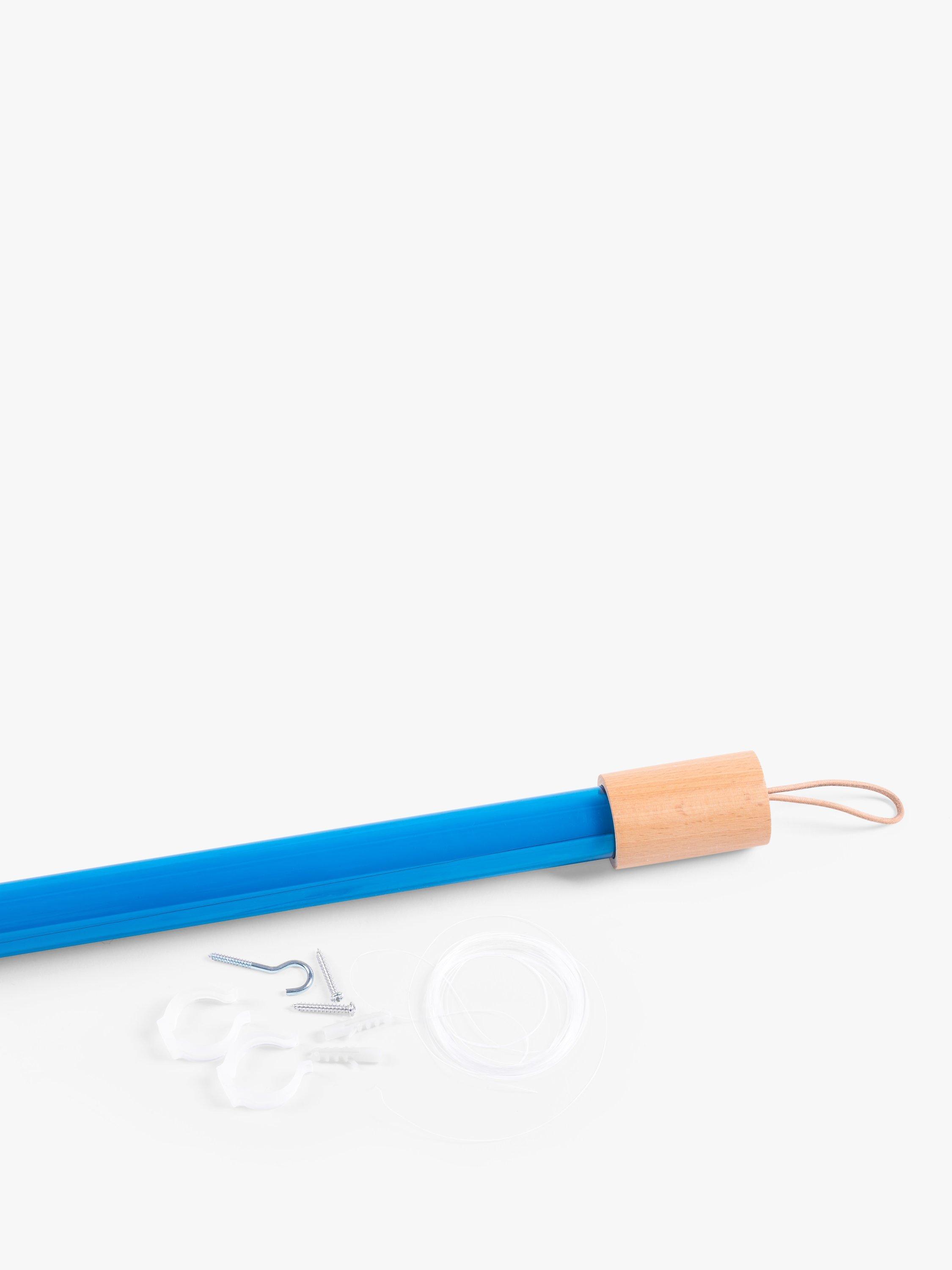 This LED tube light comes with a wooden top and bottom. There's a leather loop to hang the light from and extra plastic wire is provided, so the light can be suspended. Two clear plastic brackets are included, so the light can be attached to the wall. The three meter woven flex is the same colour as the LED tube, designed with a rocker switch.
