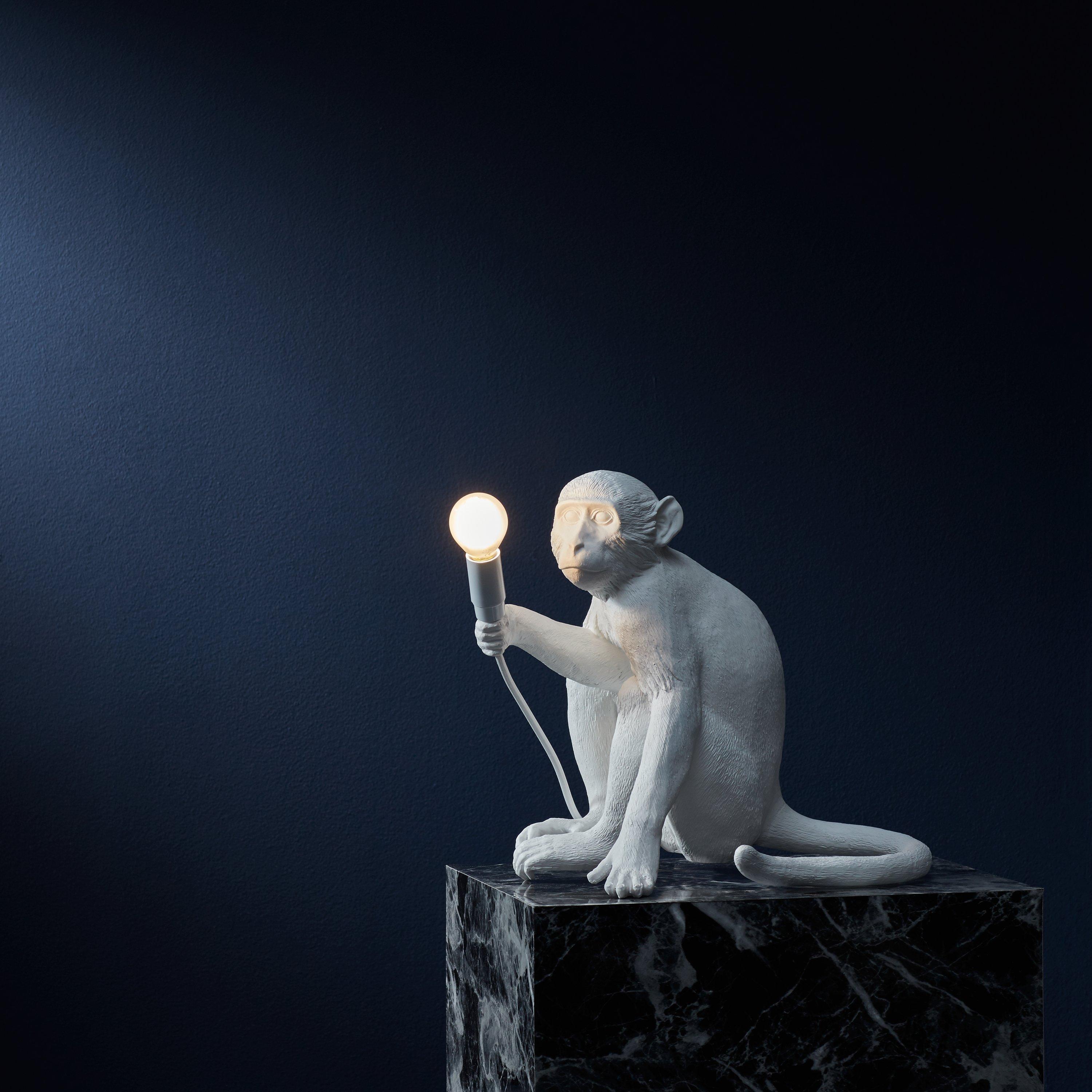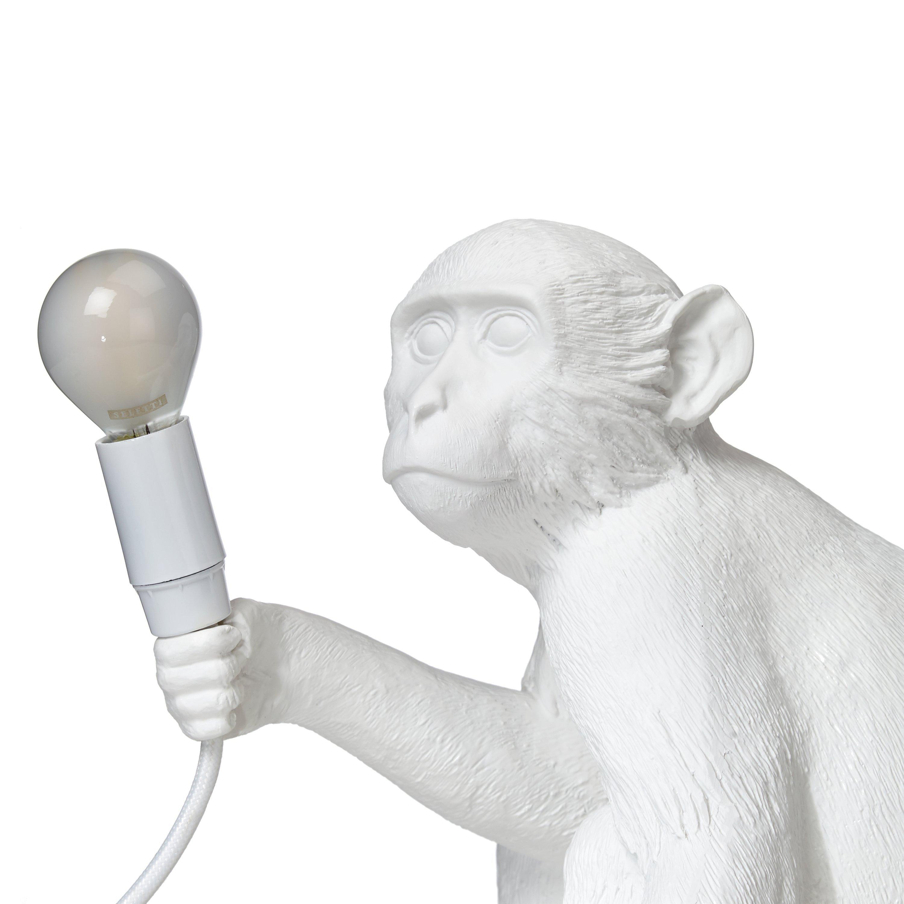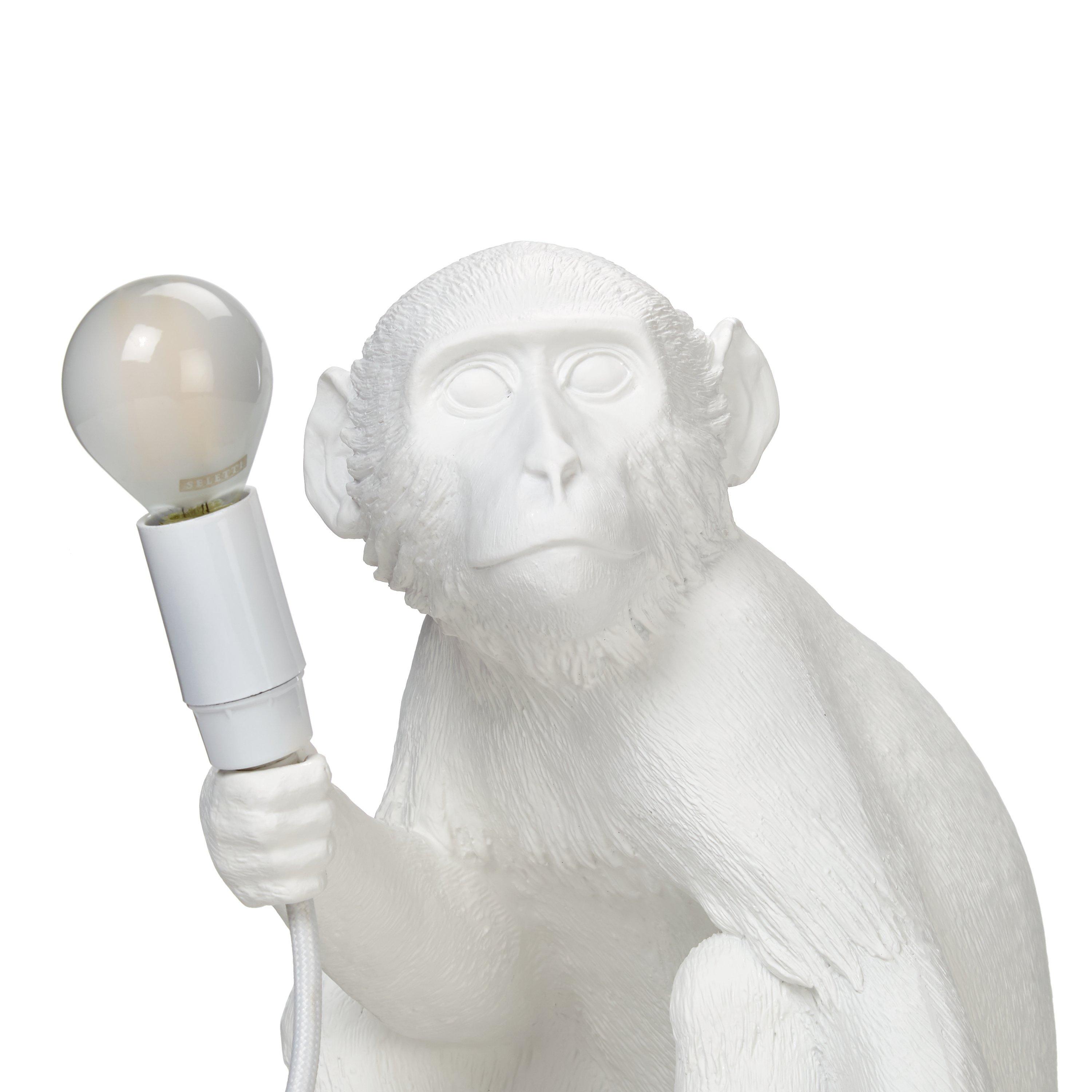 This cheeky Sitting Monkey Table Lamp designed by Marcantonio for Seletti will lend a quirky, novelty feel to your home. Boasting their signature, intricate design, showcasing the monkey poised with the bulb in-hand, it's ideal for placing on the edge of a table or shelf, so that its toes can curl around the edge. A cool statement piece, made in resin, it provides a soft lighting solution. This lamp is supplied with safe, cold-to-touch bulbs. For indoor use only.