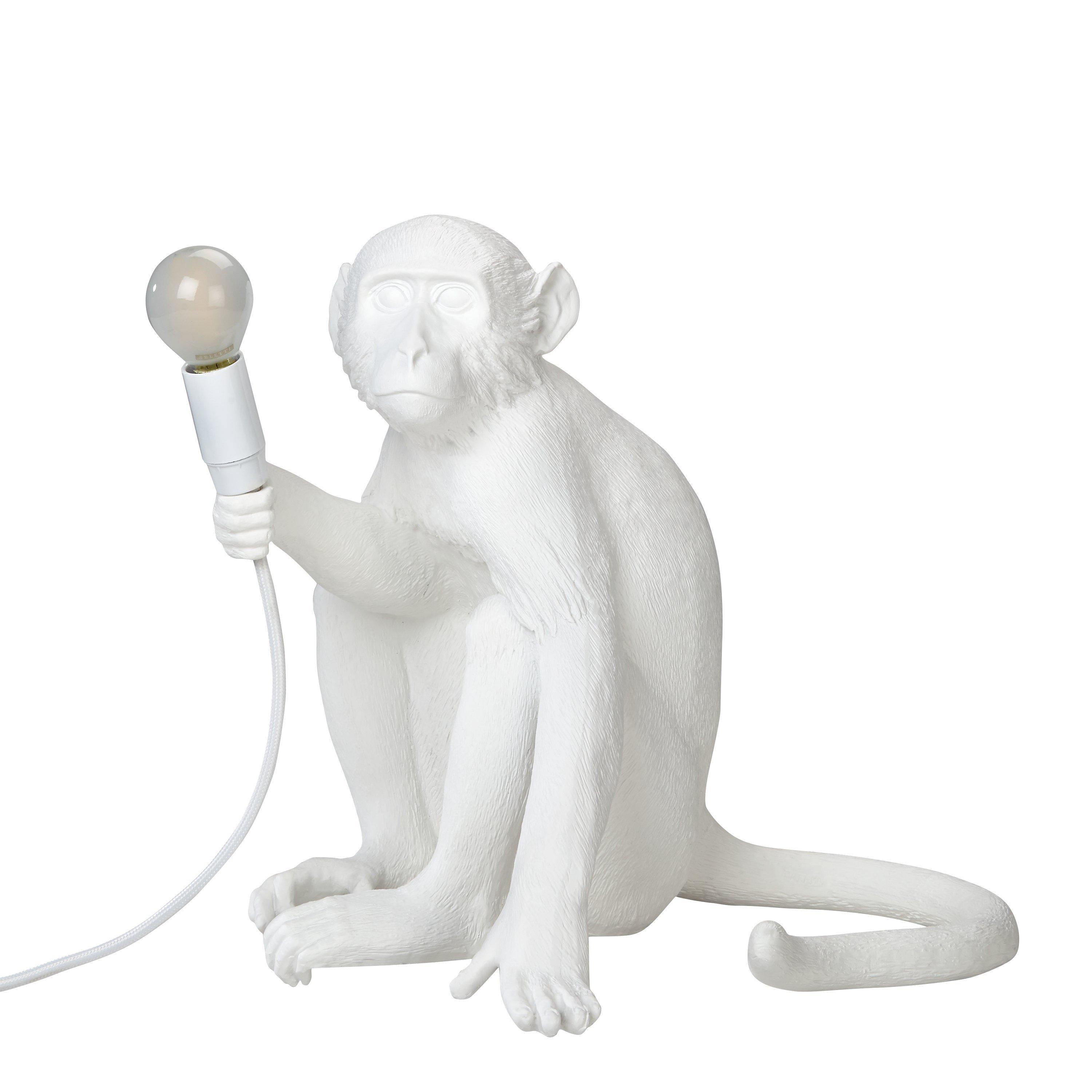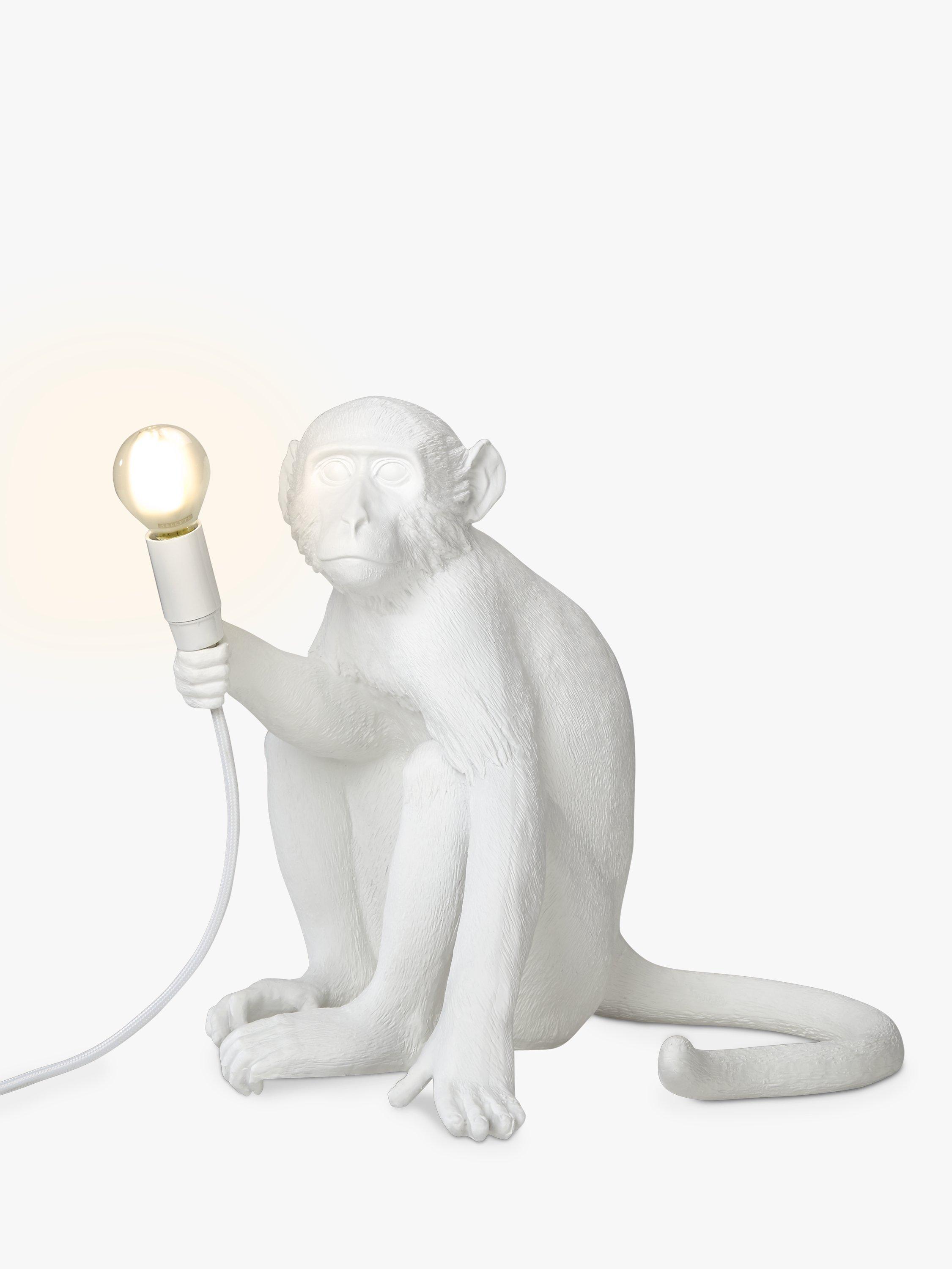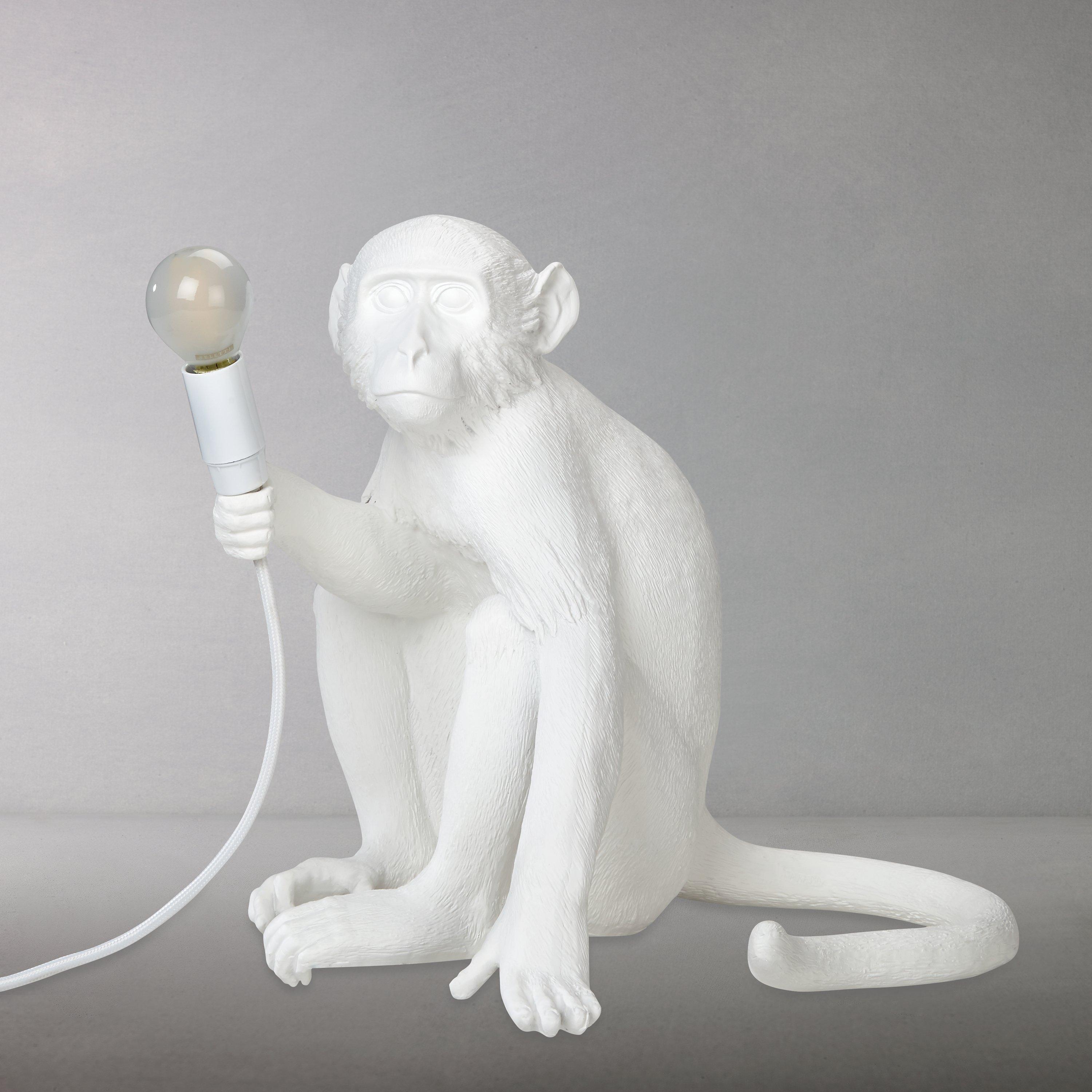This cheeky Sitting Monkey Table Lamp designed by Marcantonio for Seletti will lend a quirky, novelty feel to your home. Boasting their signature, intricate design, showcasing the monkey poised with the bulb in-hand, it's ideal for placing on the edge of a table or shelf, so that its toes can curl around the edge. A cool statement piece, made in resin, it provides a soft lighting solution. This lamp is supplied with safe, cold-to-touch bulbs. For indoor use only.