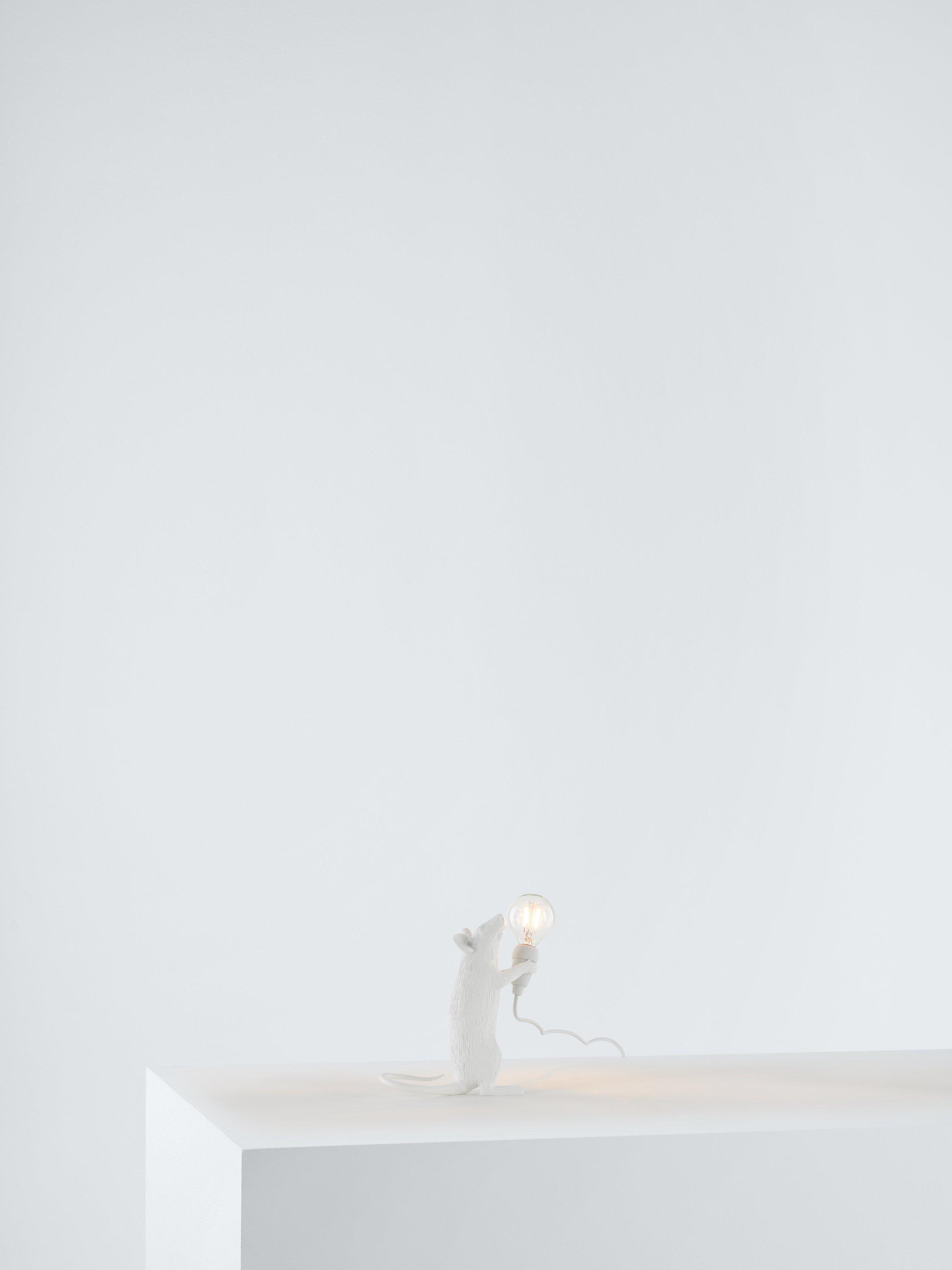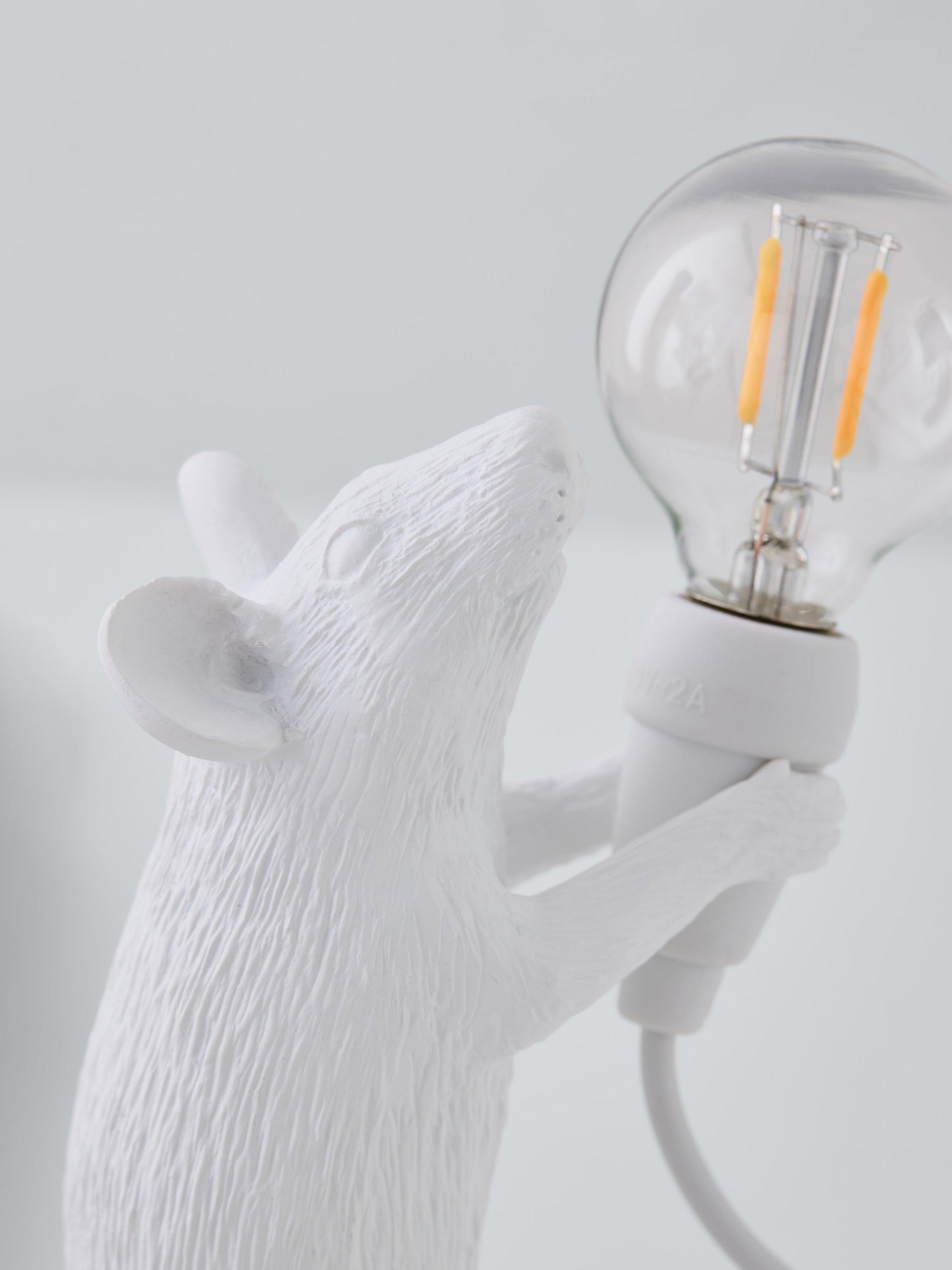 This cute Standing Mouse Table Lamp designed by Marcantonio for Seletti will lend a quirky, novelty feel to your living room space. Petite, and ideal for placing in small areas or shelves, its intricate design demonstrates Seletti's signature style, with a small bulb that creates a soft lighting solution. It's made from resin and painted in a gloss finish. This lamp is supplied with safe, cold-to-touch LED bulbs. For indoor use only.