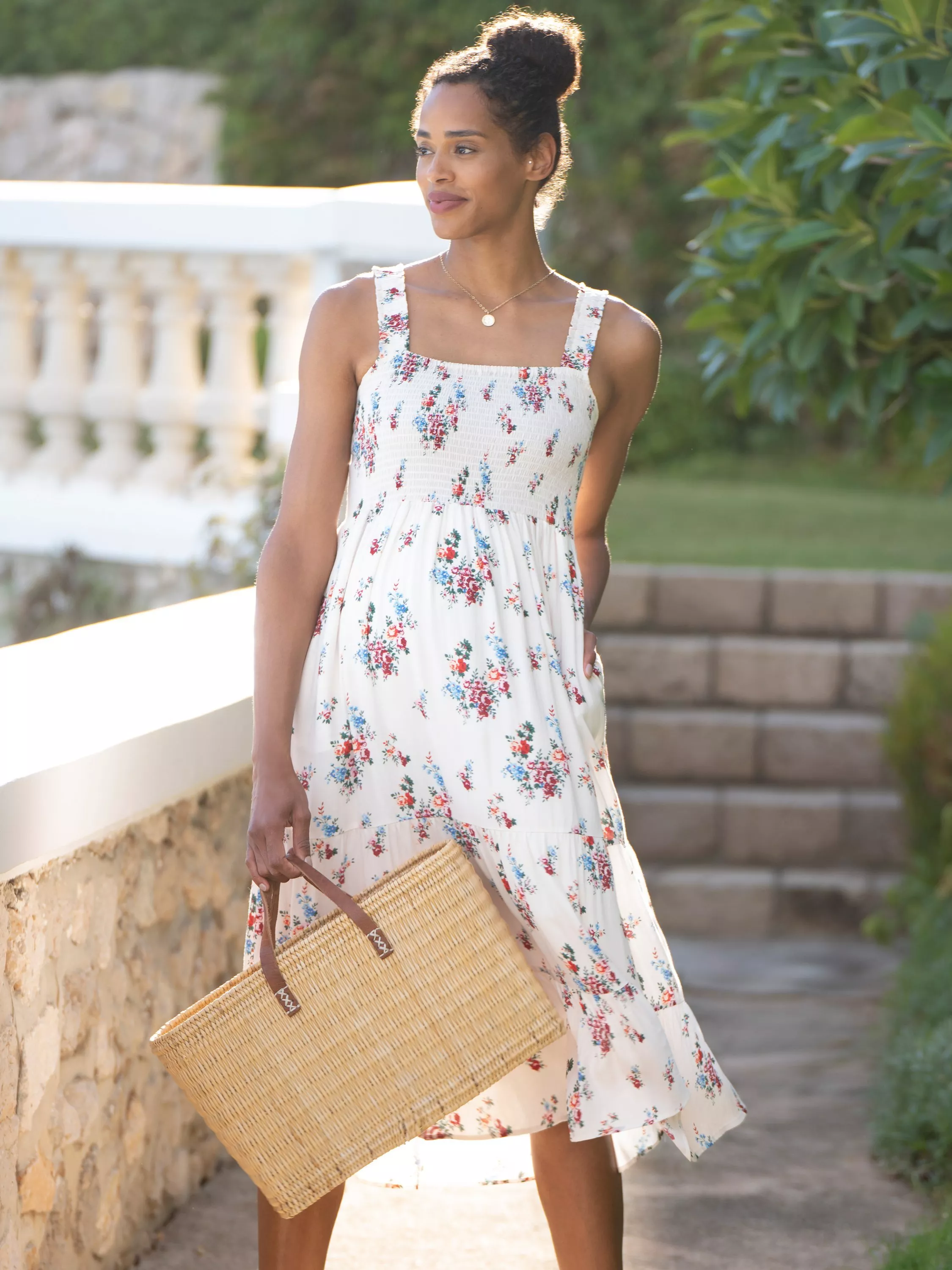 Meet your new favourite sundress, this Tiered Floral Midi Maternity Dress is a must-have for a summer pregnancy. Made with 100% breathable viscose, this midi style will keep you feeling cool throughout the hotter months. Designed with a shirred bodice panel and elastic straps which adjust and fit your body throughout pregnancy and beyond. A stunning floral print & handy pockets complete the look.