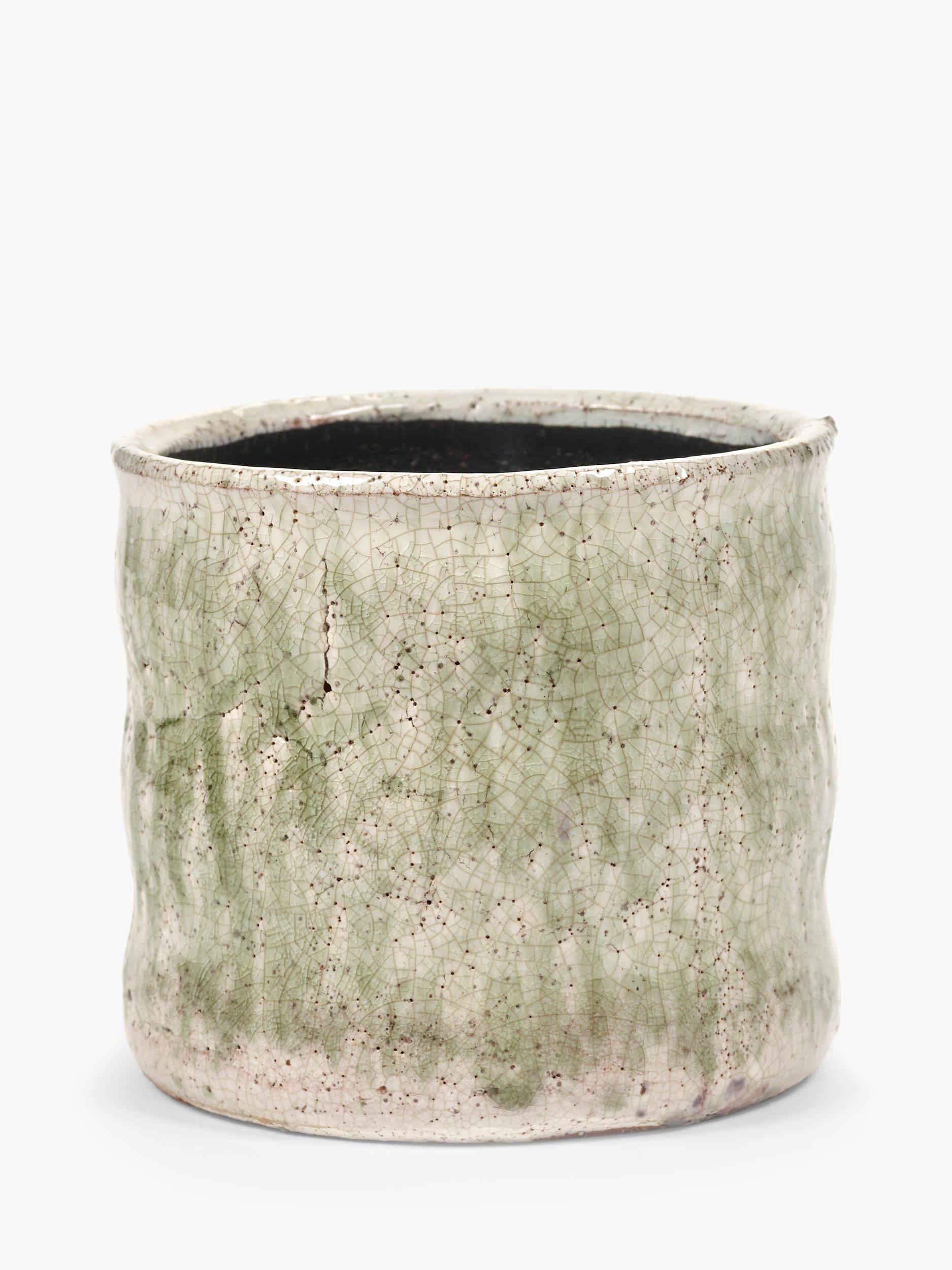 With a subtle colouring, the rough edges and craquelure on the Serax Flame pot give it a rustic look. The craquelure is the fine-lined pattern that looks like cracking from extreme drying or ageing and is achieved on this pot from the particular glaze that's been applied.