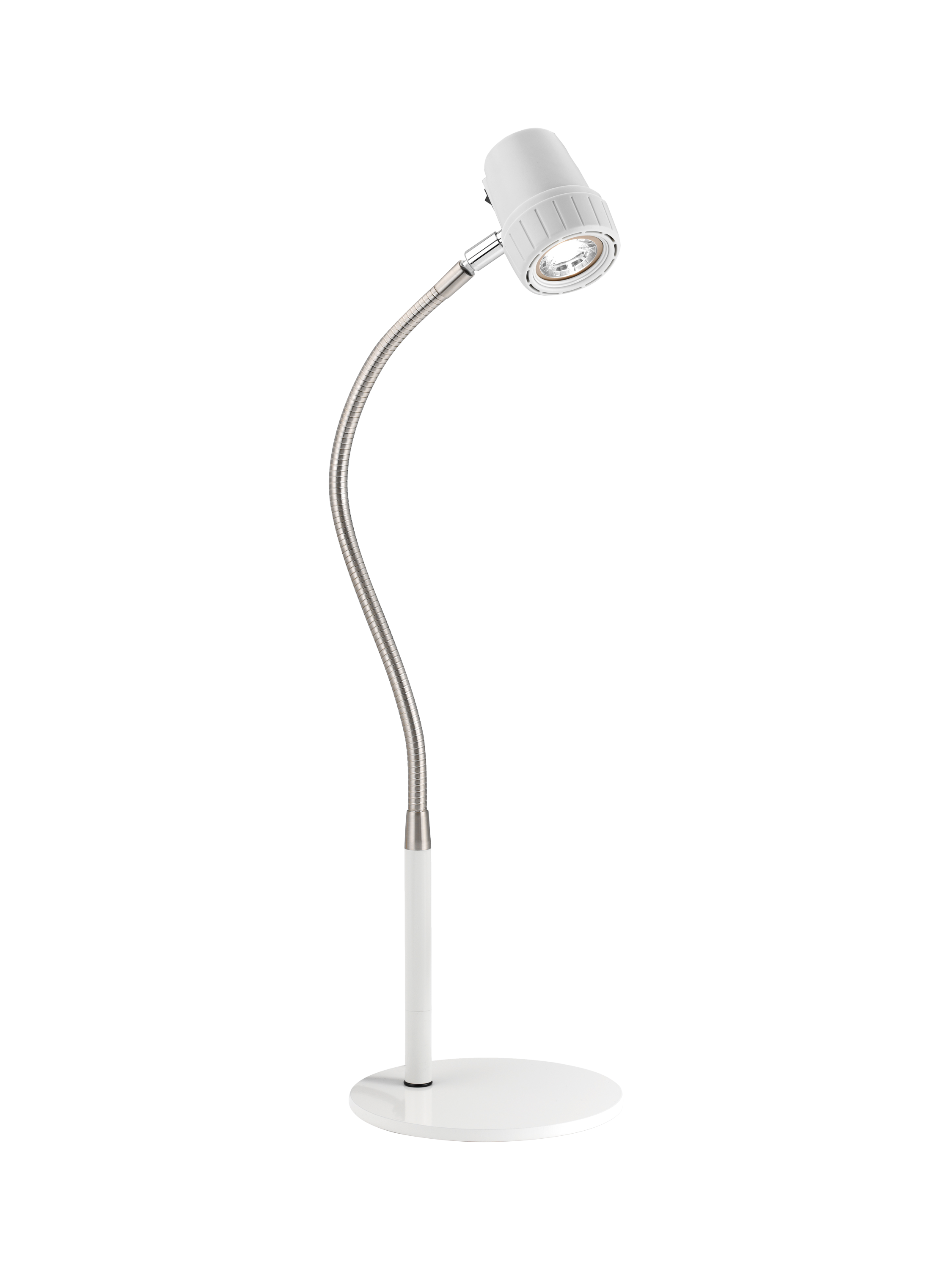 A single intuitive switch located to hand on the lamp head makes it easy to dim and precisely direct the beam. The lightweight base is flat to maximise useable space.