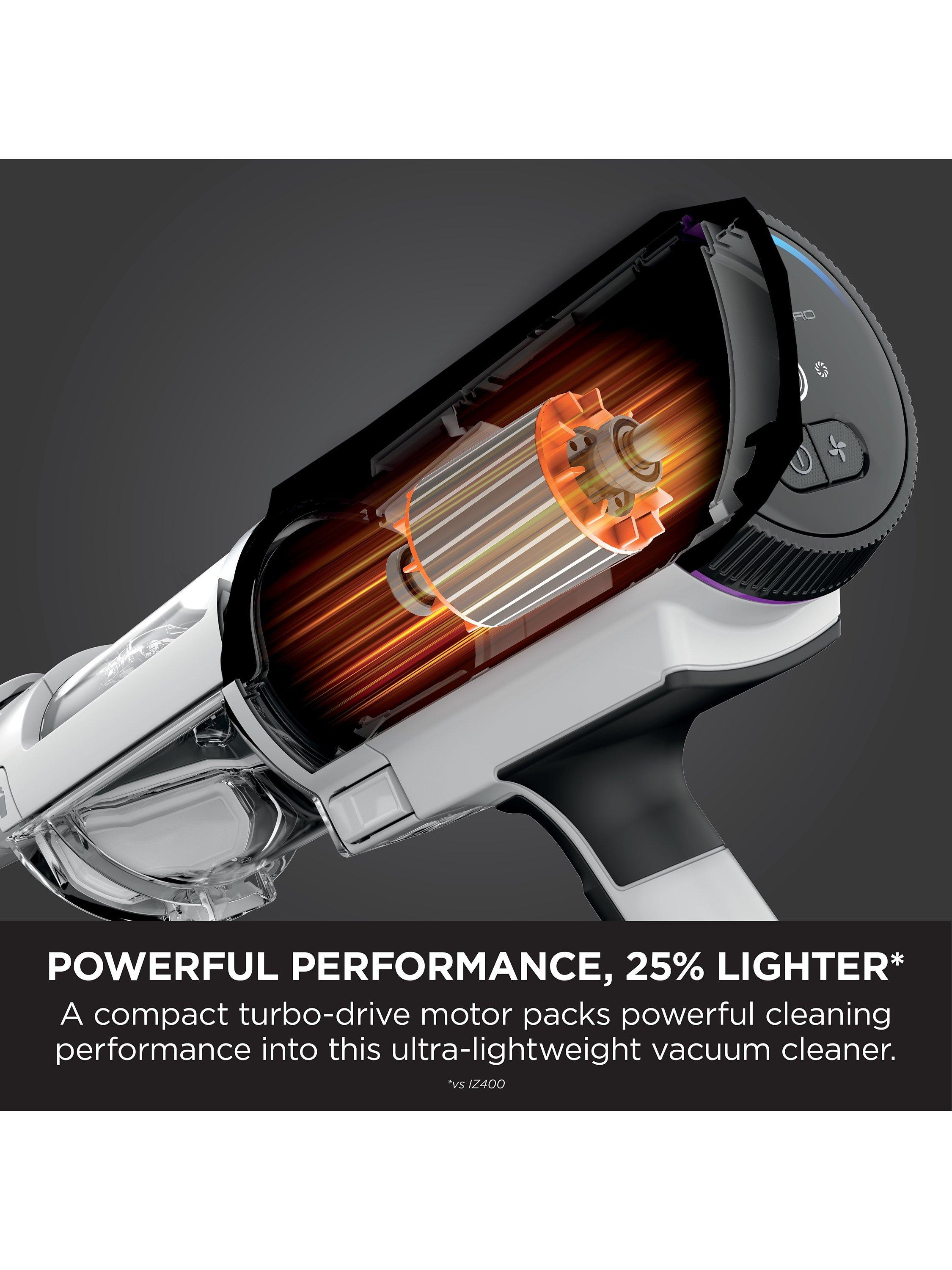 Powerful performance, 25% lighter*****: A compact turbo-drive motor packs powerful cleaning performance into this ultra-lightweight cordless vacuum. (*****Vs Shark IZ400)
