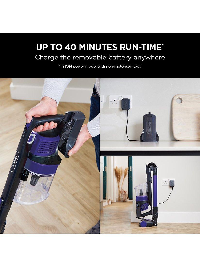 Shark's removable battery pack can be charged on or off the vacuum, wherever suits you. A battery light indicator lets you know how much charge is remaining. (*In ION power mode, with non-motorised tool.)
