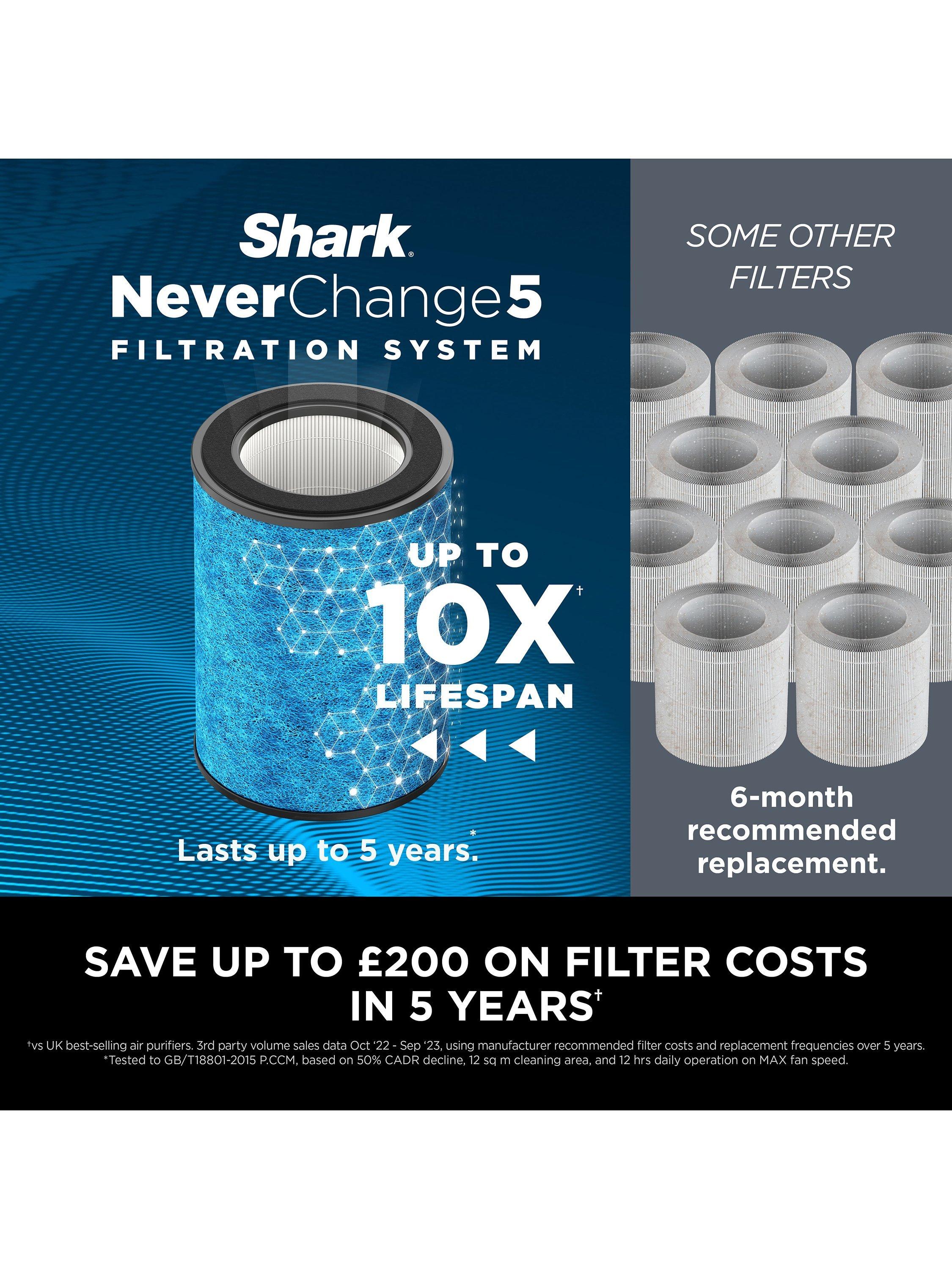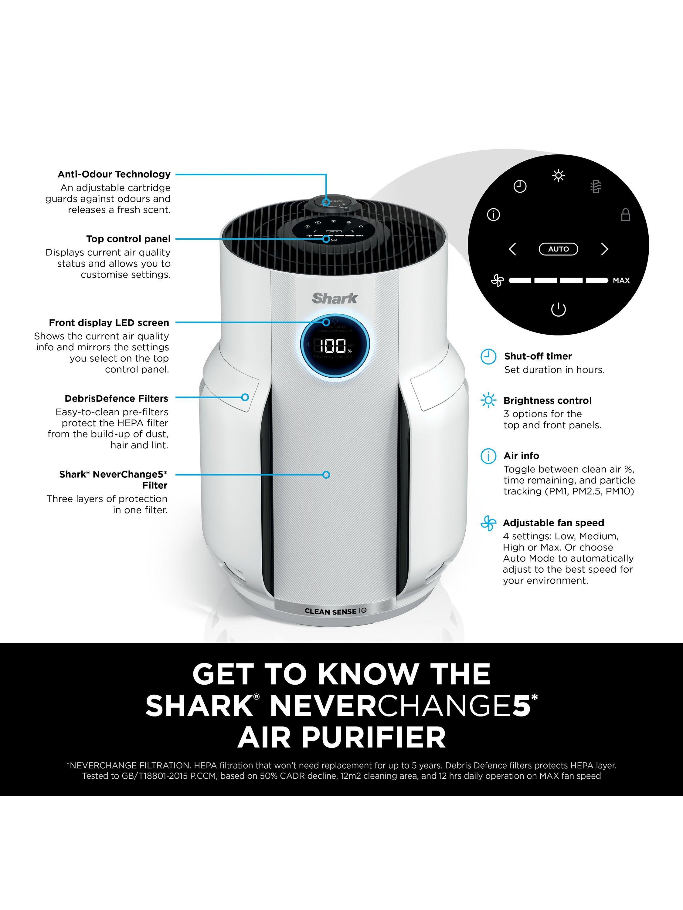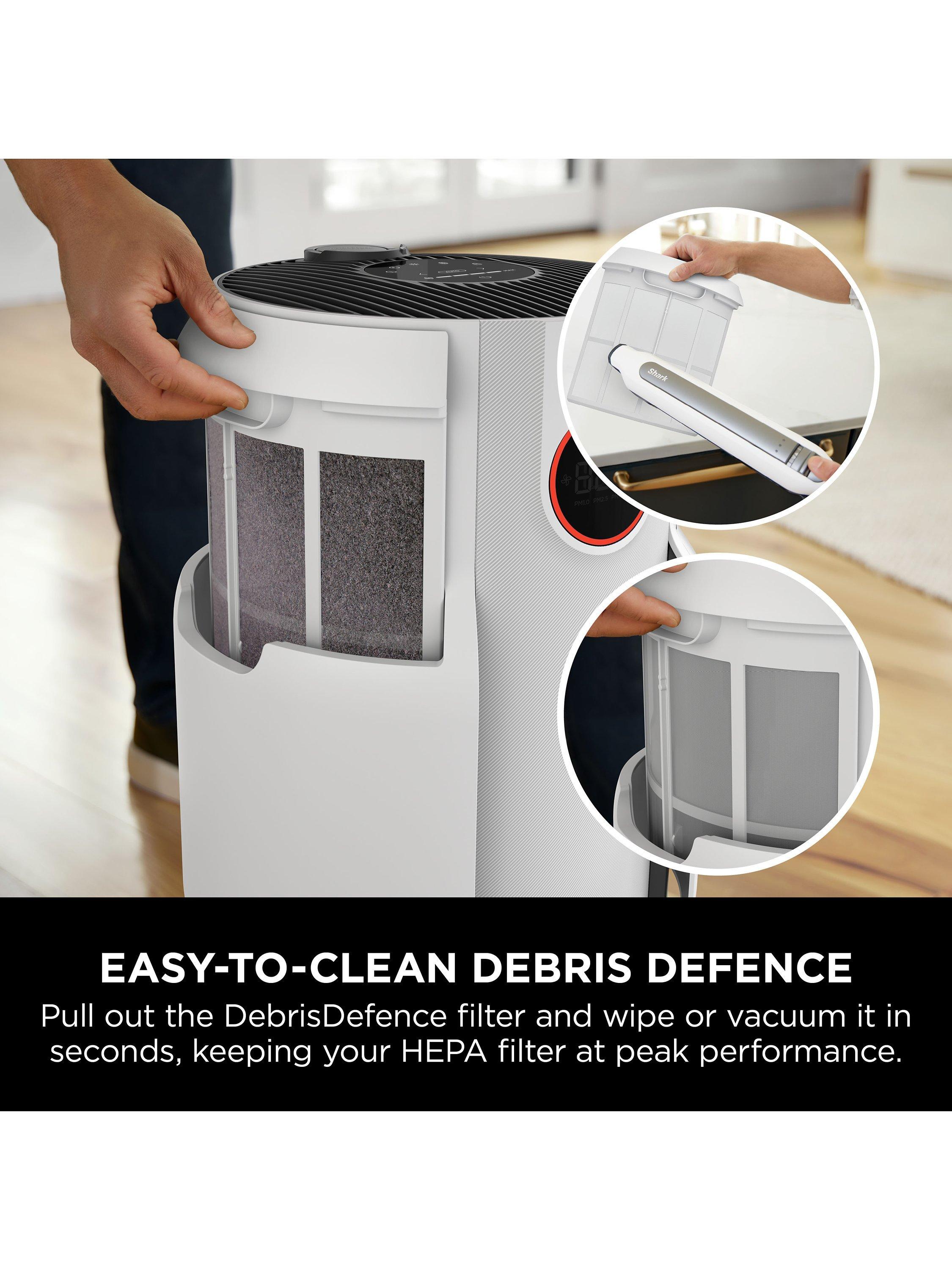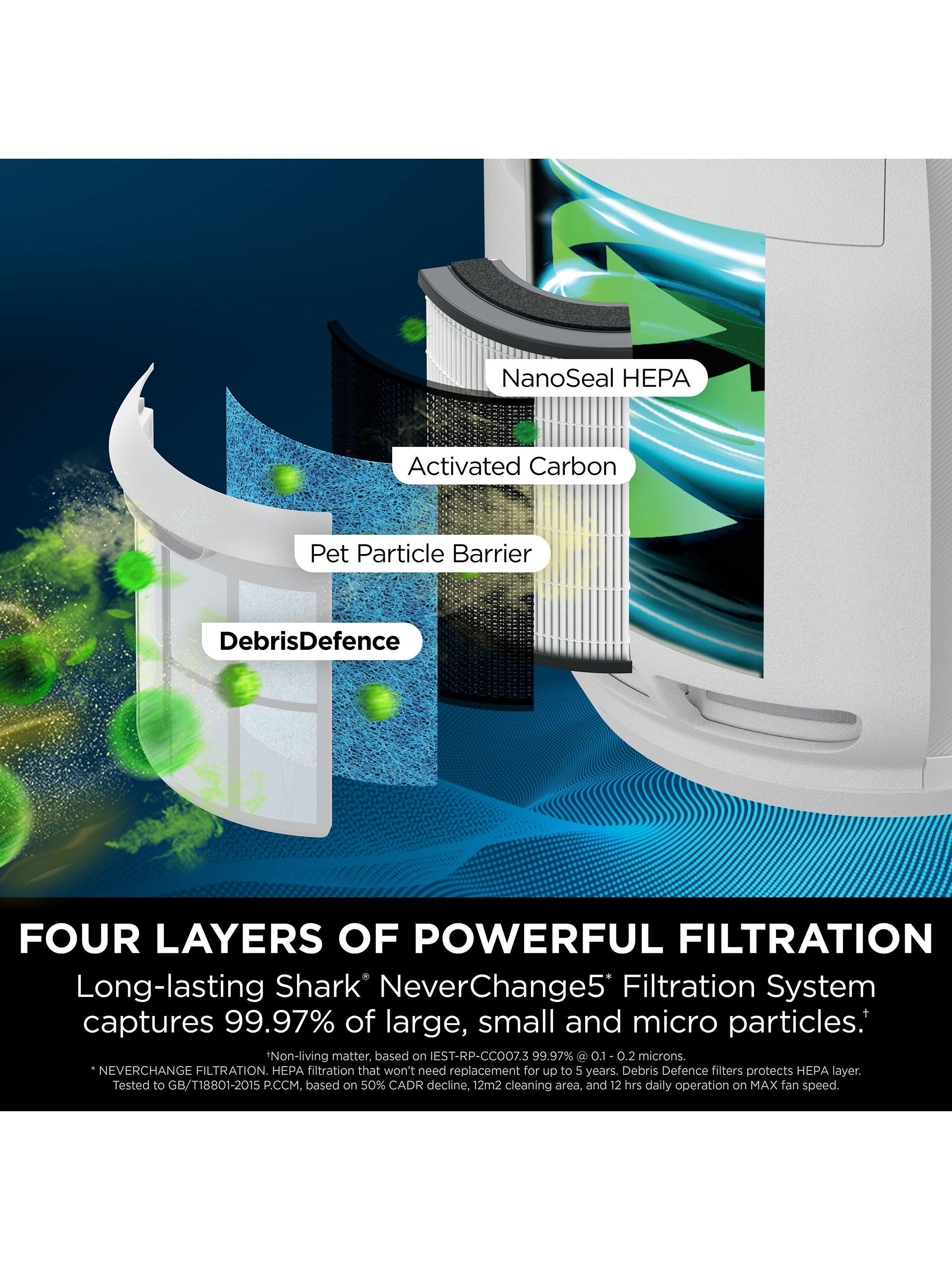 Shark's NeverChange Filtration System won’t need replacement for up to 5 years*, thanks to an easy-to-clean DebrisDefence pre-filter which protects the HEPA layer, prevents build-up of hair, dust or dander, and maximises performance. This powerful air purifier captures and traps 99.97% of allergens and irritants, including micro, small and large particles to effectively remove dust, pollen, pet dander, allergens and micropollutants***.