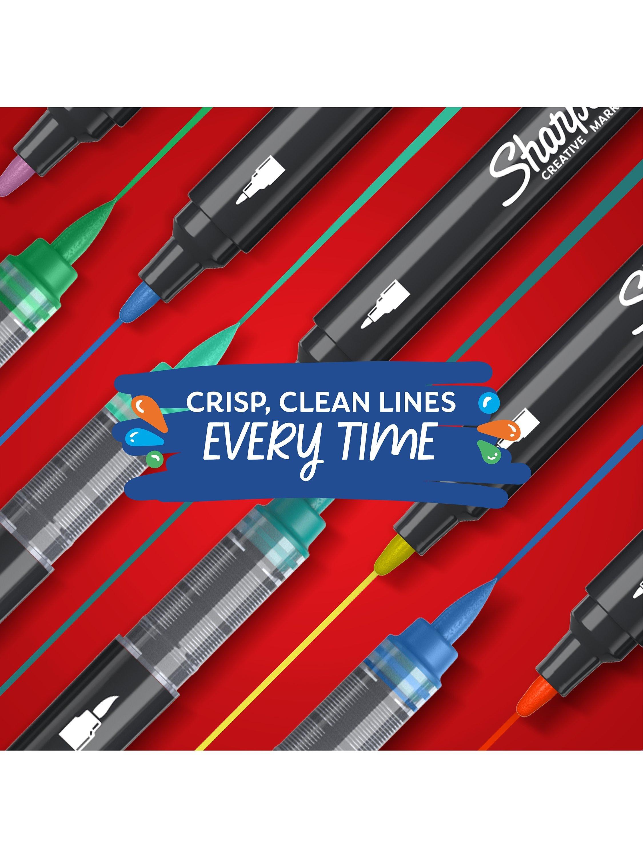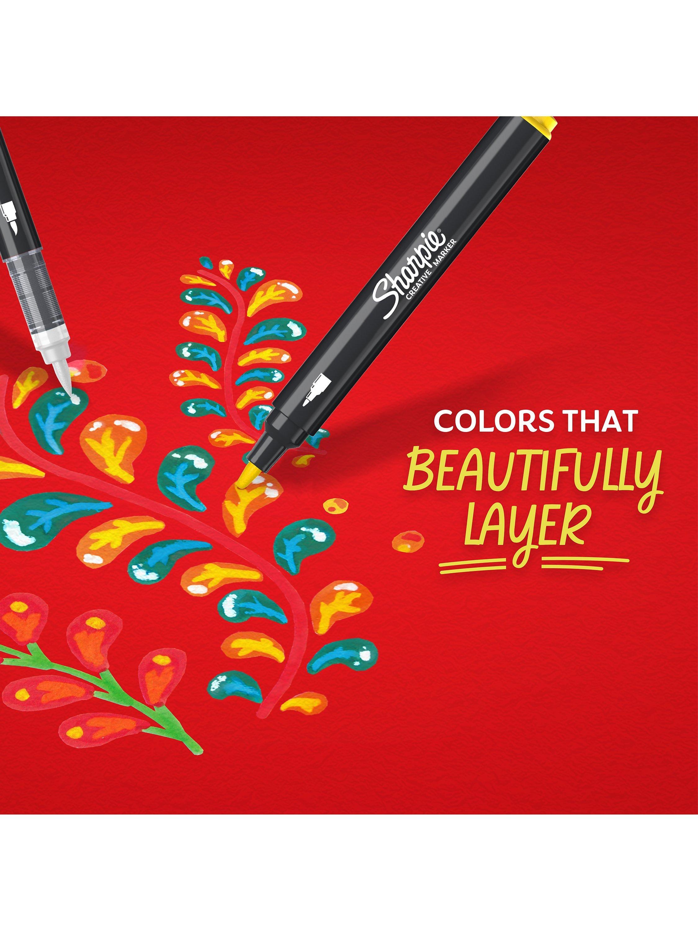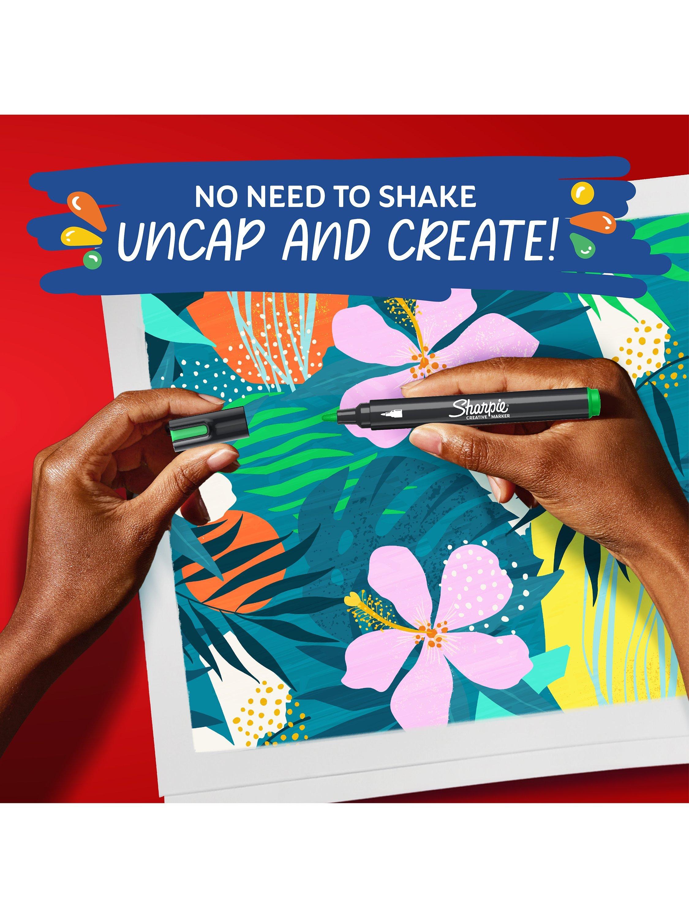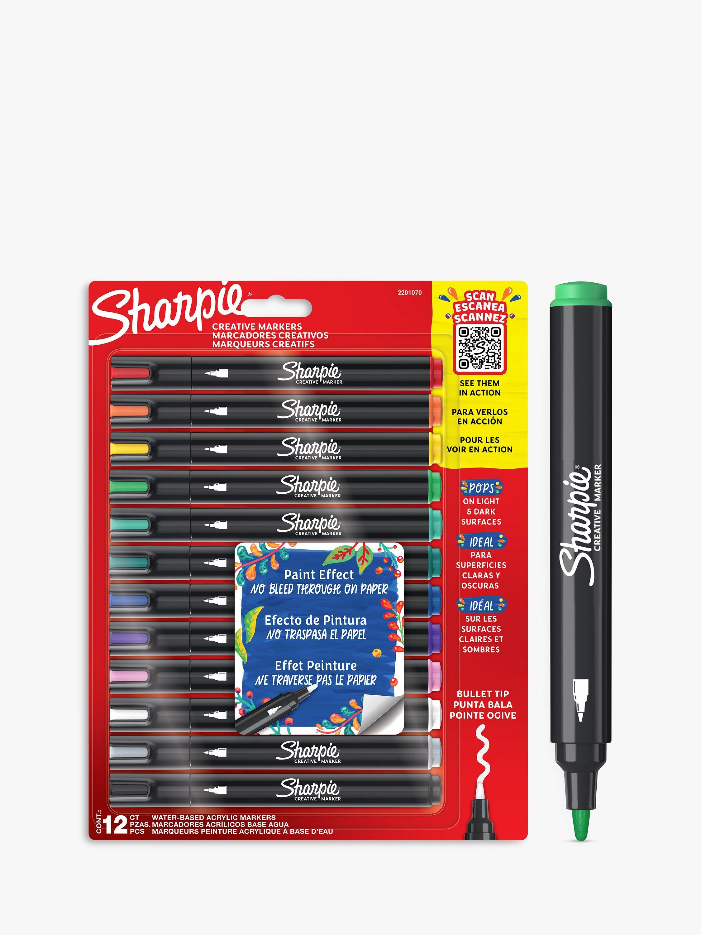 Bring your artistic vision to life with Sharpie Creative Markers! These acrylic markers feature stunning paint-like ink that glides across the page with the control of a marker. The water-based ink won't bleed through, so your work stays clean. These bright colour paint pens create vibrant marks on light and dark surfaces and boldly mark on paper, metal, wood, ceramic, glass, rock and canvas. The colours layer beautifully to add dimension to your work. What's more, there's no need to shake with these bullet tip markers - simply uncap and create!