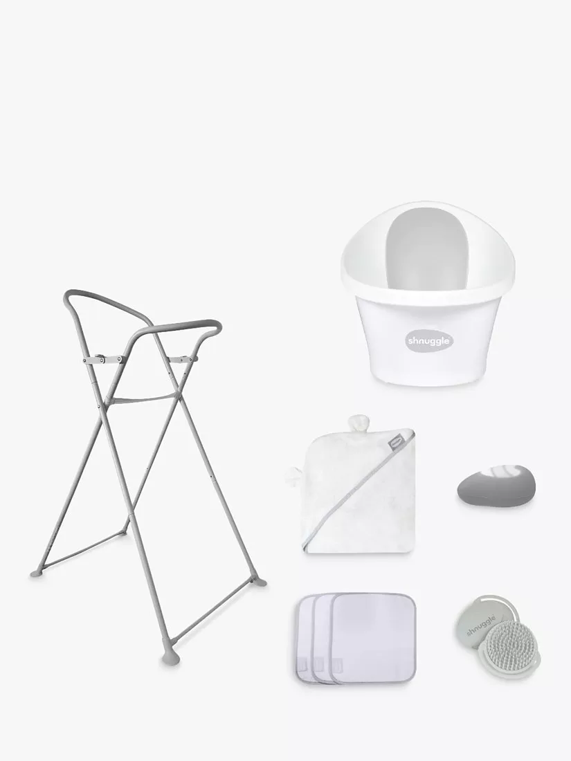 The bundle contains a Shnuggle baby bath and bath stand, 3 washcloths, a wearable towel, a baby brush and a Pebbly thermometer.