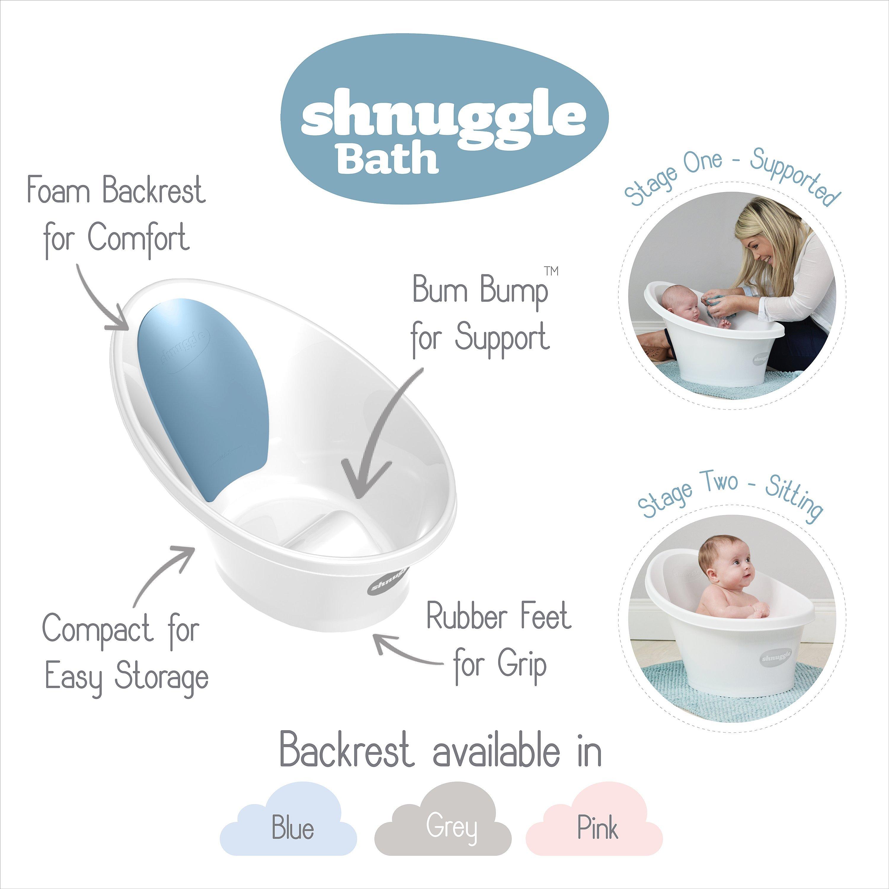 Thoughtfully designed by parents, the Shnuggle cosy baby bath comes in a clever shape that fully supports new born babies and allows older babies to sit up and play.