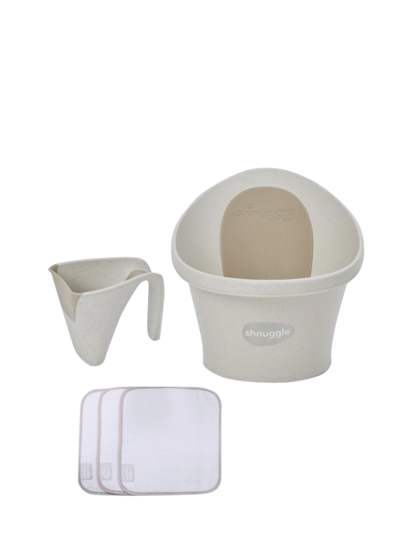 Shnuggle's baby bath features a supportive bum bump and a warm foam backrest to keep baby comfortable and secure. It's accompanied by the Washy Rinsing Jug - designed for tear-free hair rinsing, it offers a soft, controlled pour and an easy-grip handle, making bath time calmer and more enjoyable for both parent and baby. The bundle also includes soft bamboo reusable wash cloths, naturally gentle, absorbent, and ideal for delicate skin.