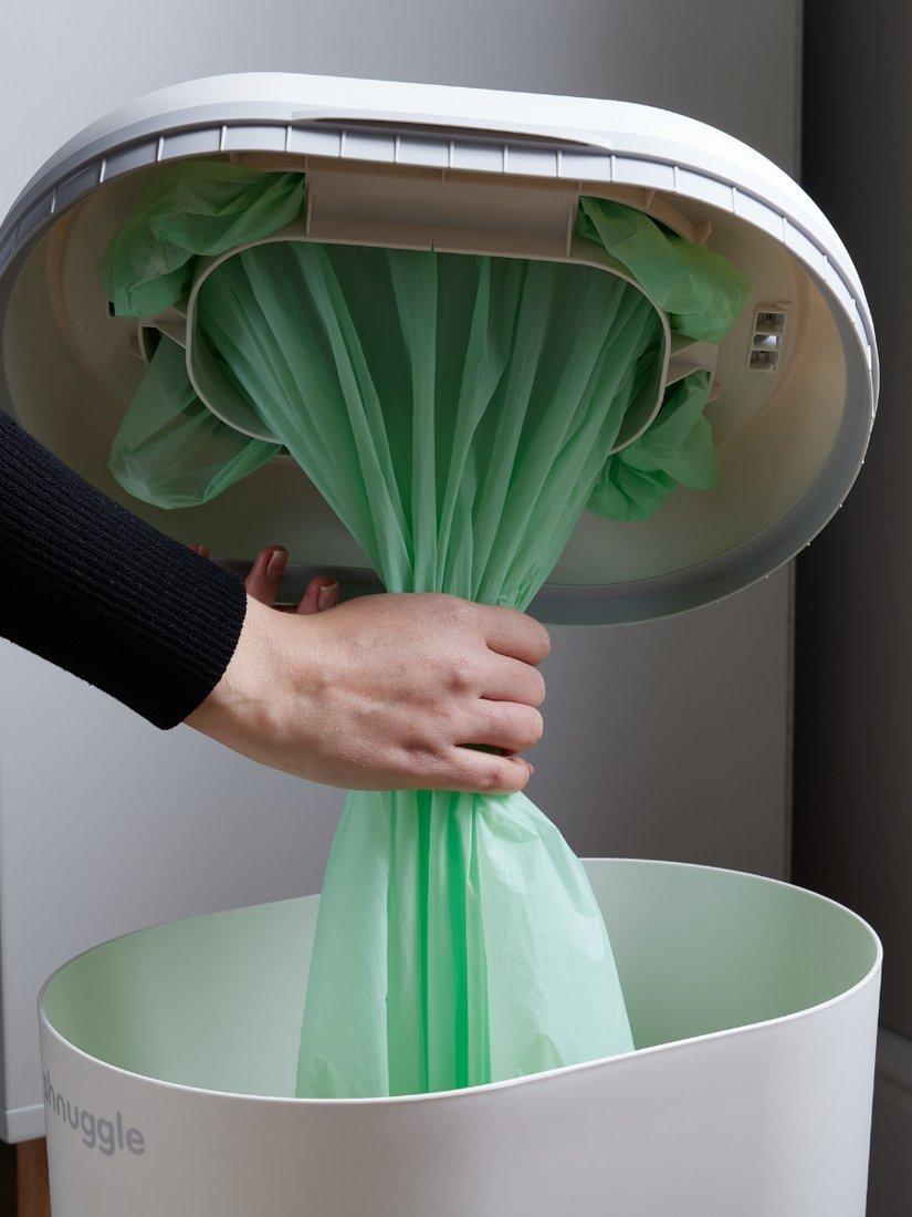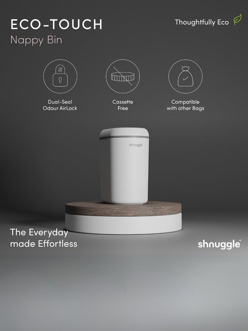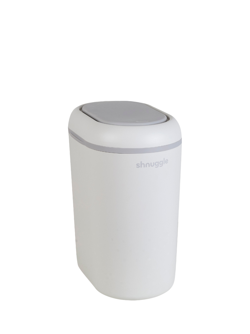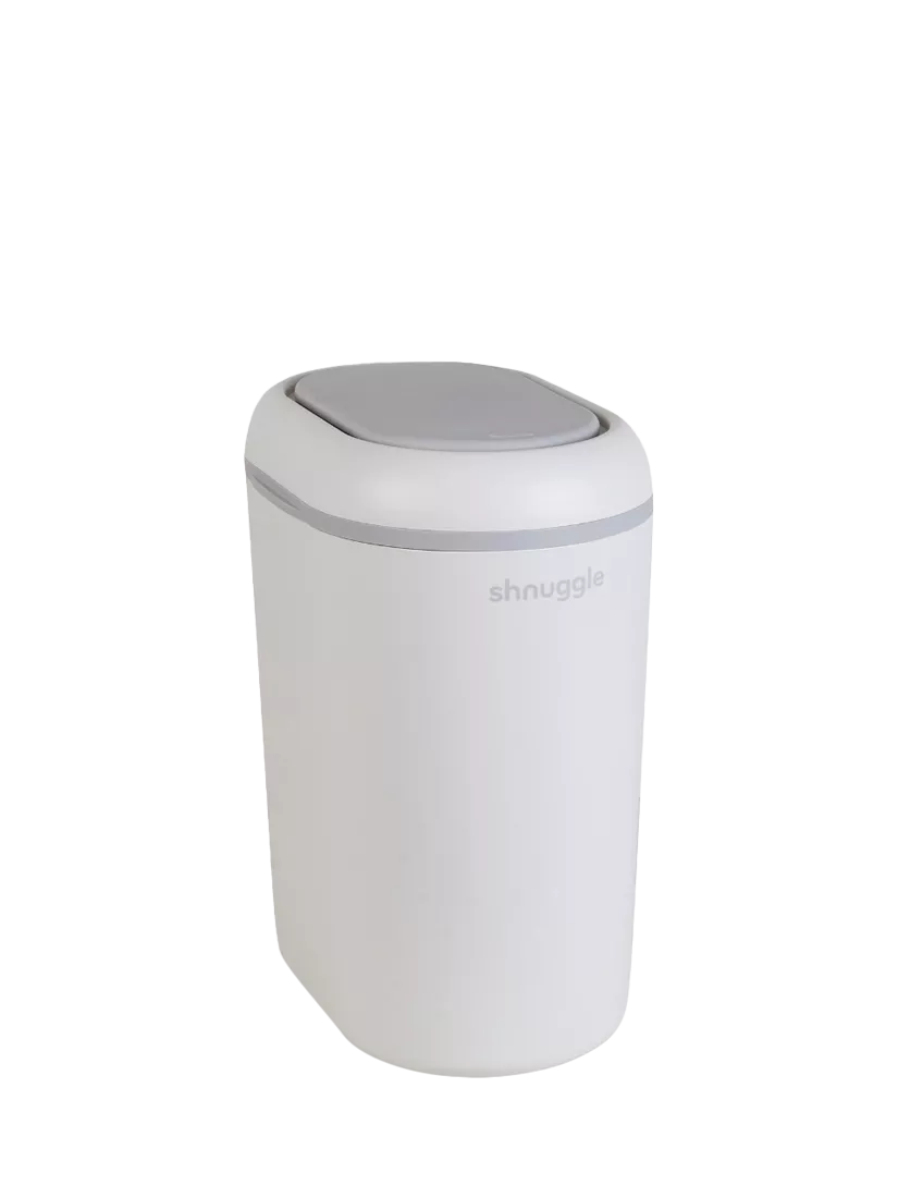 The Shnuggle Nappy Bin is thoughtfully designed to make nappy changes simpler and more hygienic with its one-handed 'drop and go' operation, dual-seal odour airlock, and cassette-free system.