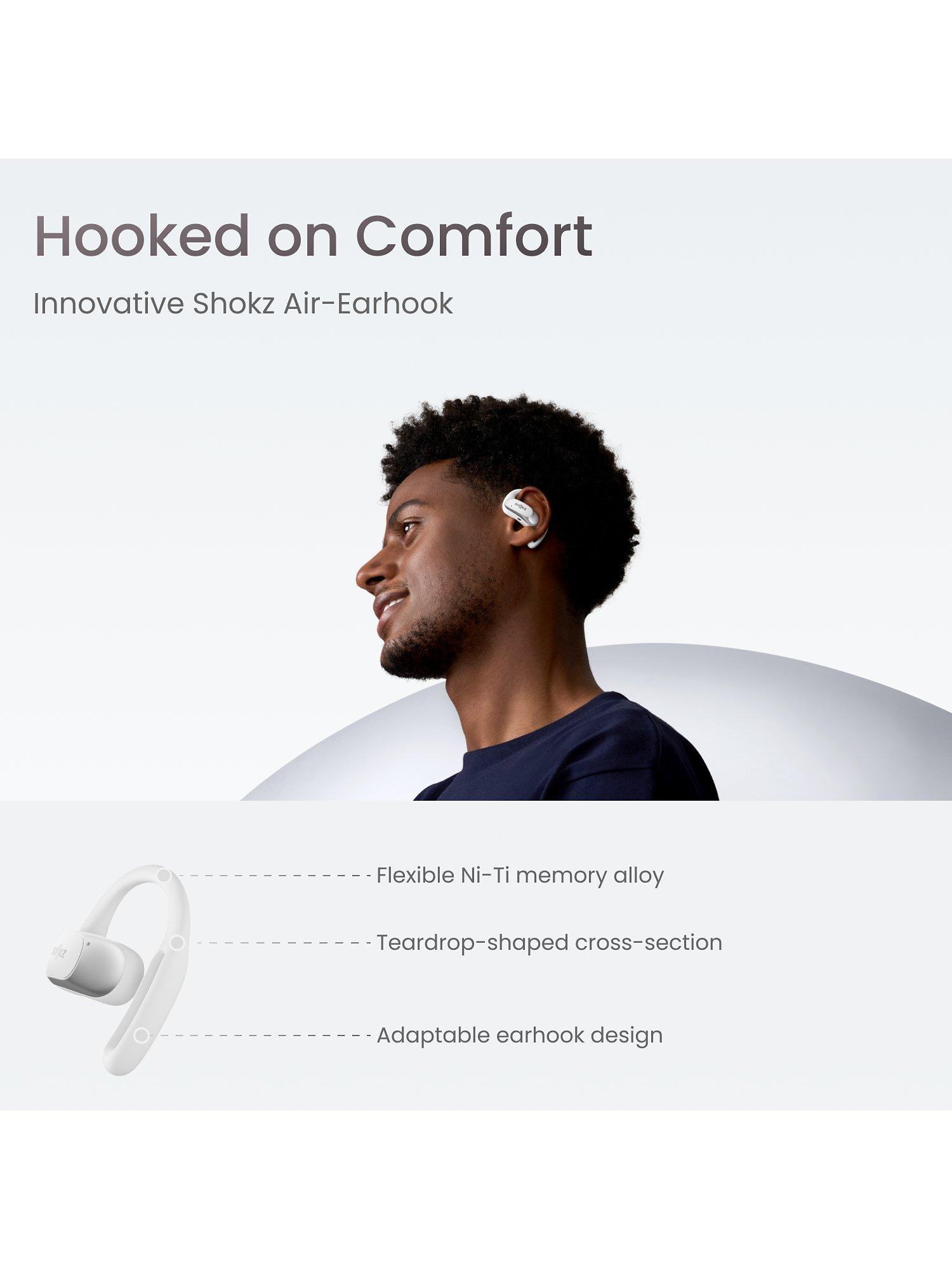 Flexible Ni-Ti memory alloy, Wobble-free, Snug Fit-Featuring an ultra-fine 0.75mm flexible Ni-Ti memory alloy with a soft silicone finish, Shokz’ Air-Earhook design keeps your earbuds snugly in place.