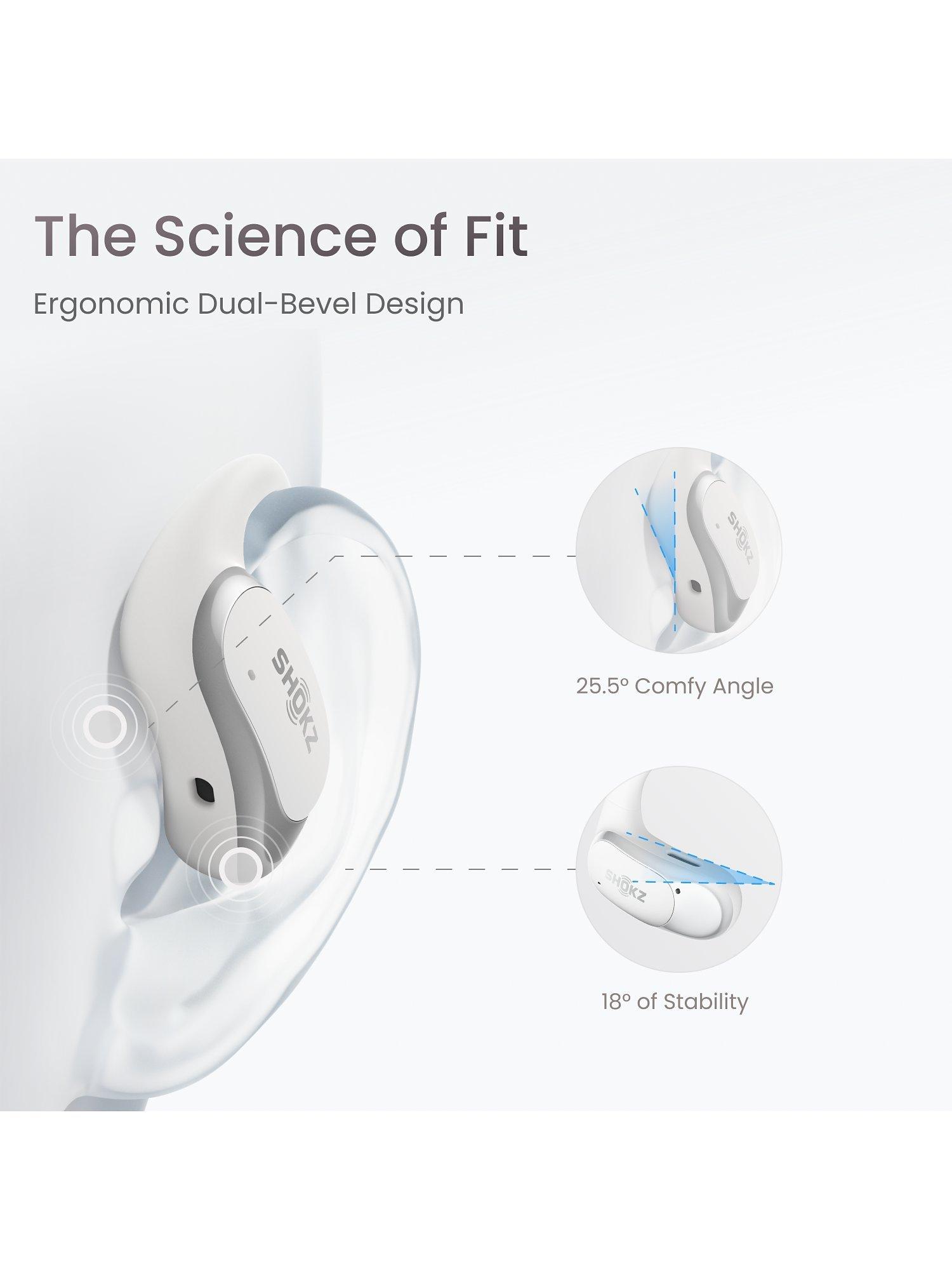 25.5° comfy angle: by shifting the centre of gravity closer to the ear, Shokz have created a lighter-than-air feel that practically defies movement. It's not just comfort; it's peace of mind. And the end of the driver housing features an 18° bevel design, allowing the earbuds to fit deeper in your ear for a comfortably snug fit.