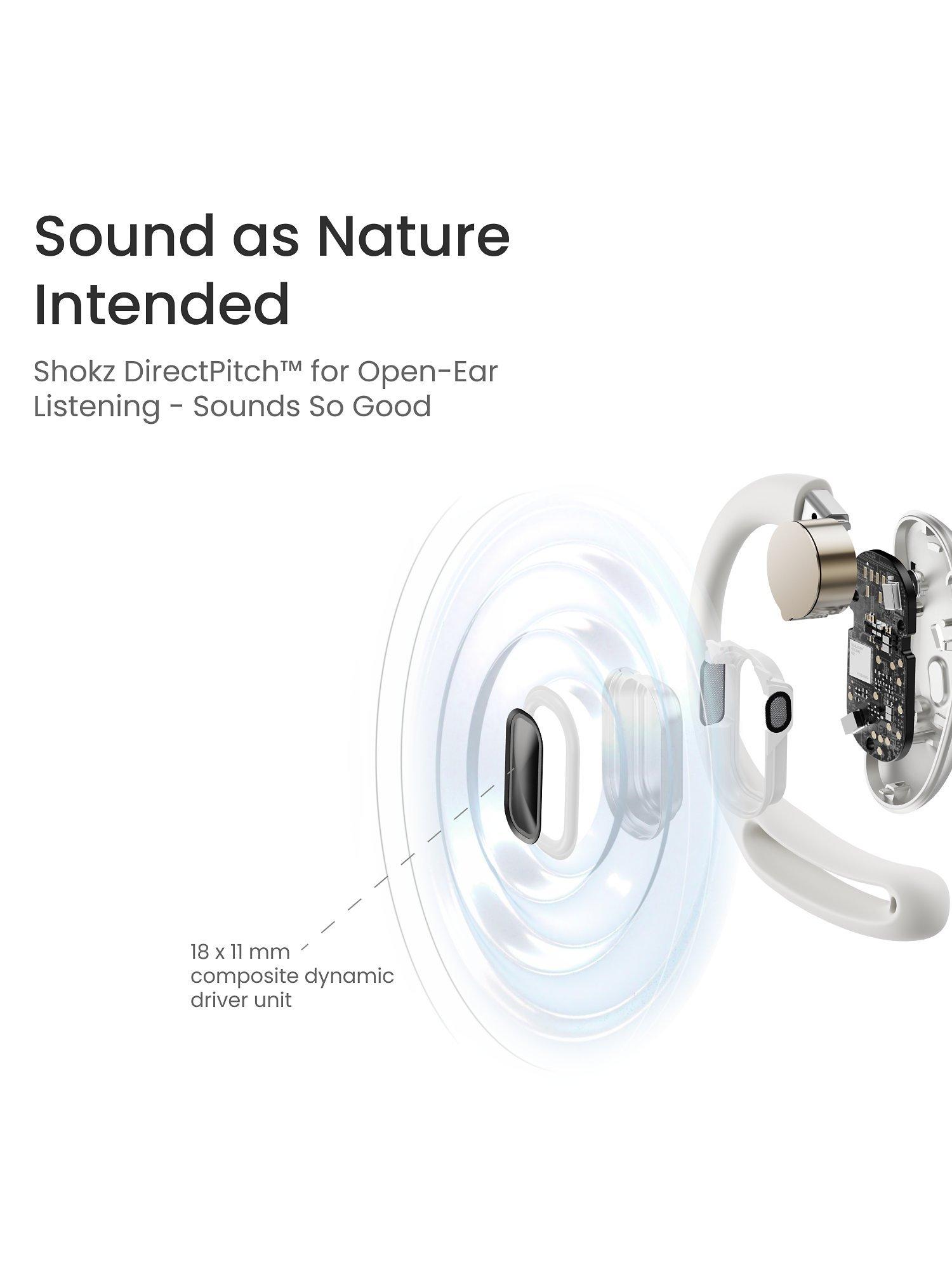 Packed with a custom dynamic driver unit, the OpenFit Air delivers sound akin to a 16mm prototype, while the composite diaphragm ensures balanced highs, mids, and bass. Paired with built-in Dynamic Range Control (DRC), EQ levels adapt in real-time, hitting all the right notes. Personalise your sound even more with the Shokz App and four preset EQ modes.