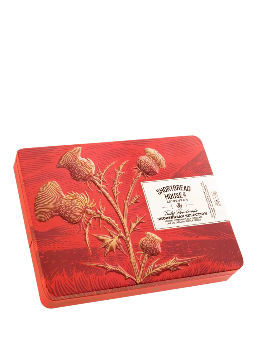A 500g shortbread selection tin containing 4 flavours of handmade shortbread, all of which have won Great Taste Awards. The flavours are; original recipe, stem ginger, chocolate & orange and rich dark chocolate chip. With a total of 32 finger biscuits, it's perfect for tea or as a gift.