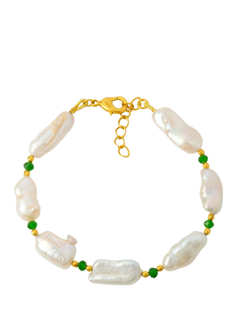 The Bondi bracelet is made of a uniquely sourced long shaped pearl. It sits next to tiny emerald coloured crystals. Crafted to the perfect length, this style is perfect for stacking with other styles, as well as worn on it's own as pictured. A truly special piece to treasure for time to come.