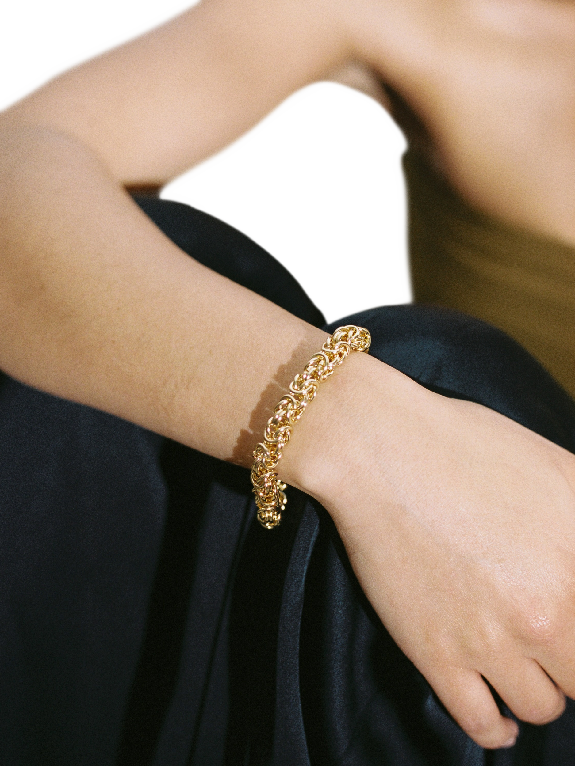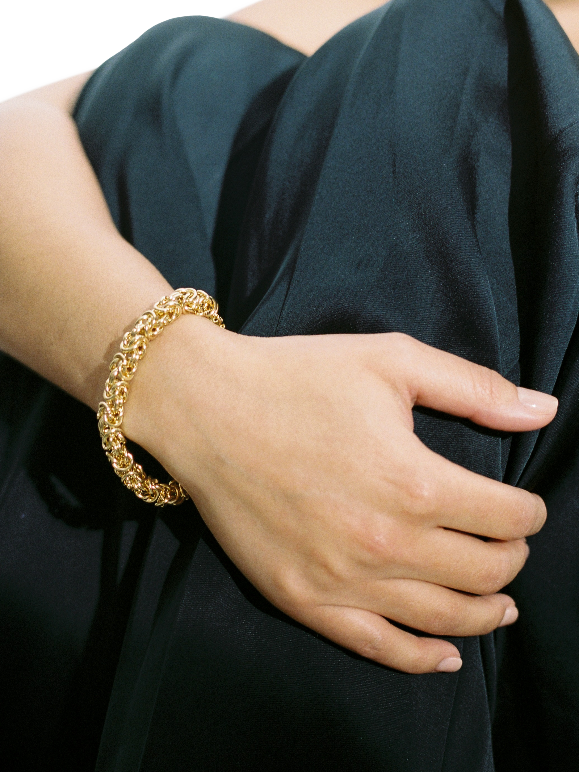 The Cinque Bracelet is an elegant layered chain, multi-faceted to make this exquisite unique statement shape. This piece is of a medium size thickness.