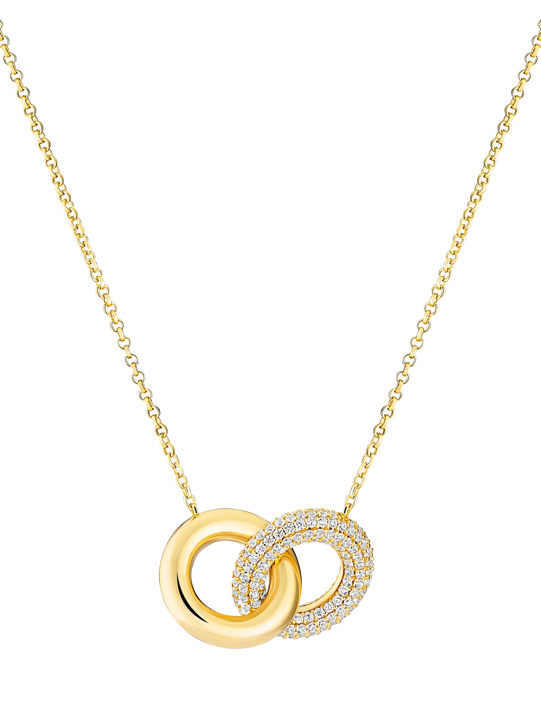 This pendant necklace features two rings; one is beautifully polished and the other is set with cubic zirconia gemstones.