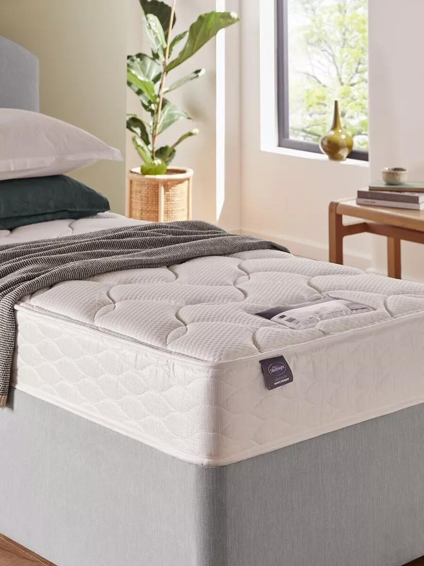 Silentnight's Collection quilted, slate grey divan base comes with a regular tension Recover mattress. A headboard is not included.