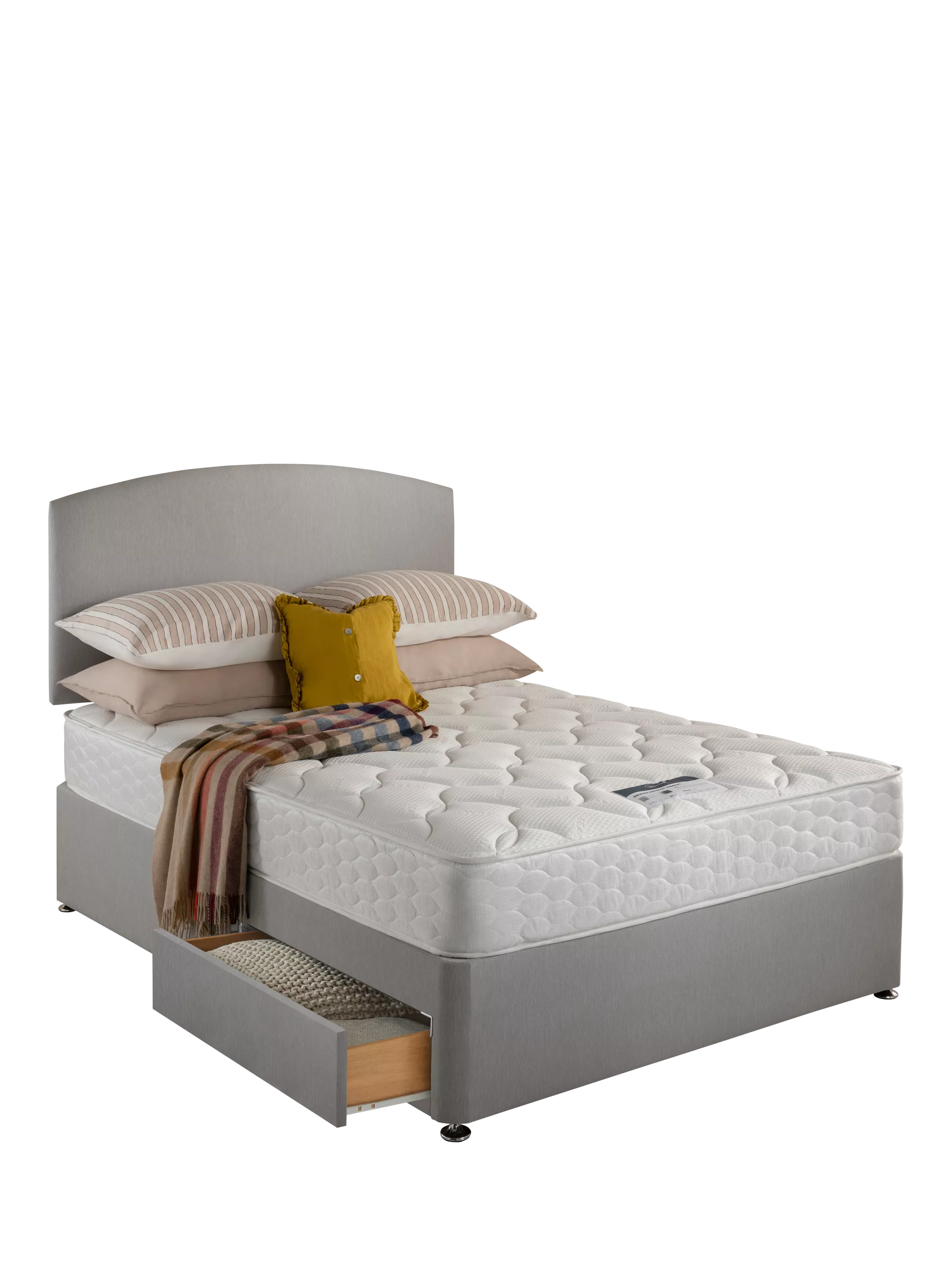 This divan set includes Silentnight's extra firm tension Sleep Retreat Support mattress and their non-sprung, upholstered divan base with two drawers - headboard not included. The mattress is well-suited for sleepers that get hot during the night as it has a comfort layer made from EcoComfort breathable fibres that aid airflow for a cooler night's sleep. It also has a support system that provides zoned pressure relief where you need it most, especially to your spine and hips for improved posture and alignment. Its unique, no-roll spring design means that you can move without disturbing your partner, and it has a soft, smooth cover that contains SEAQUAL™ technology. SEAQUAL™ works with NGOs, fishermen, authorities and local communities to help clean our oceans. Marine waste from beaches, oceans, rivers and estuaries is collected by clean-up programs. It’s then sorted into different material types and the plastic portion is transformed into Upcycled Marine Plastic, which has been used to produce the high-quality cover found on this mattress.