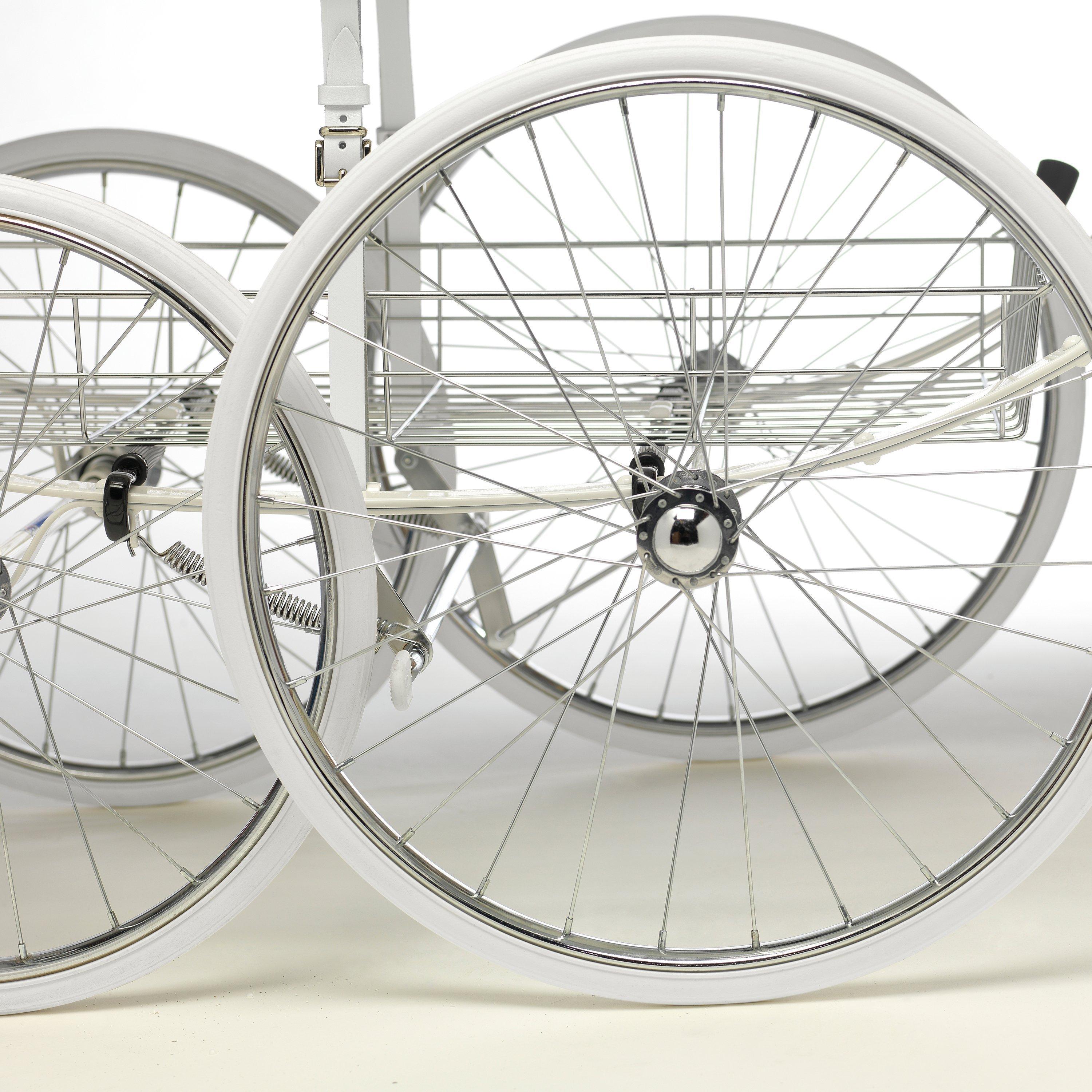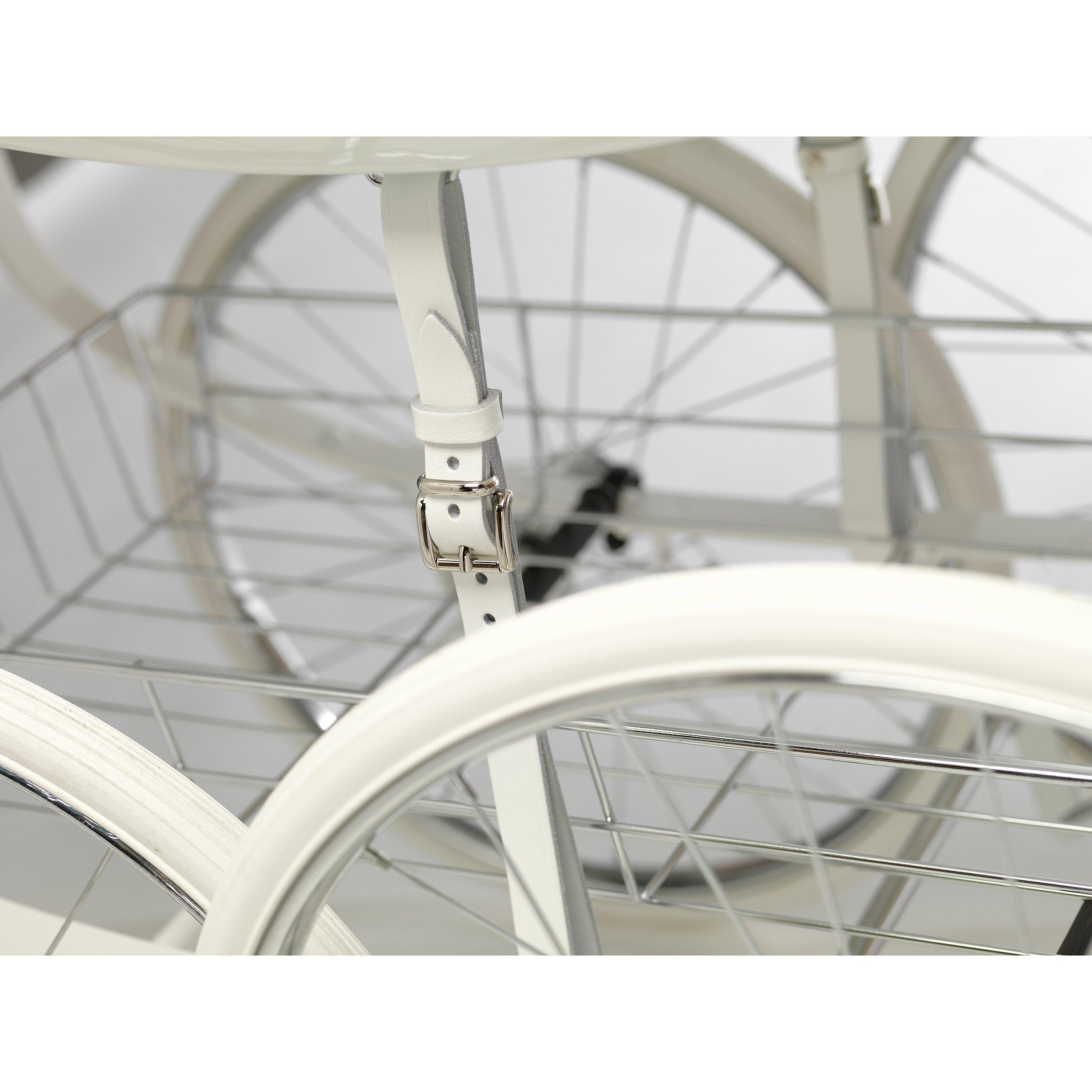 The steel bodied pram rides upon a C-spring chassis which is cushioned with leather suspension straps and chrome spoked wheels, ensuring the pram glides along the ground seamlessly.