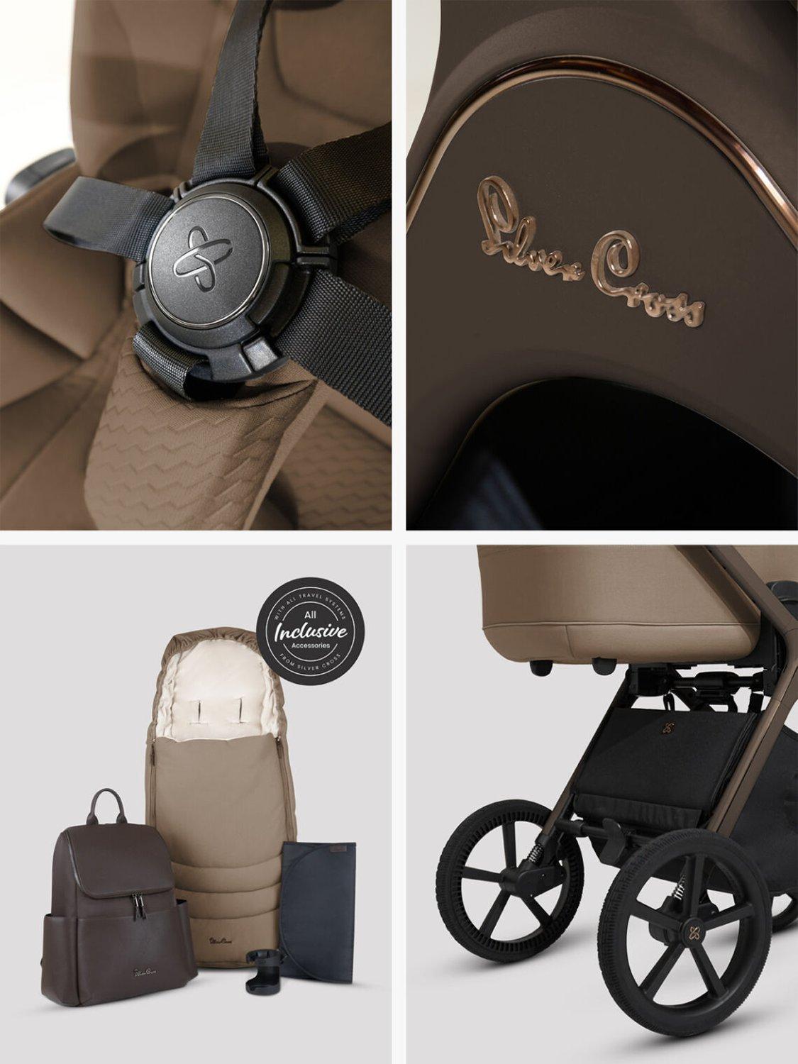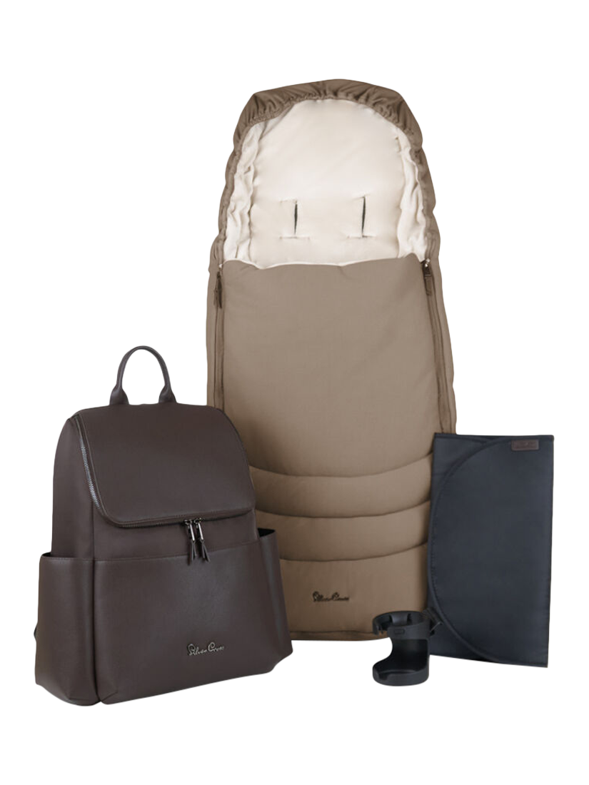 Included in the accessory bundle is the Cove pushchair seat and chassis, bamboo-lined carrycot, vegan leather changing backpack, footmuff, cup holder, universal car seat adaptors and rain cover.