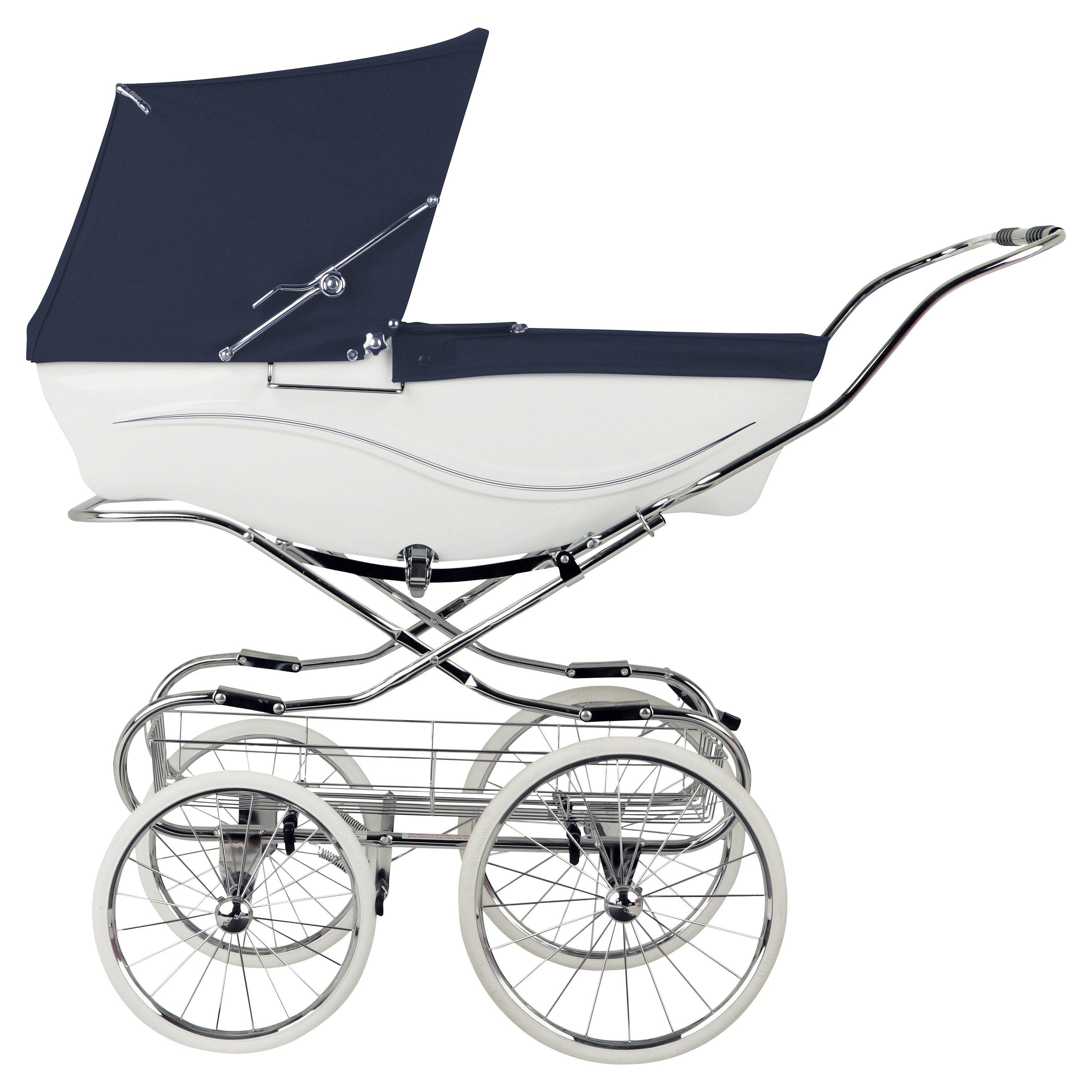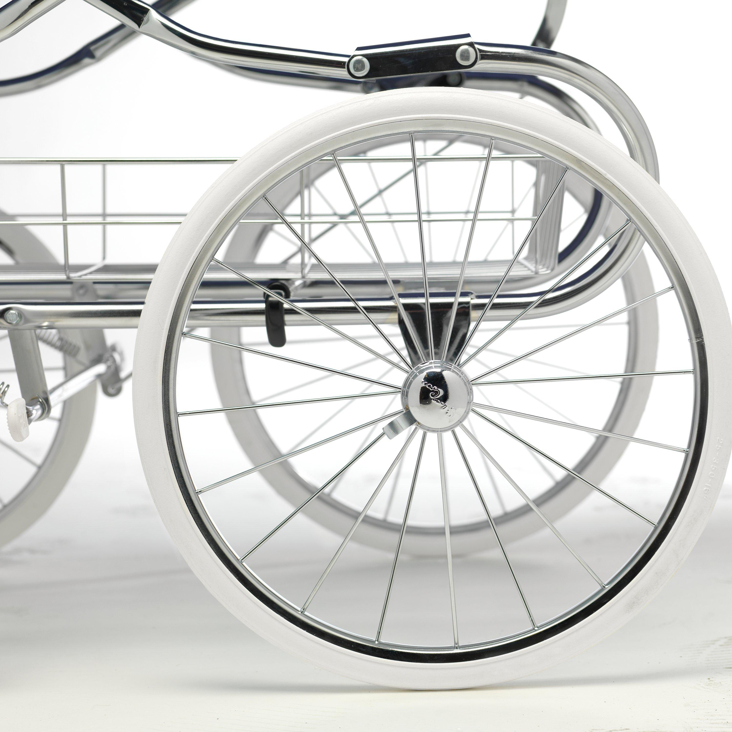 The Kensington pram is expertly handmade in Yorkshire and comes complete with a fully sprung chassis for a smooth ride, hand painted body and hand stitched fabrics. The Kensington includes a reclining hood, matching protective apron and a chrome shopping basket.