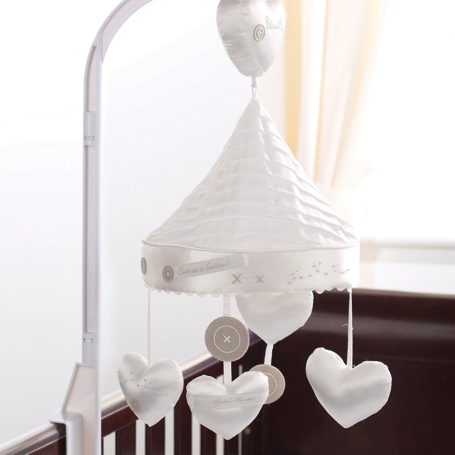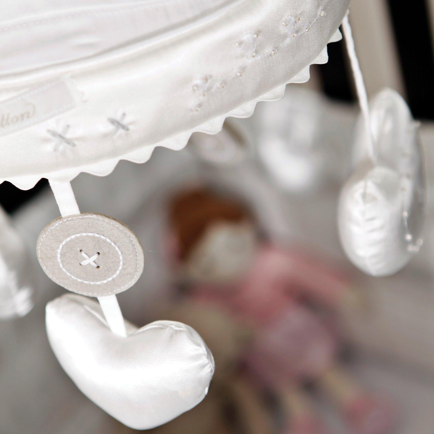 With a pleated cotton canopy and soft padded shapes, this mobile has a handmade feel with heart embroidery and sequin details. The 200 thread count sateen cotton is soft and silky. Easy to assemble. Suitable from birth.